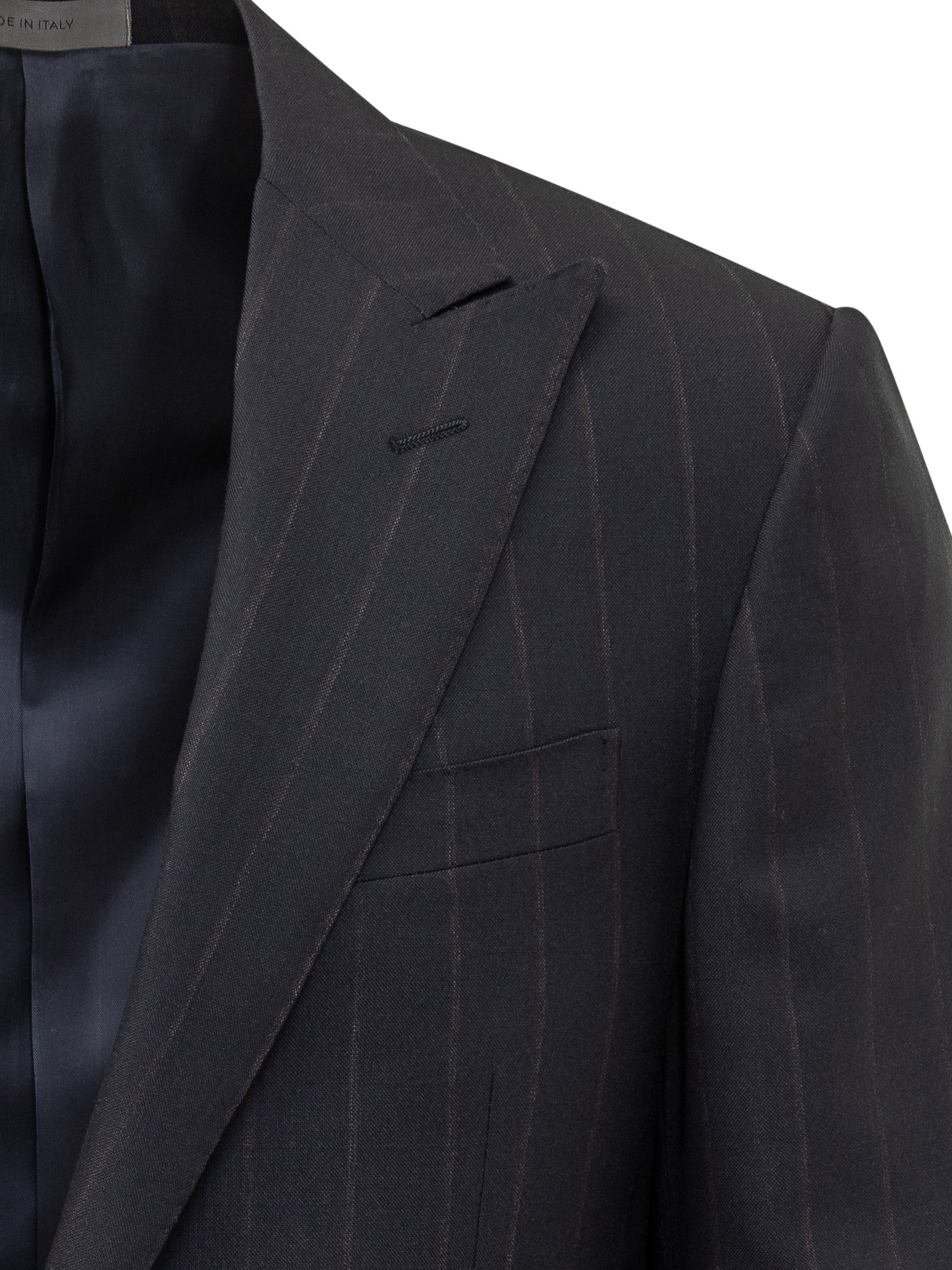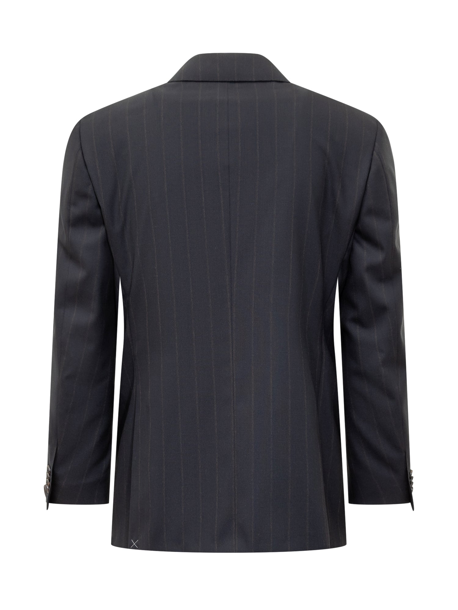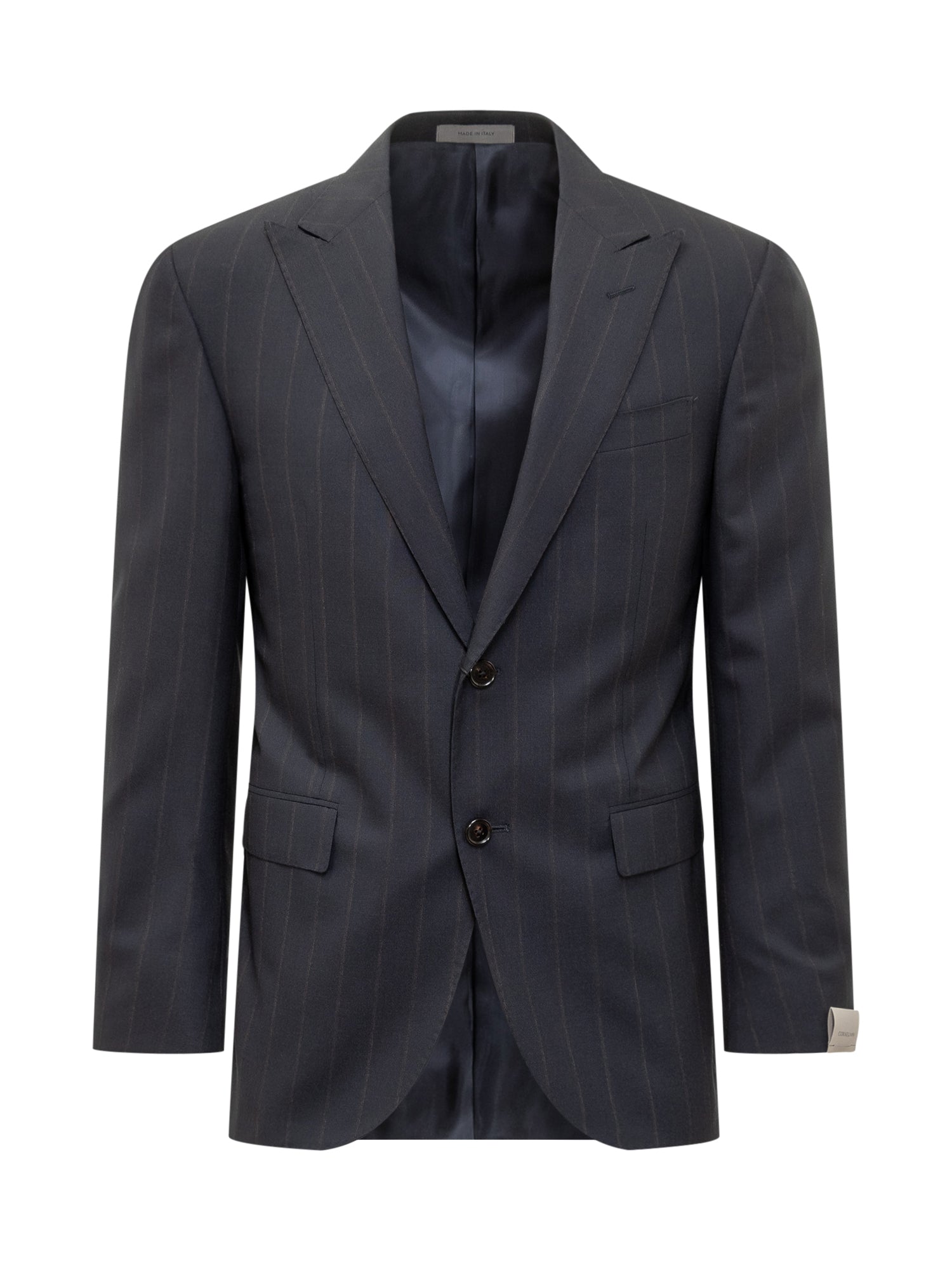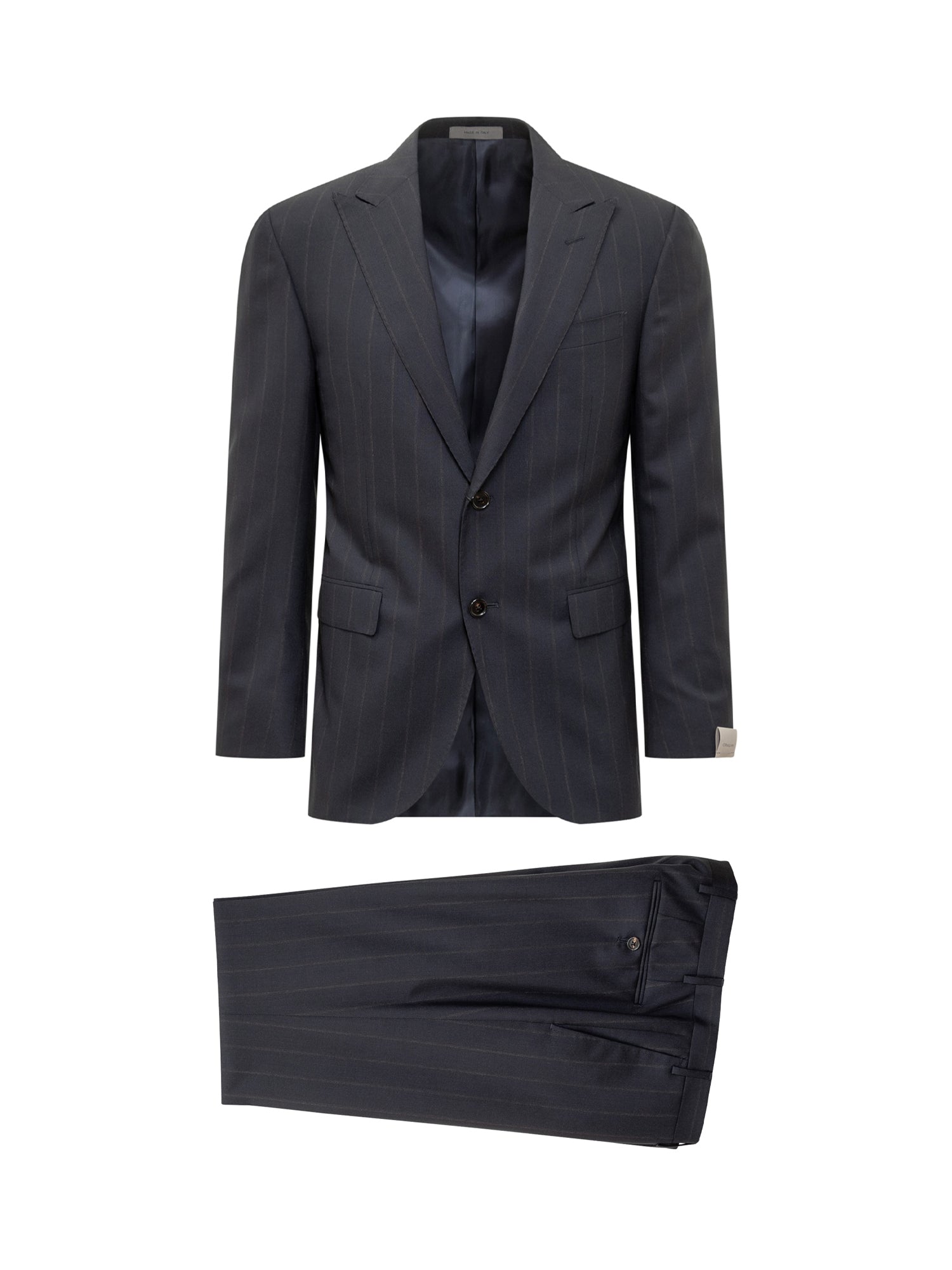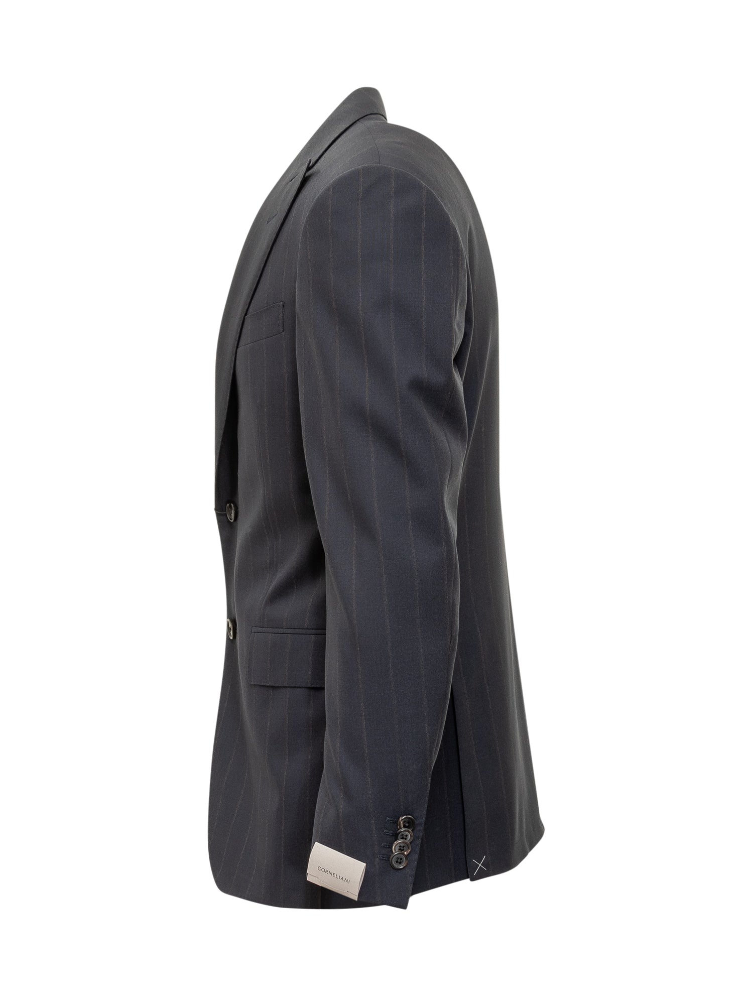 Abito Corneliani in lana blu con raffinato motivo gessato. Giacca a due bottoni con revers classici e pantaloni coordinati.