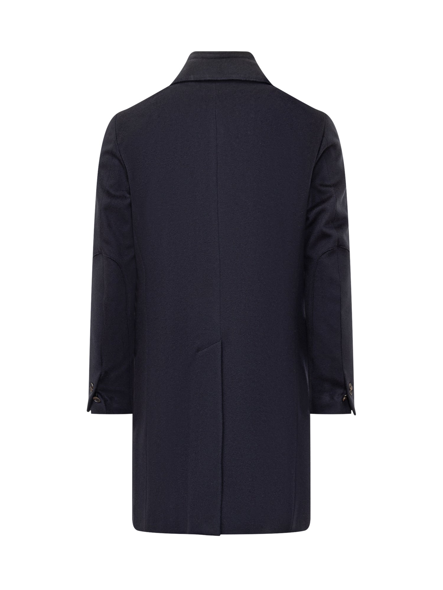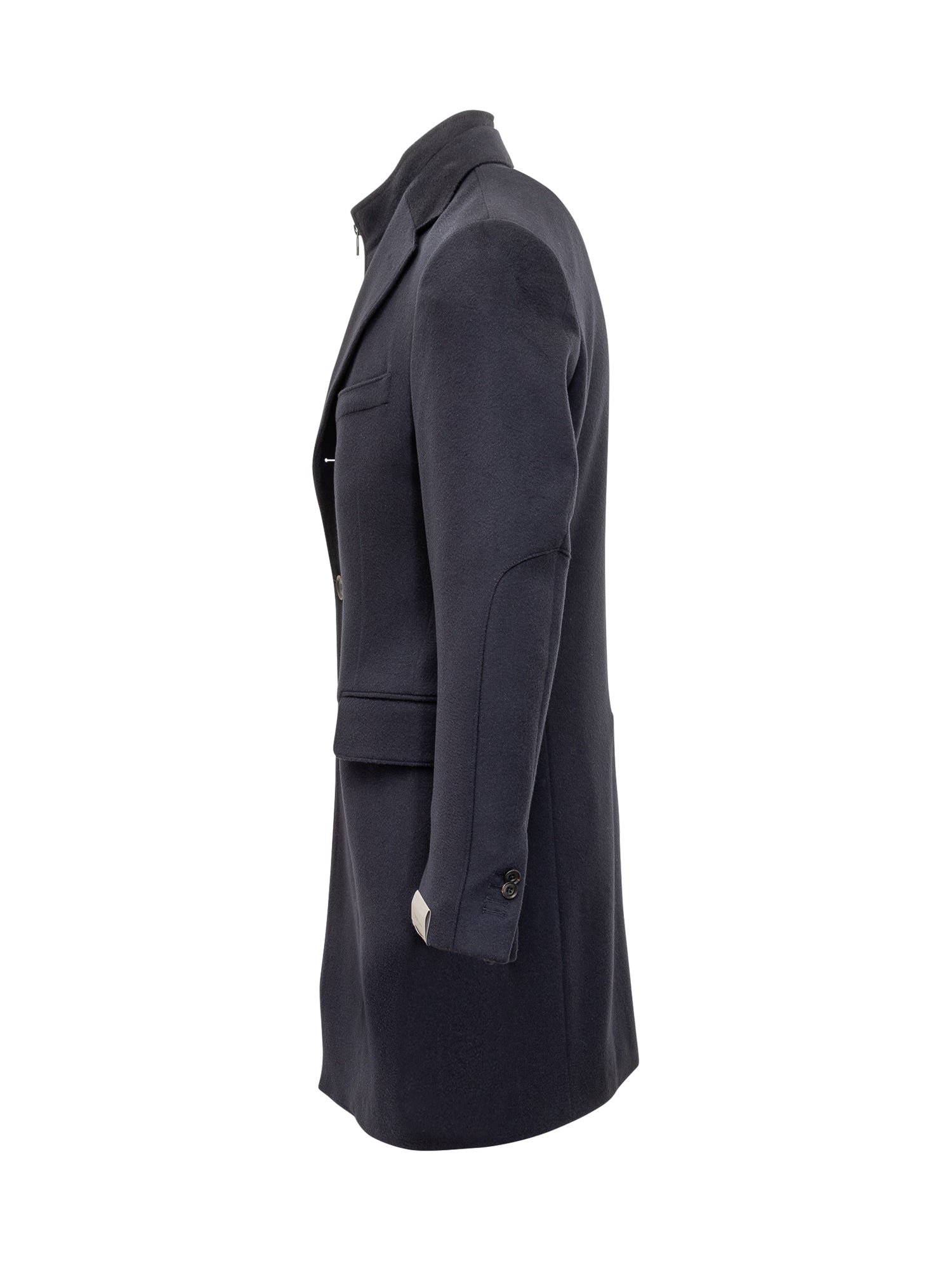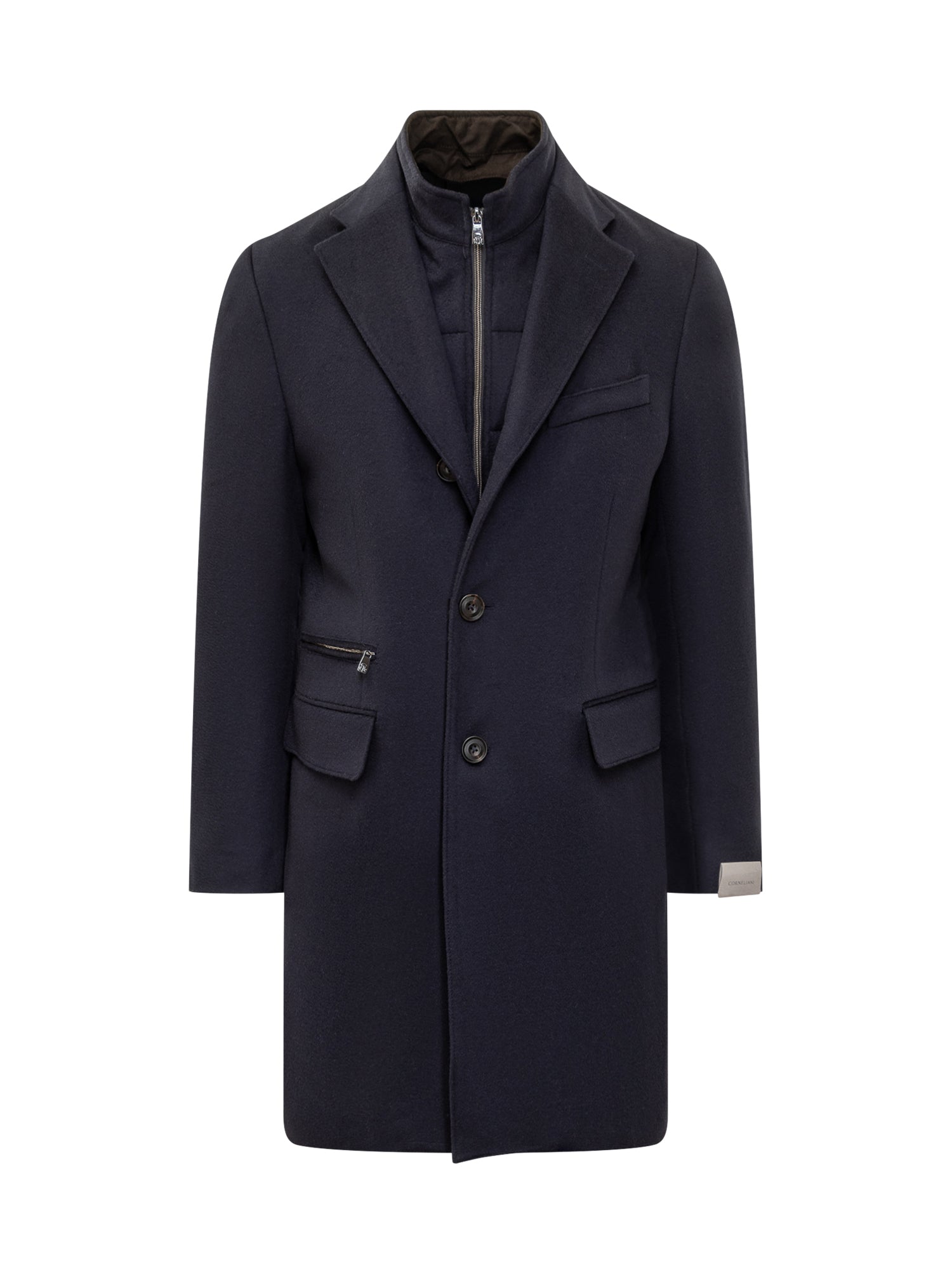 Cappotto Corneliani in lana blu con inserto interno trapuntato e chiusura a zip. Linea elegante con revers classici e bottoni frontali.