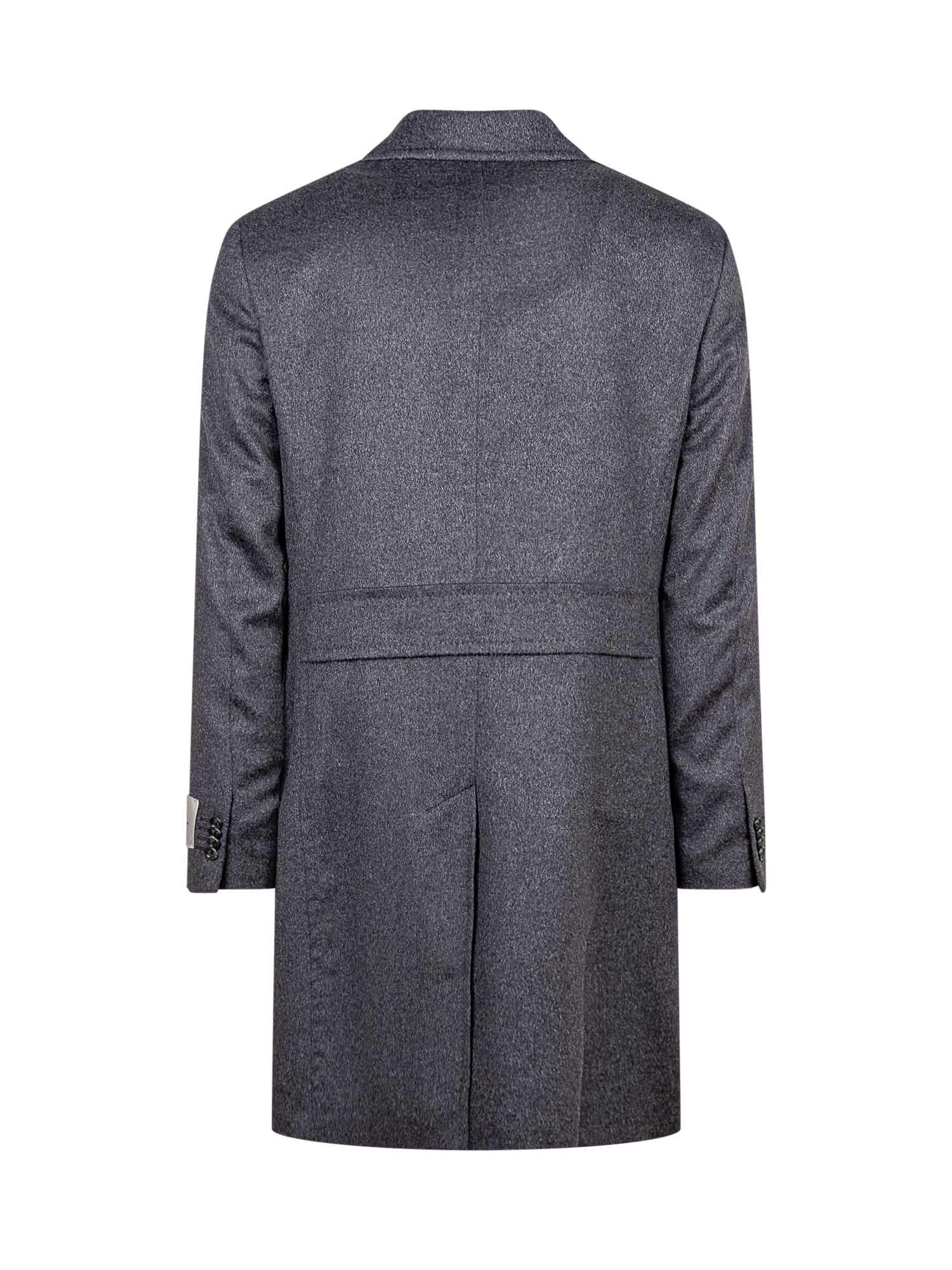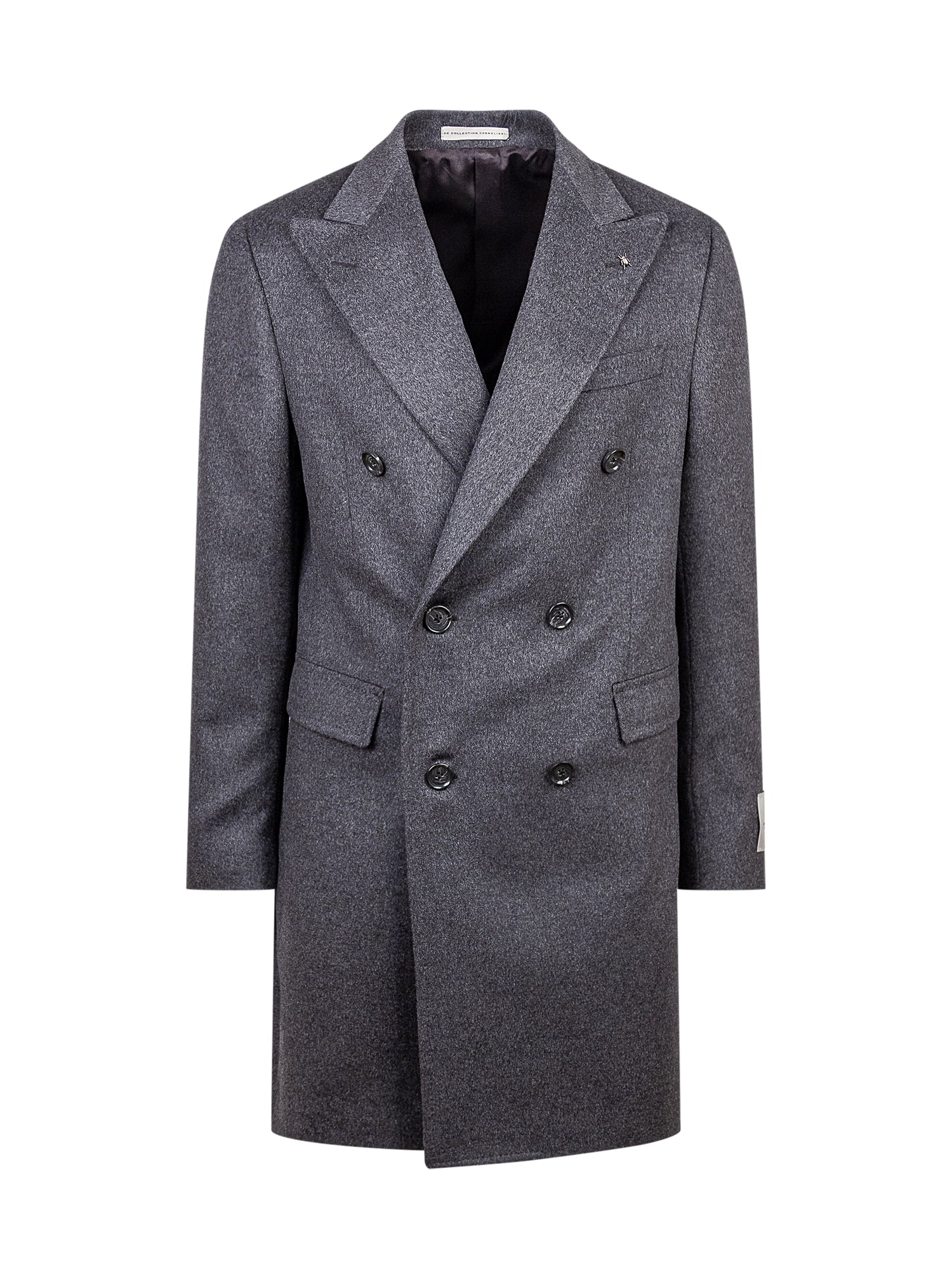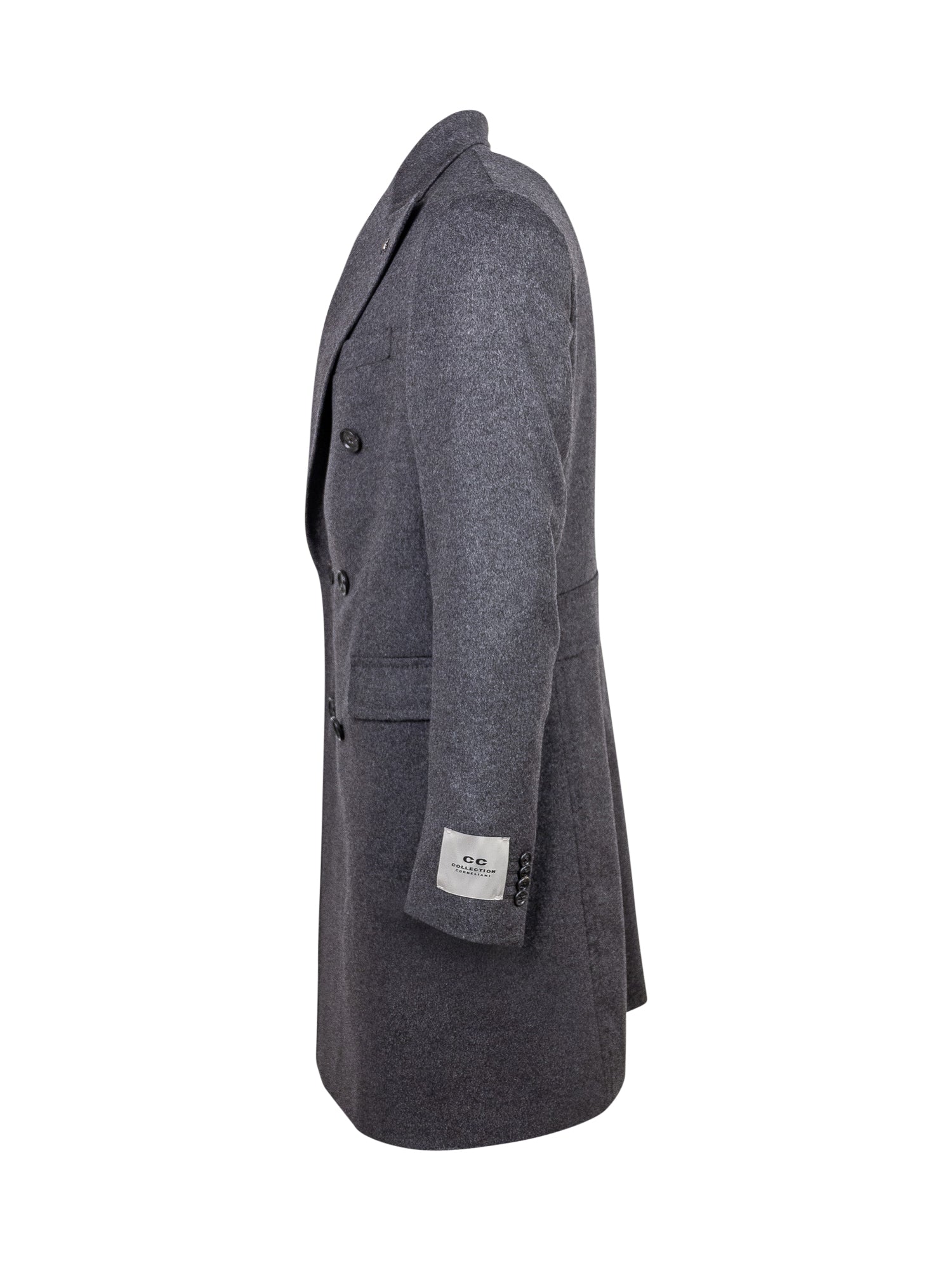 Cappotto con scollo a V e revers. Chiusura con bottoni. Polsi con bottoni. Tre tasche.