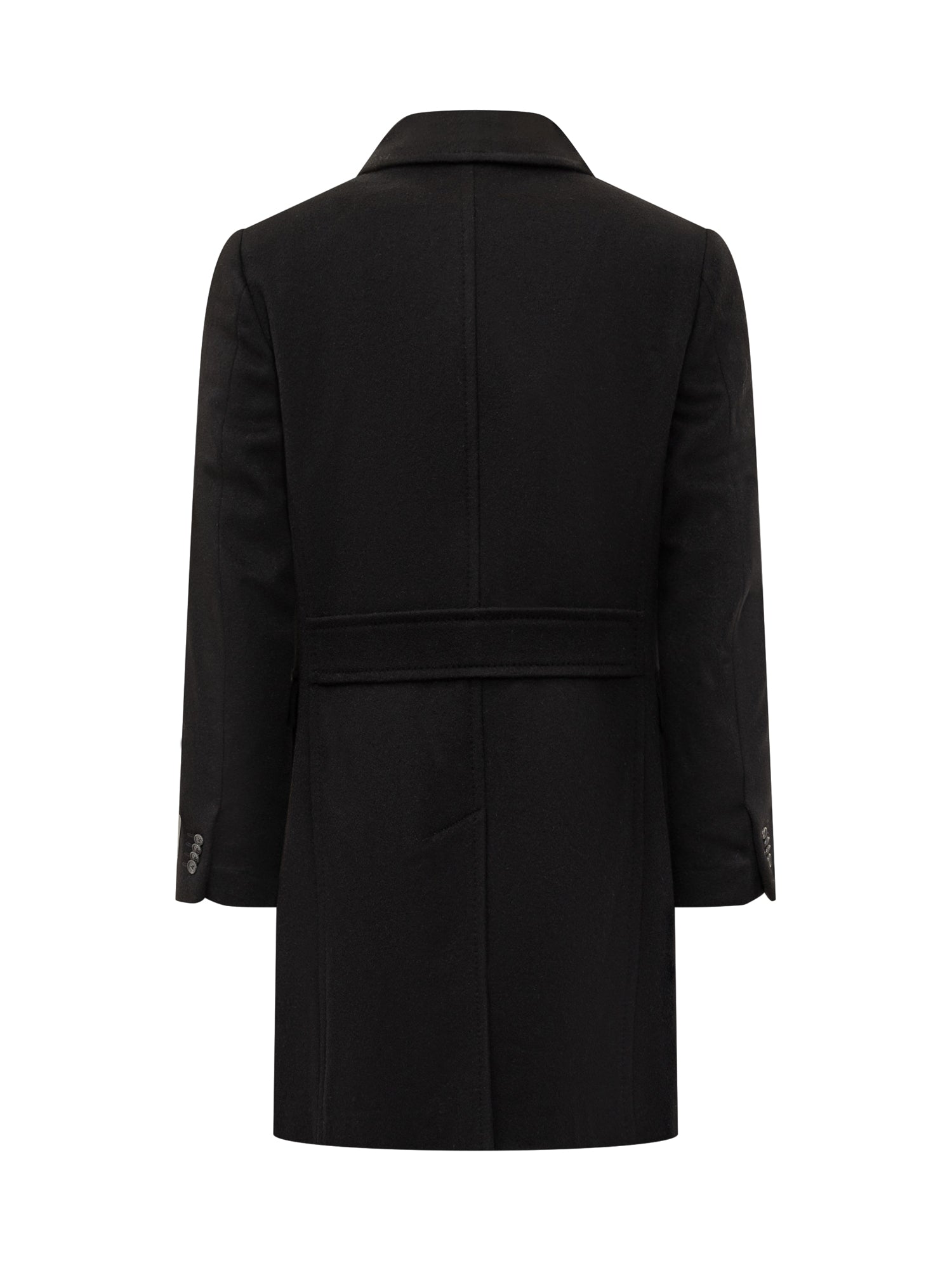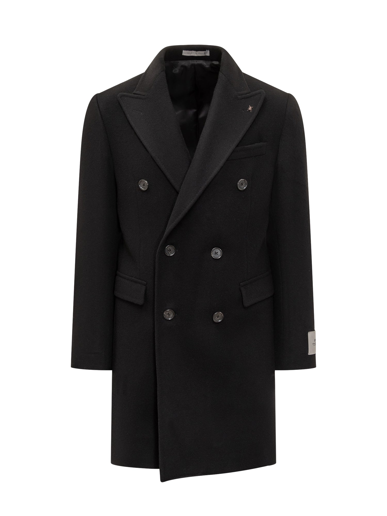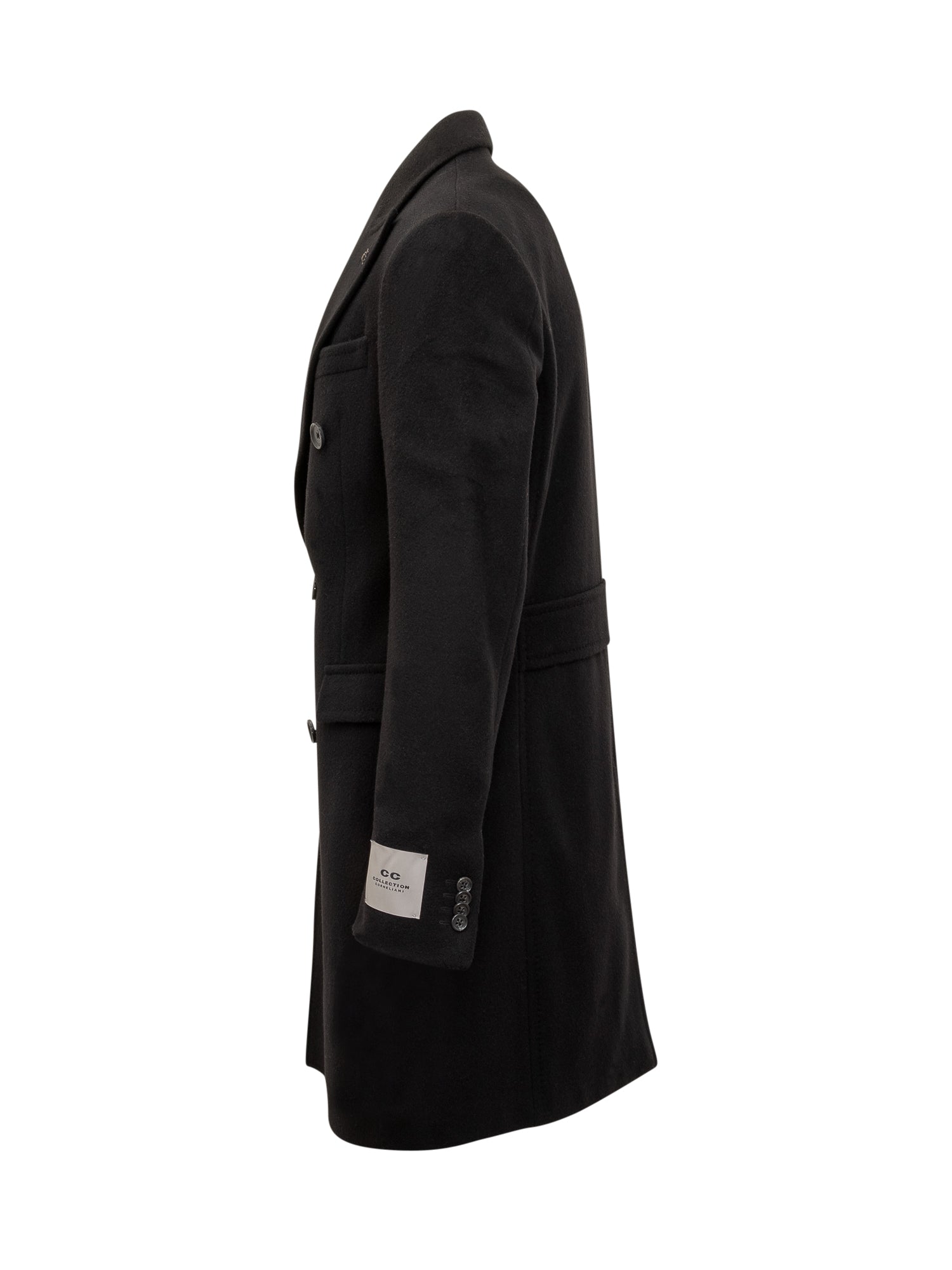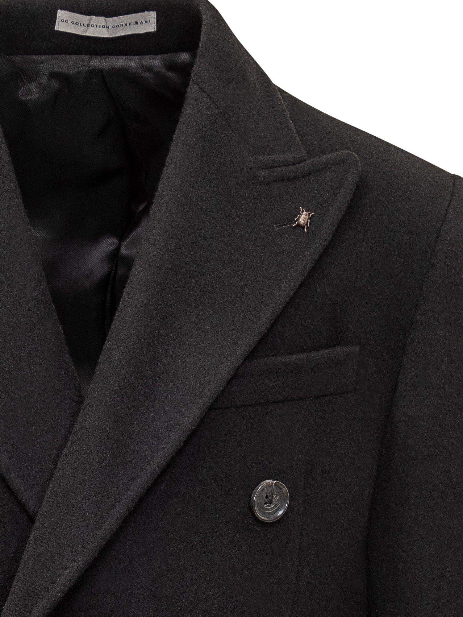 Cappotto Corneliani in lana nera con chiusura doppiopetto e revers a lancia.