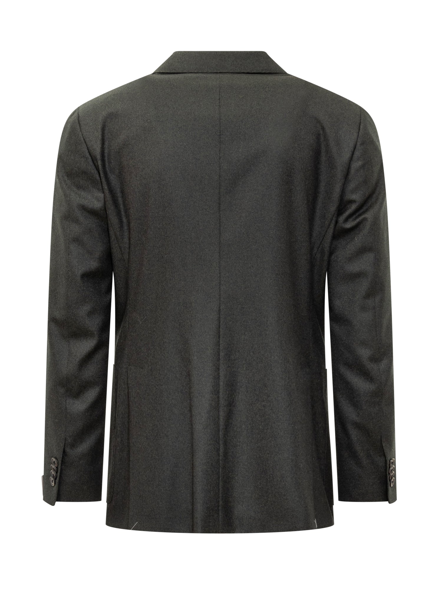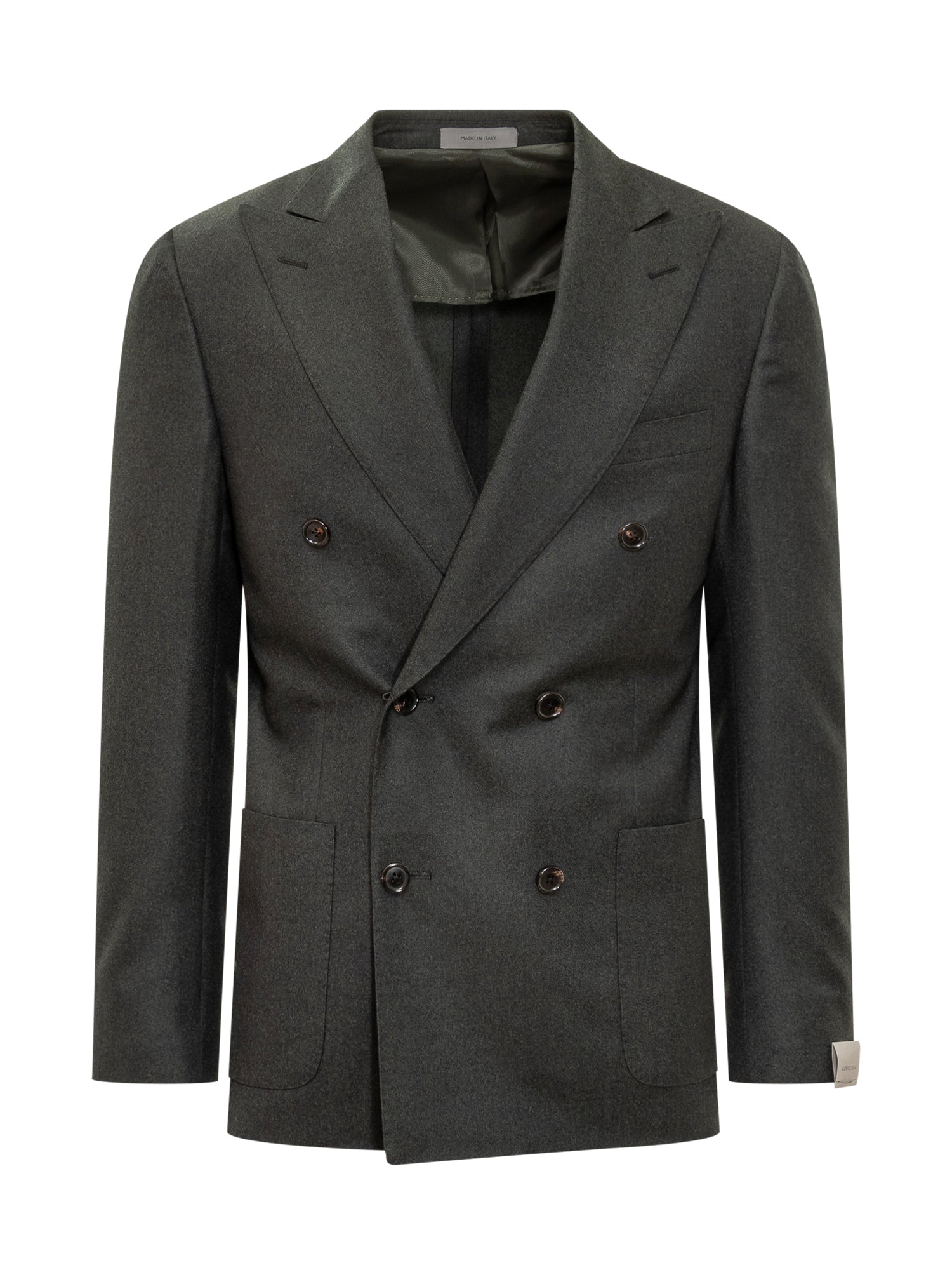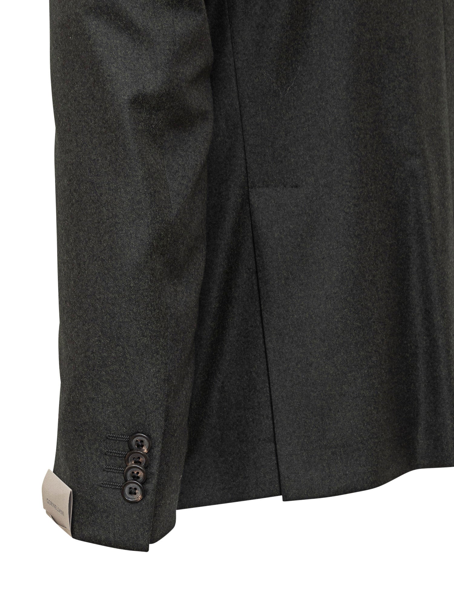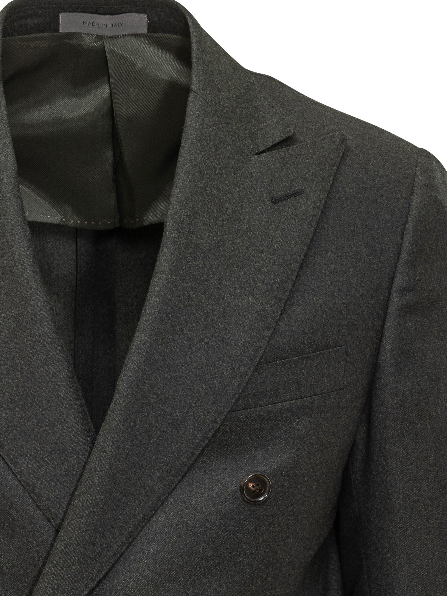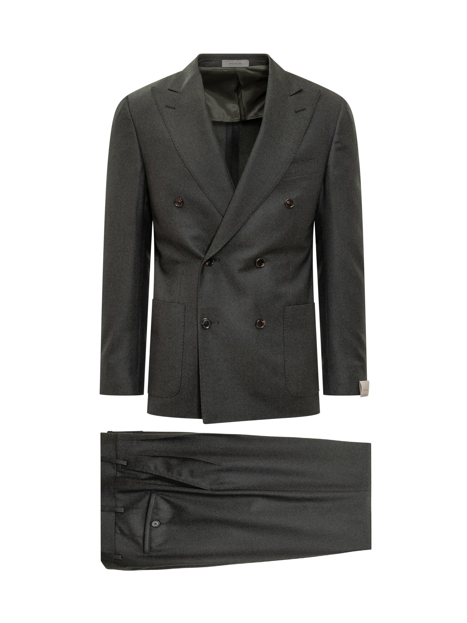 Raffinato abito doppiopetto Corneliani in viscosa verde, con revers classici, bottoni tono su tono e pantaloni coordinati.