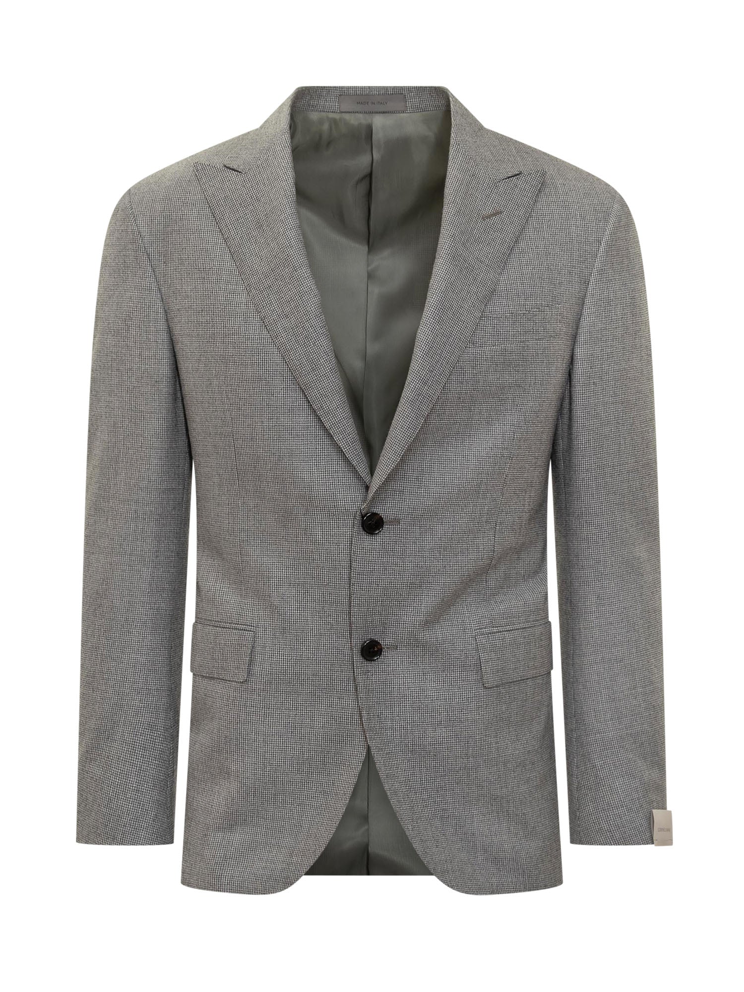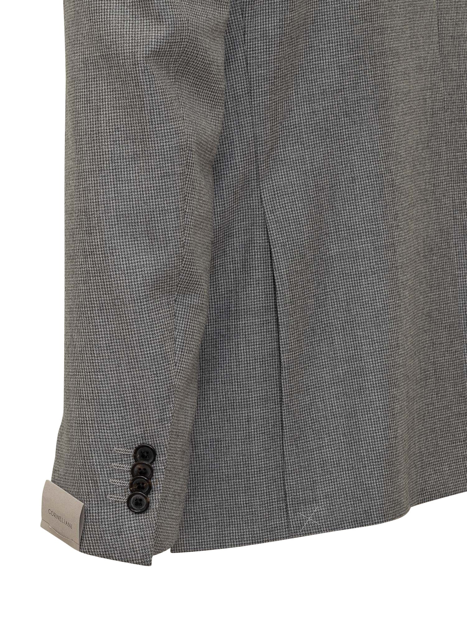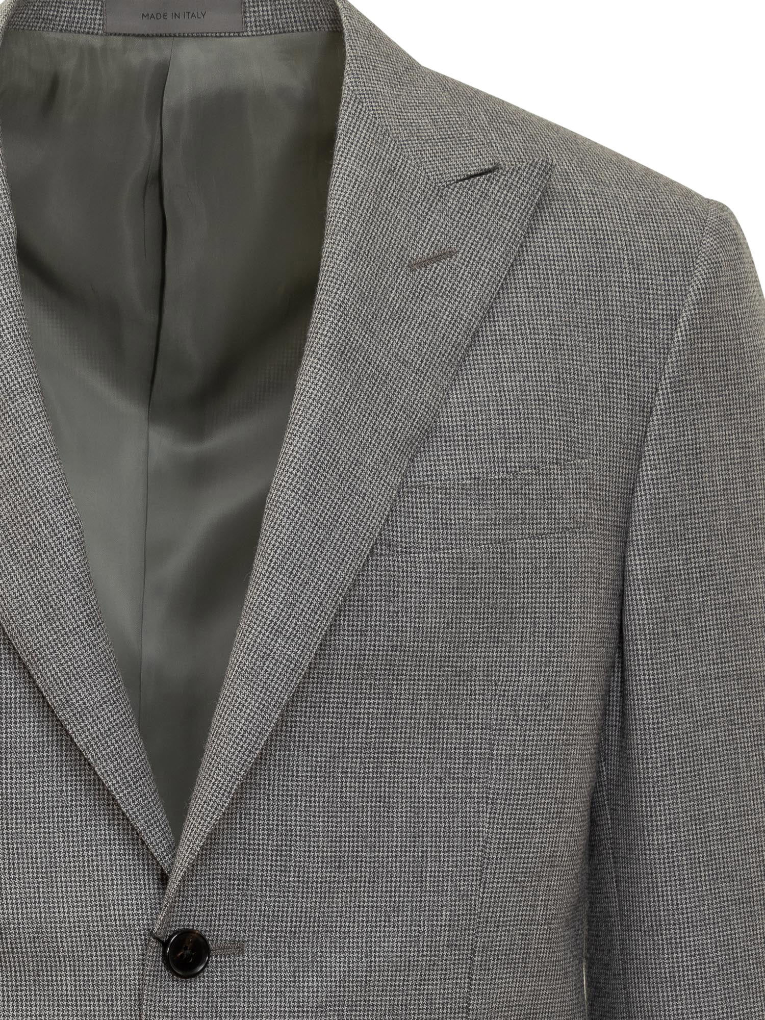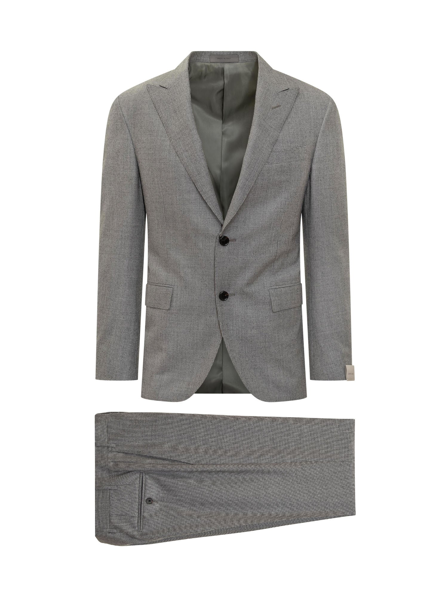 Abito monopetto Corneliani in cupro grigio, leggero e traspirante, con revers classico e pantaloni coordinati.