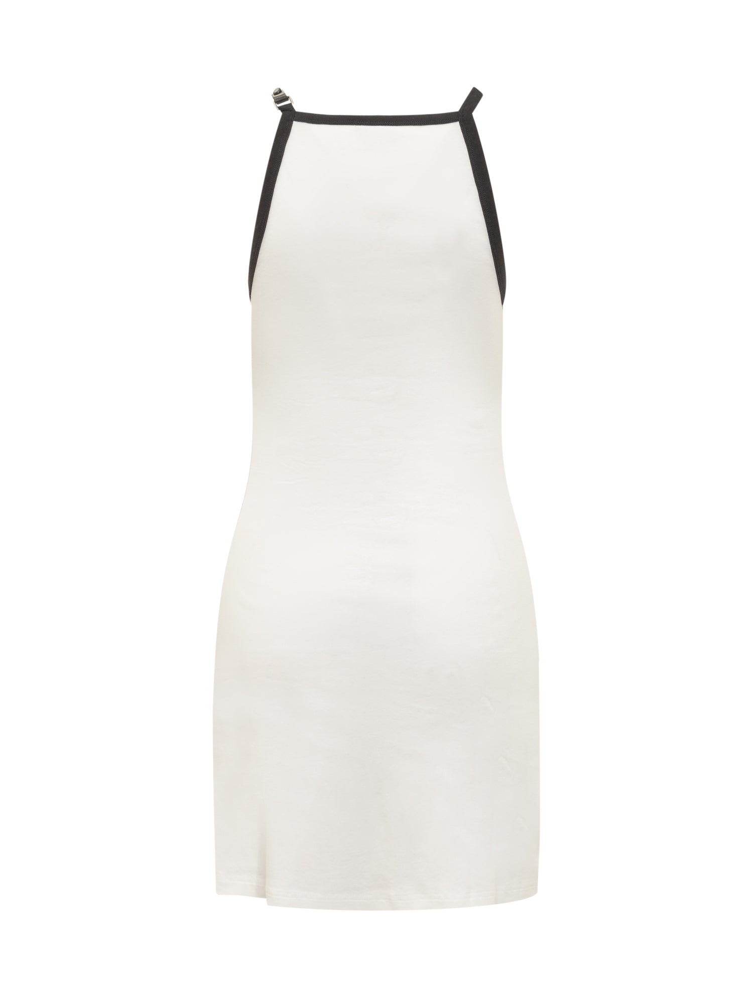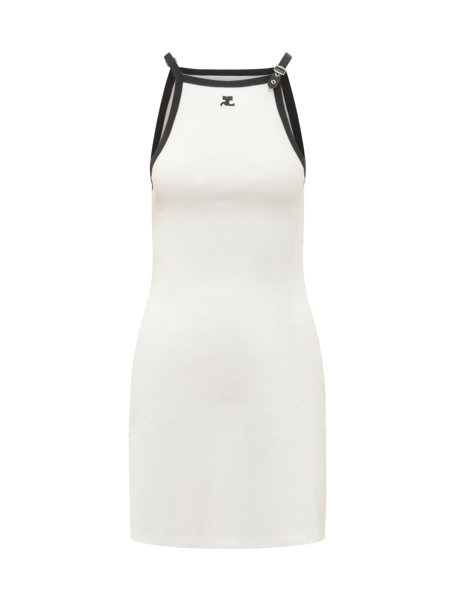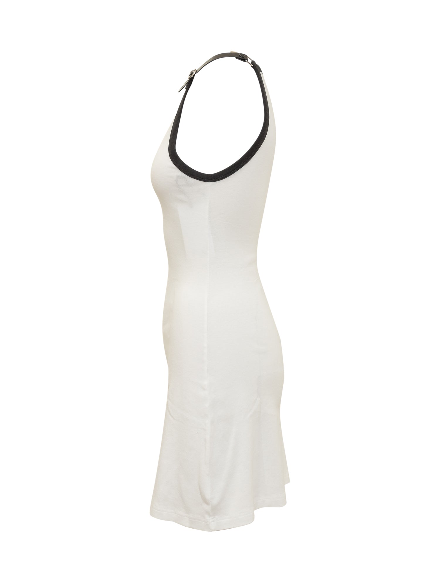 Abito midi smanicato con spalline in pelle sottili. Spalline regolabili. Orli a contrasto. Logo ricamato sul davanti.