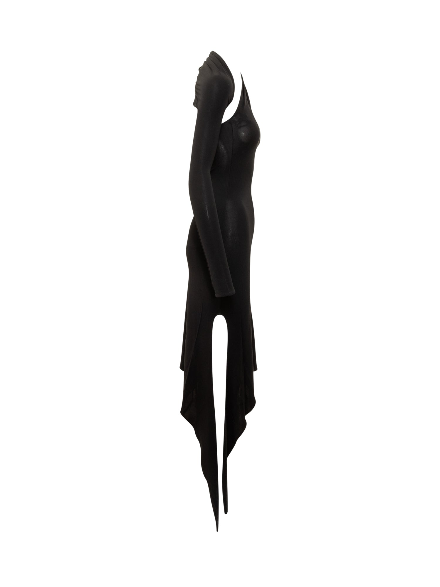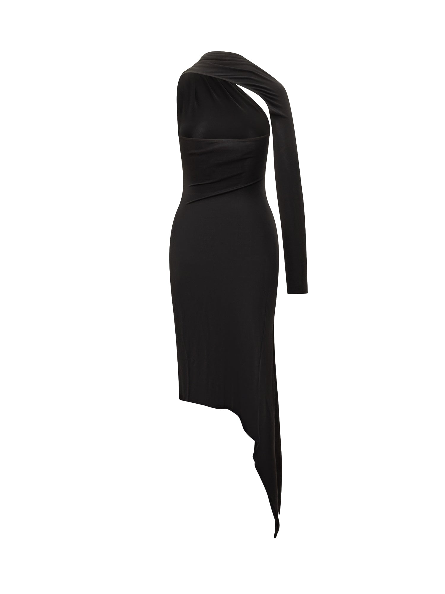 Abito monospalla nero effetto seconda pelle con drappeggio asimmetrico e manica lunga.
