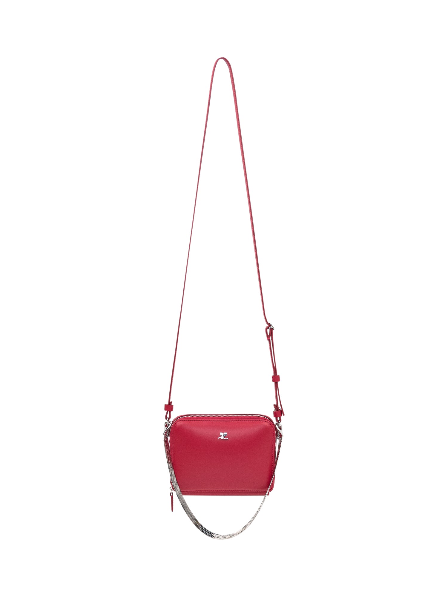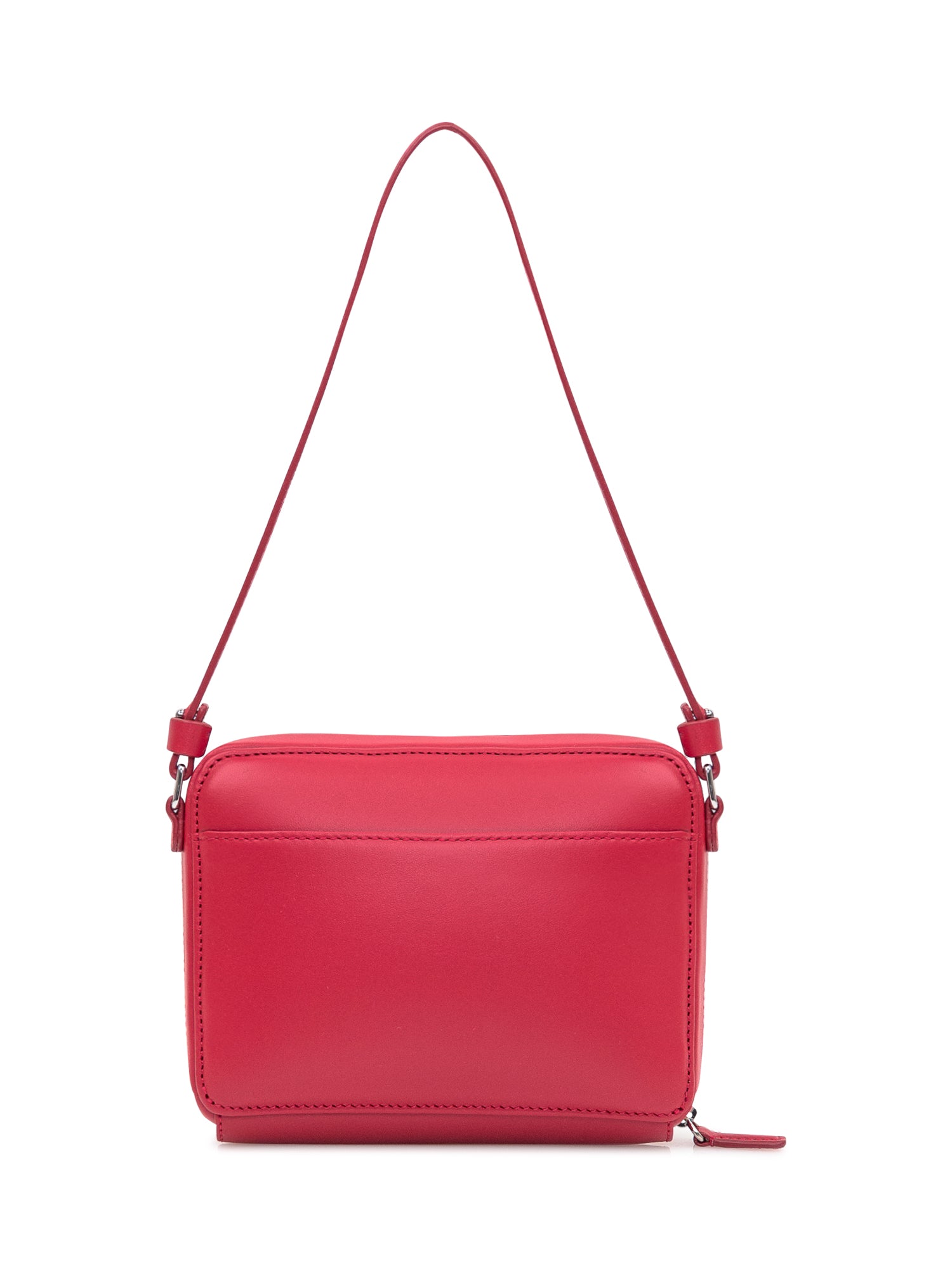 Borsa rossa in pelle. Tracolla e manico rimovibili. Uno scomparto con tasca interna. Logo applicato. Chiusura con zip.