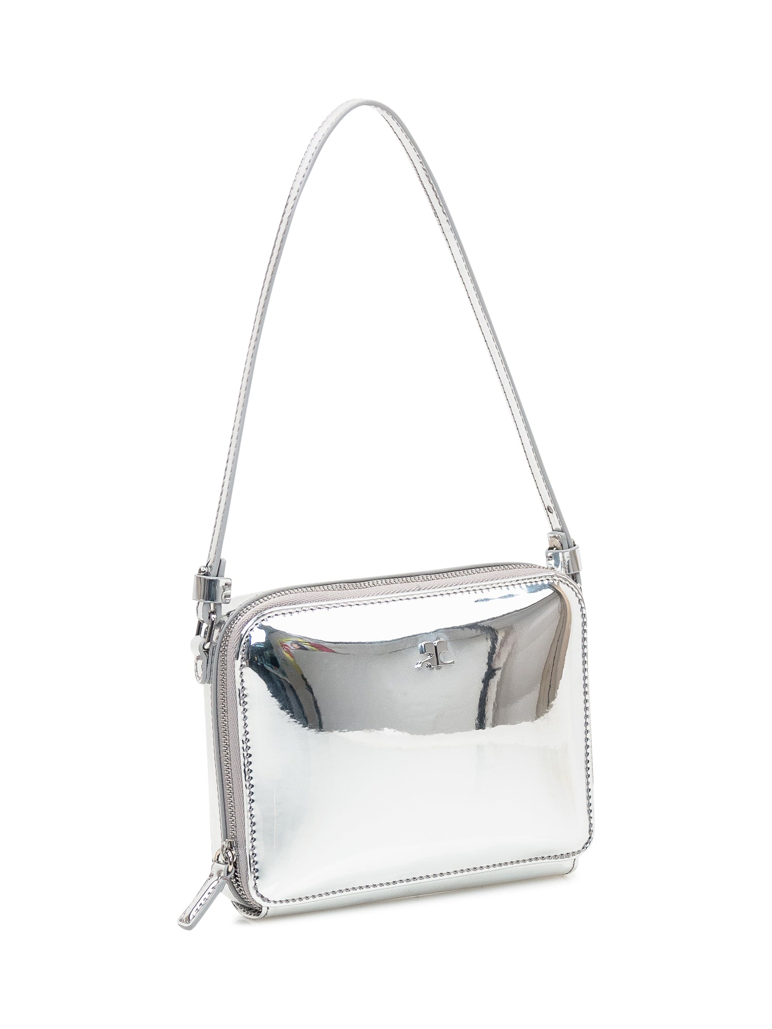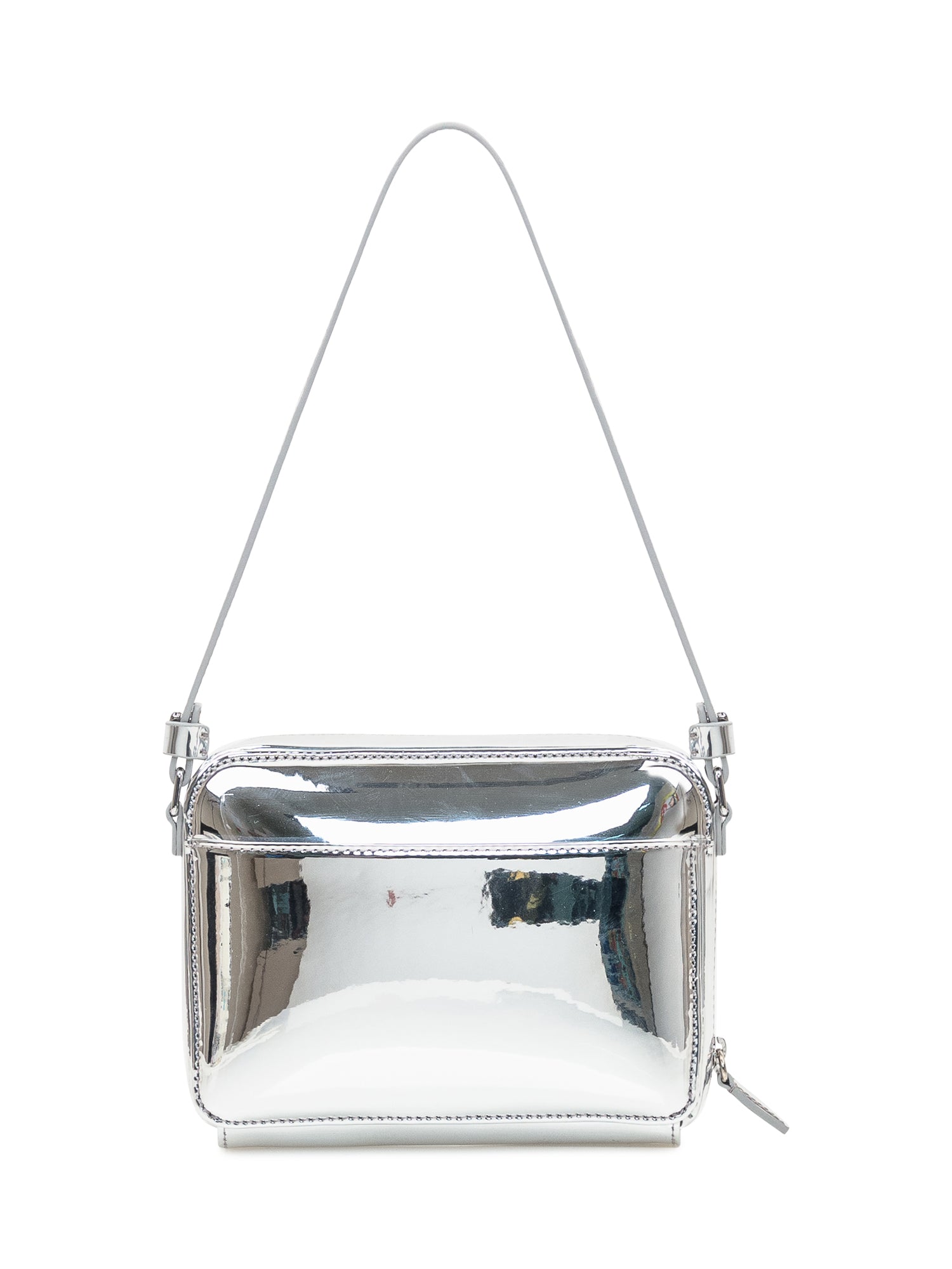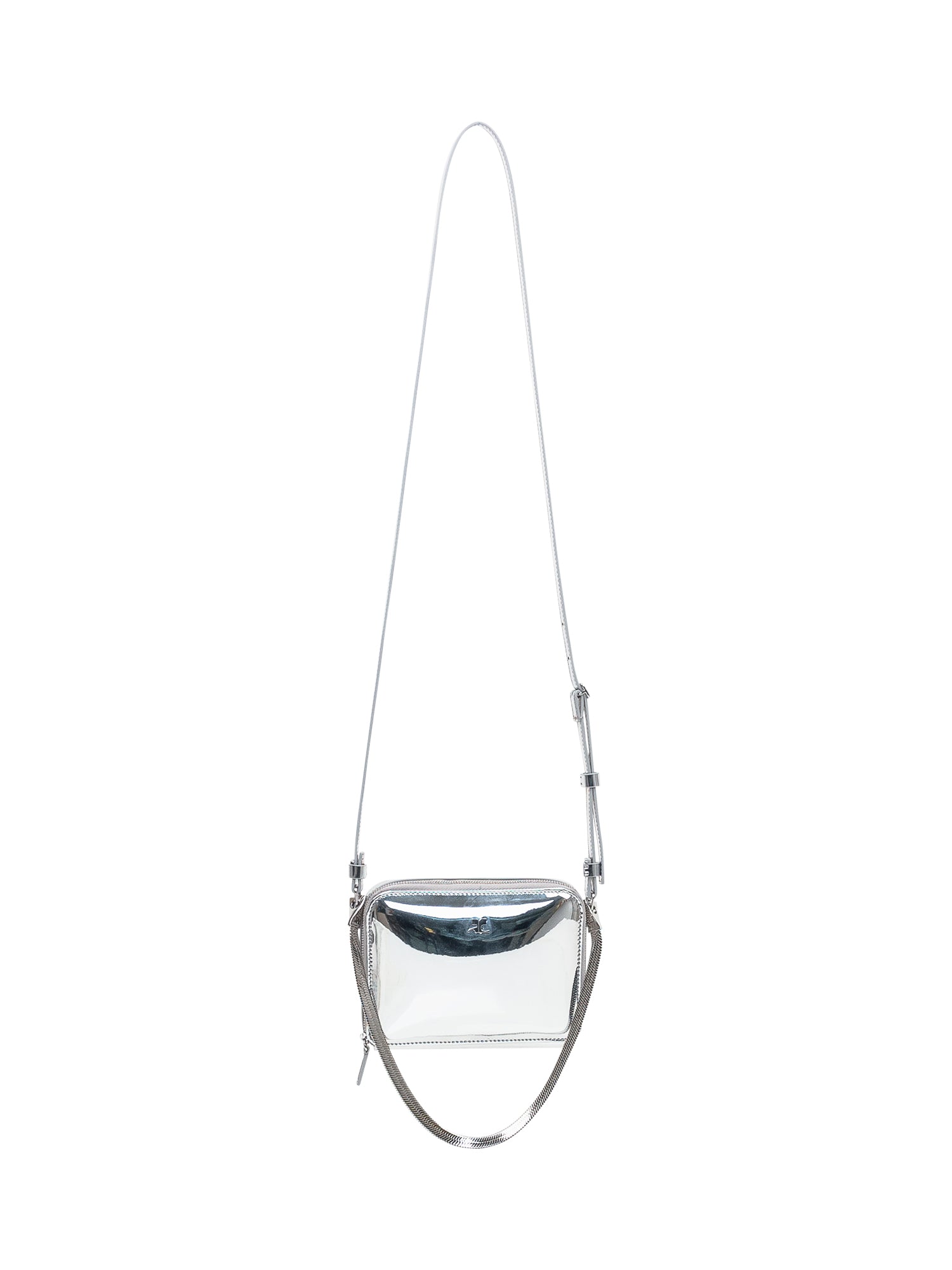 Borsa argento. Tracolla e manico rimovibili. Uno scomparto con tasca interna. Logo applicato. Chiusura con zip.