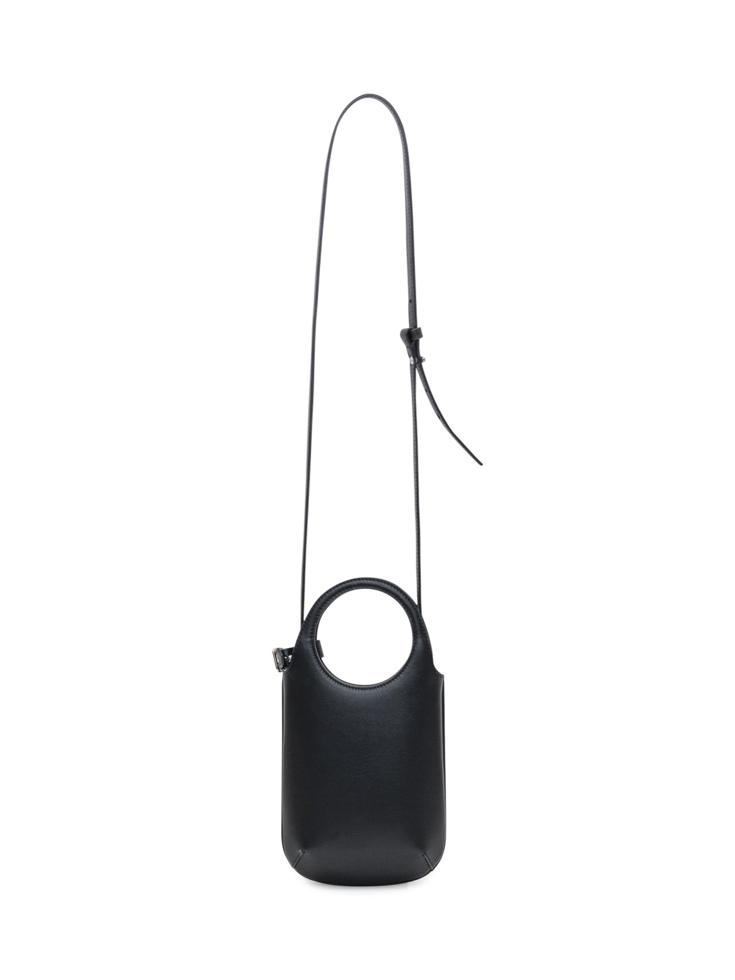 Borsa nera compatta in pelle. Caratterizzata da un design minimalista e lineare. Tracolla regolabile e removibile.