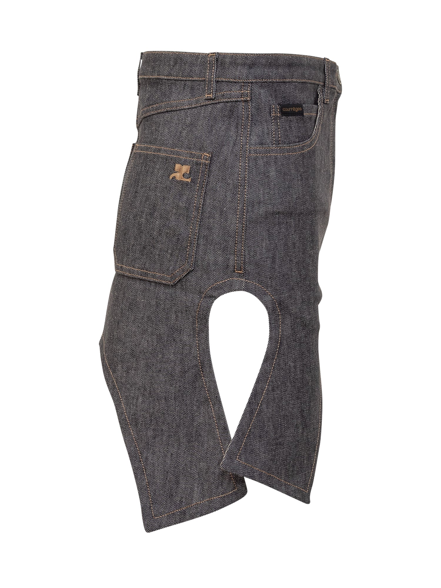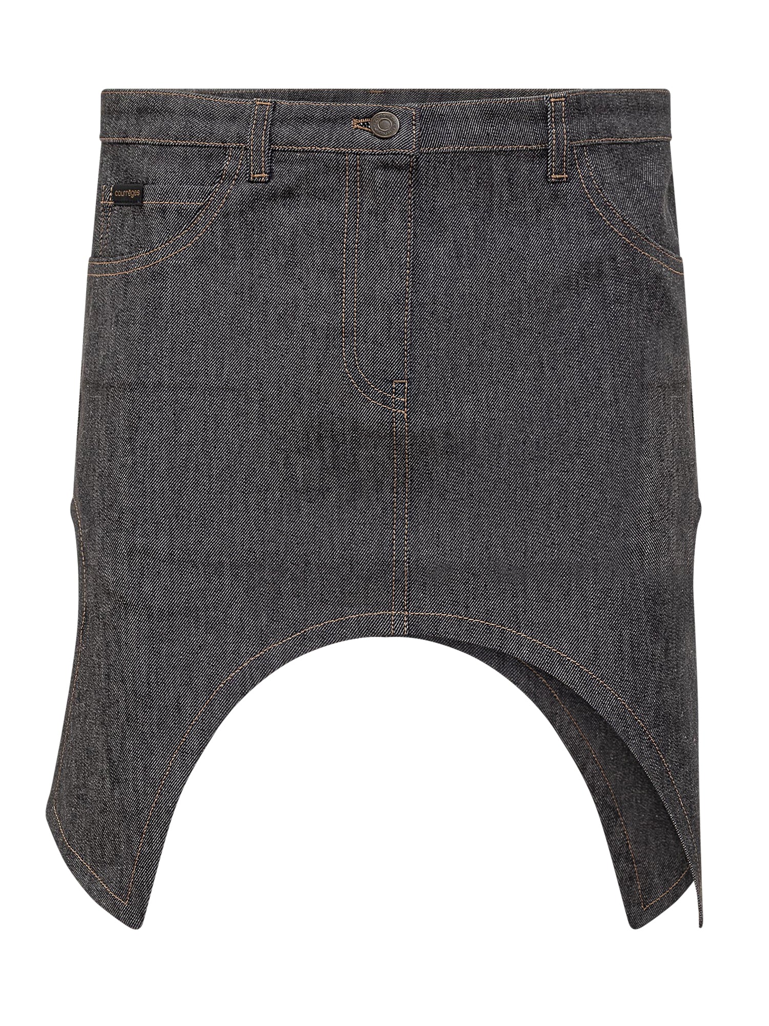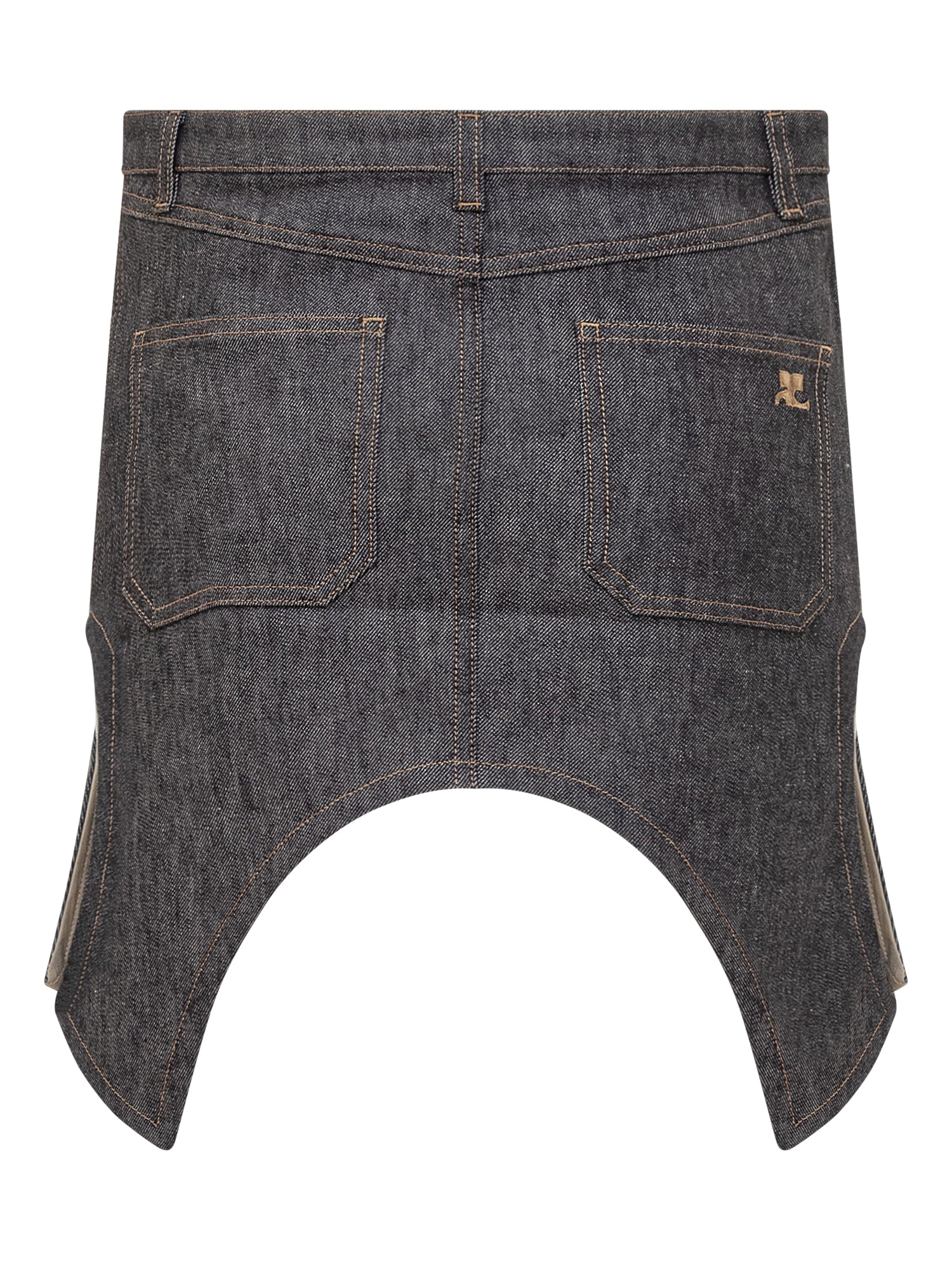 Gonna Corta in denim. Chiusura con zip e bottone. Cinque tasche. Logo ricamato sul retro.