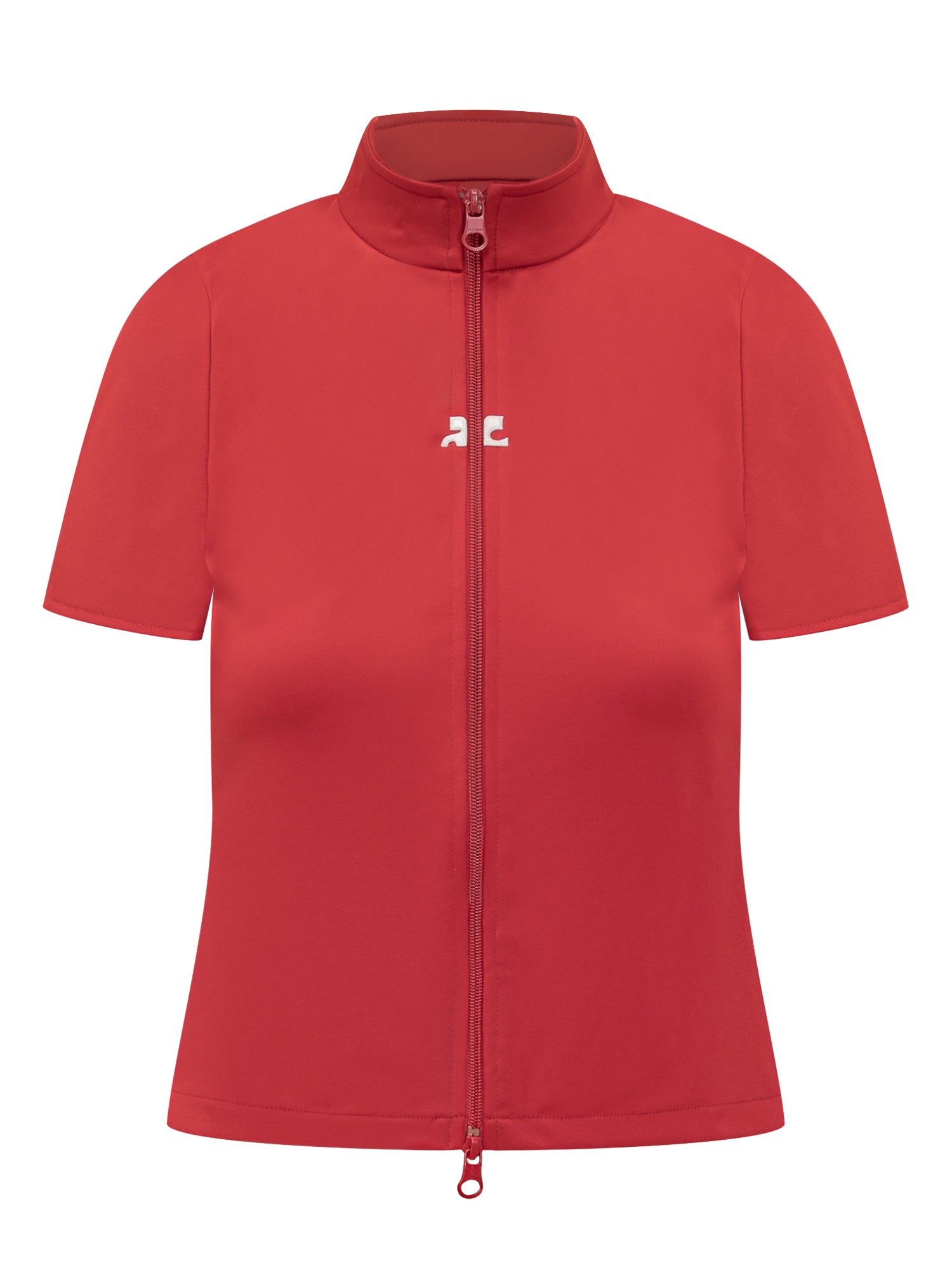 Top elasticizzato Courrèges in rosso acceso, con zip frontale a doppio cursore e logo ricamato.