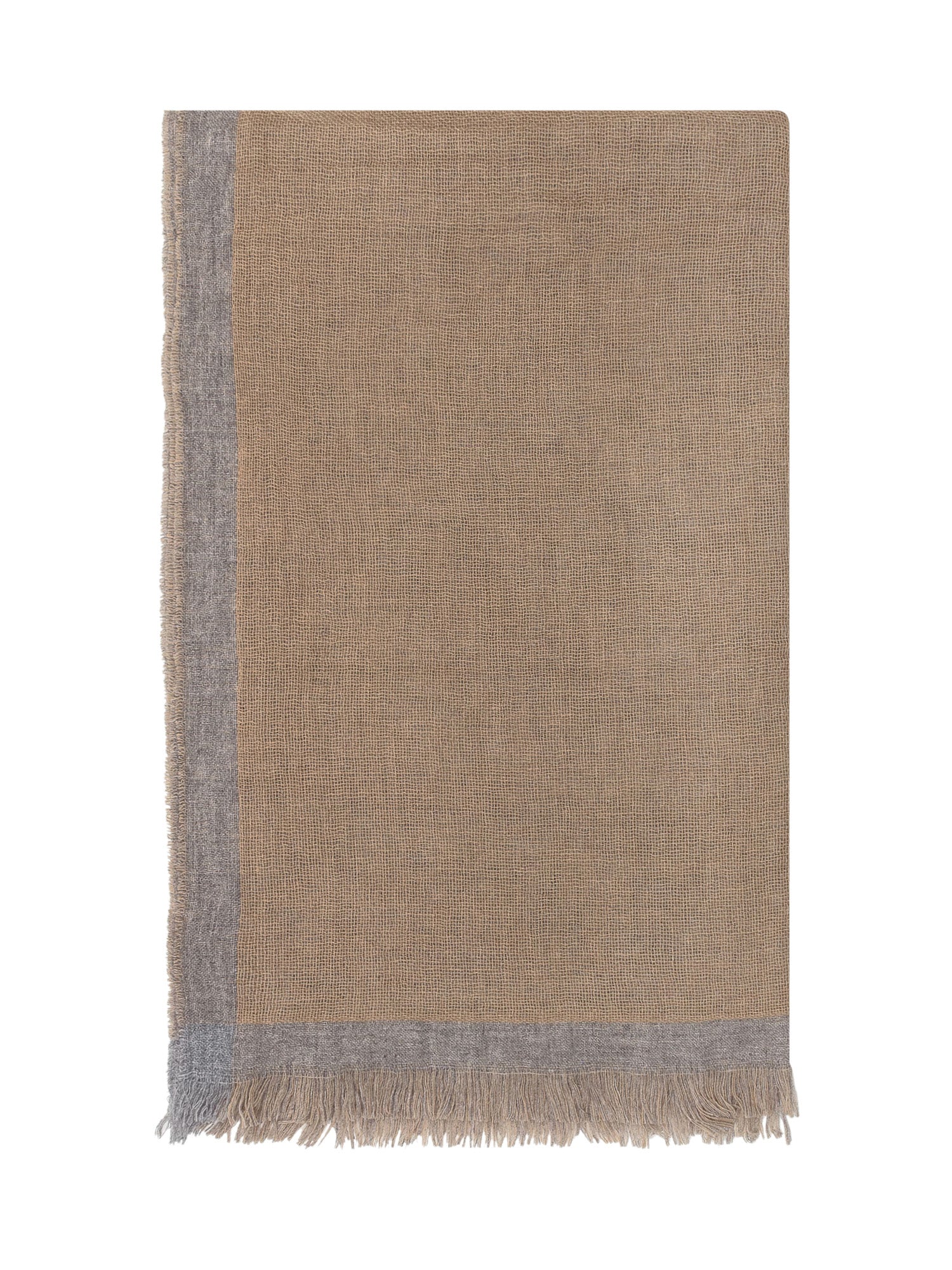 Sciarpa D'Aniello in tessuto leggero beige con bordo grigio e frange.