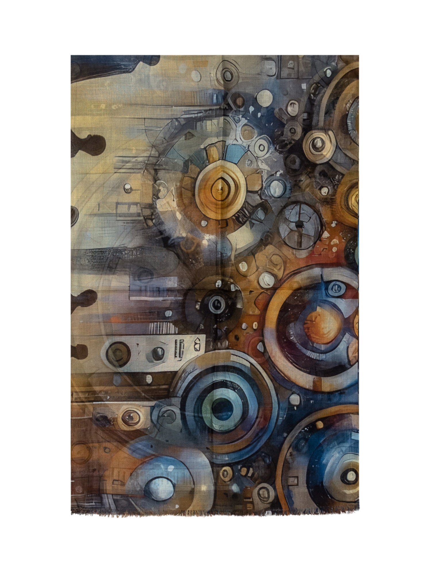 Sciarpa D'Aniello in tessuto leggero con stampa astratta nei toni blu, oro e marrone.