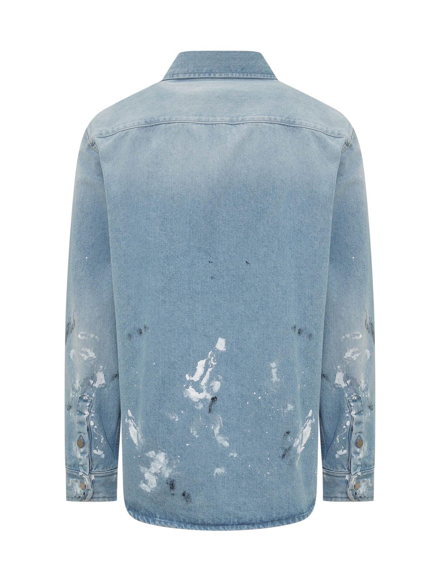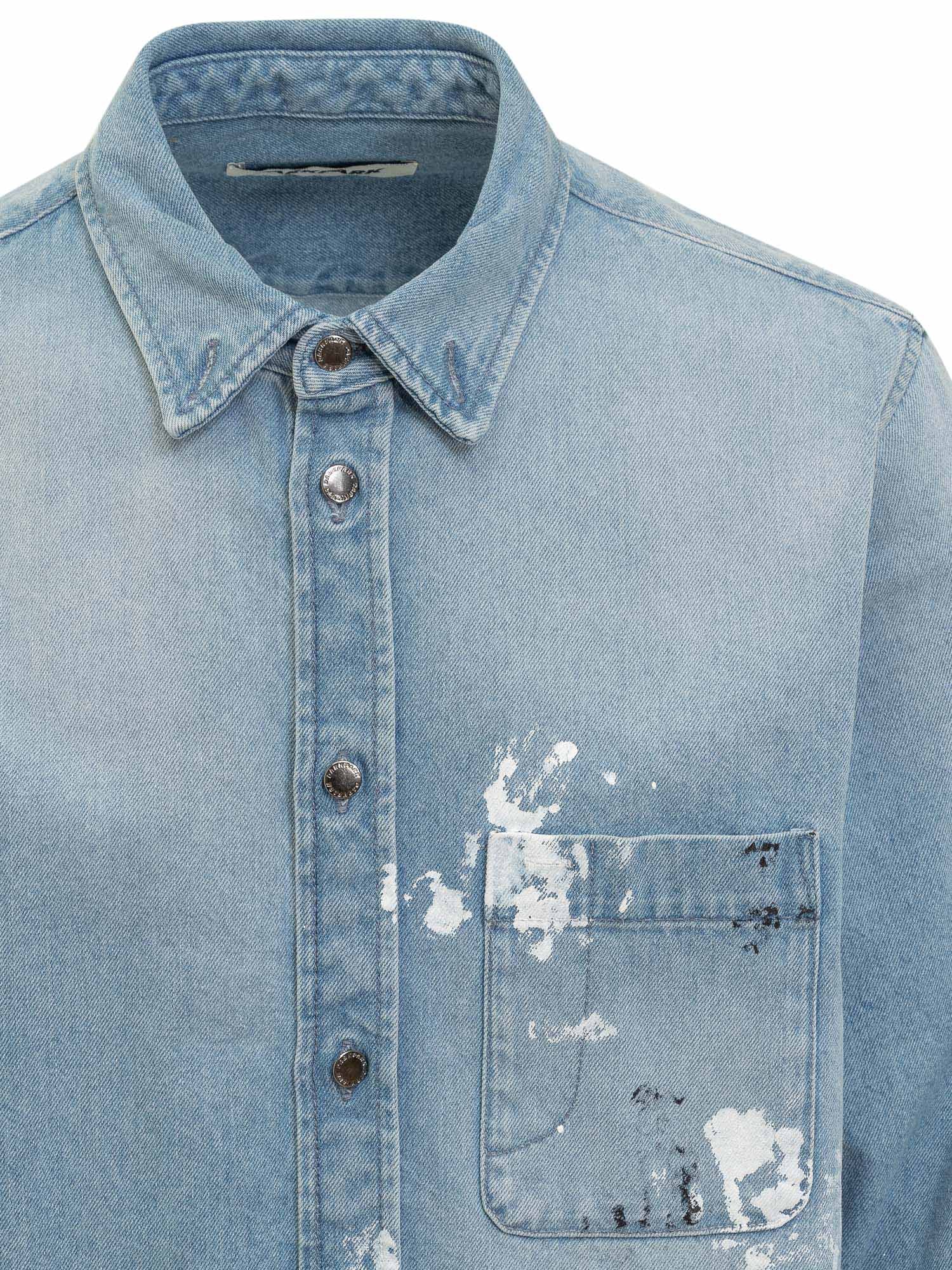 Camicia in denim a maniche lunghe. Colletto classico. Chiusura con bottoni. Polsini con bottoni. Tasca unica sul petto. Effetto schizzi di colore all-over.