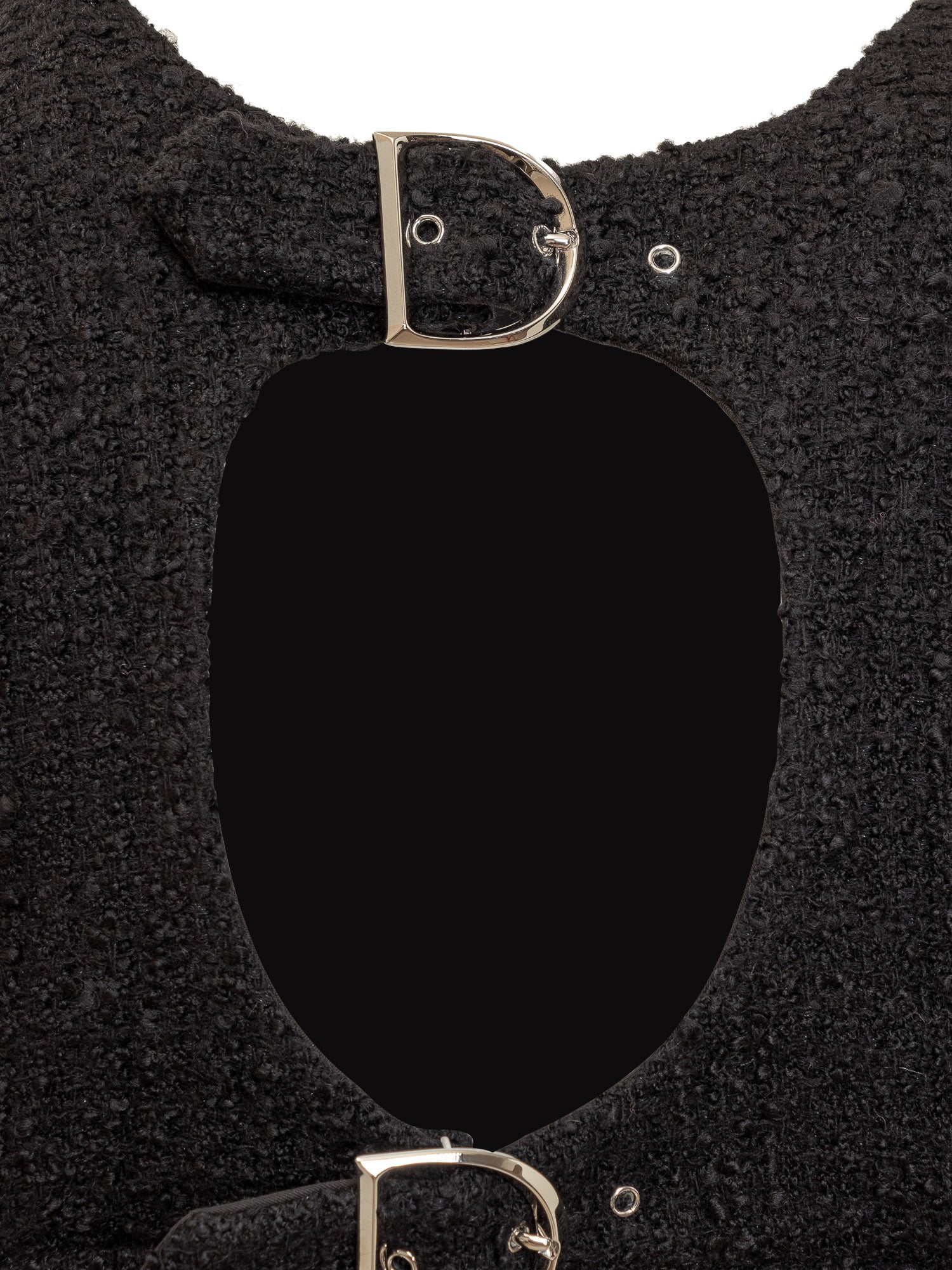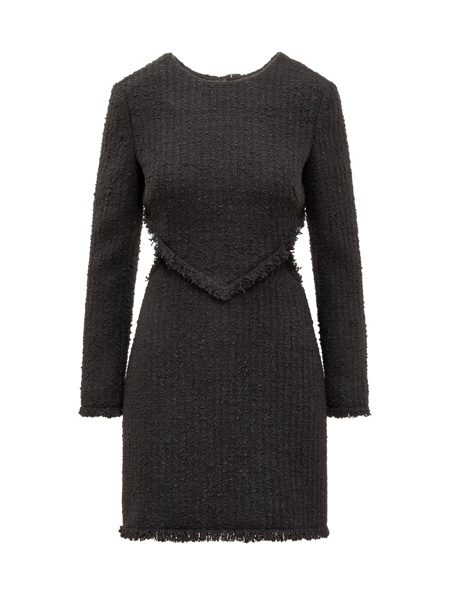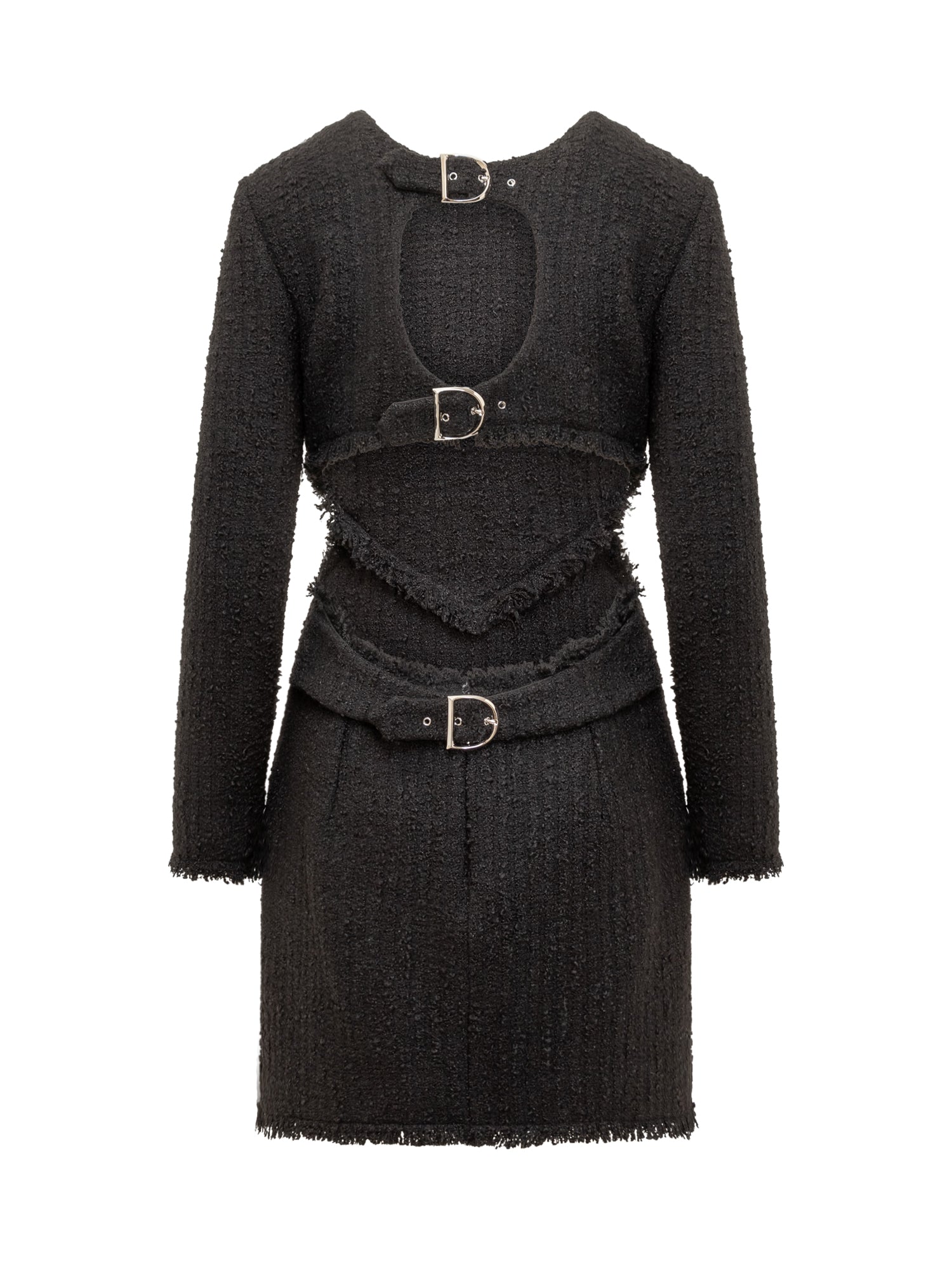 Miniabito nero a maniche lunghe. Girocollo. Cut-out sul retro. Chiusura con cinturini regolabili. Effetto abito a doppio pezzo. Dettaglio D logate.
