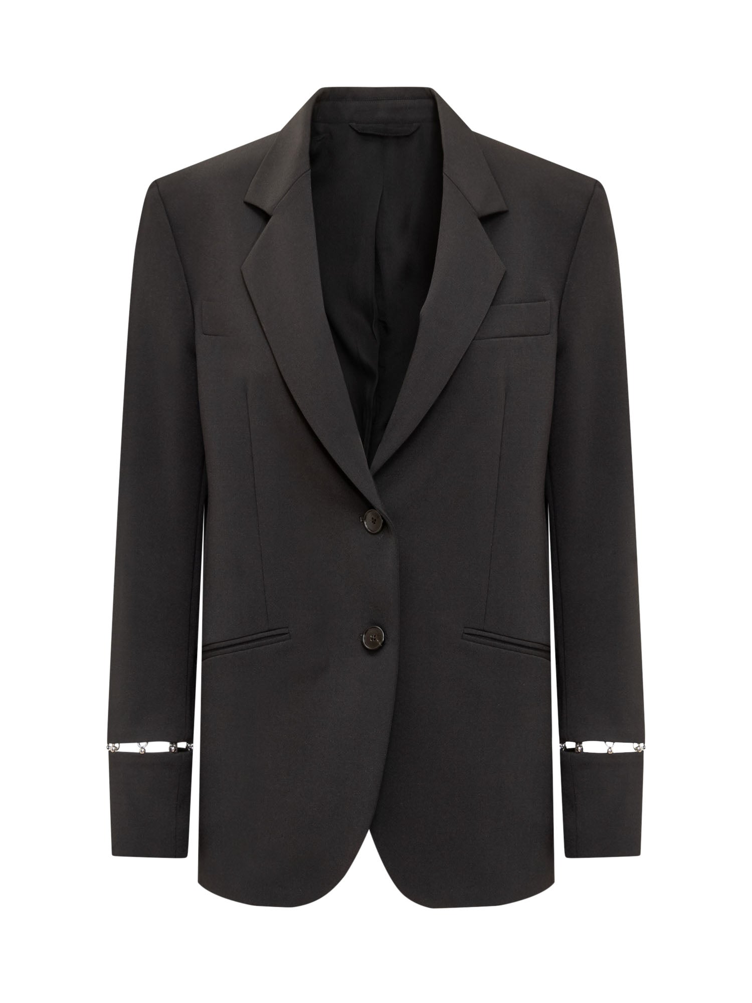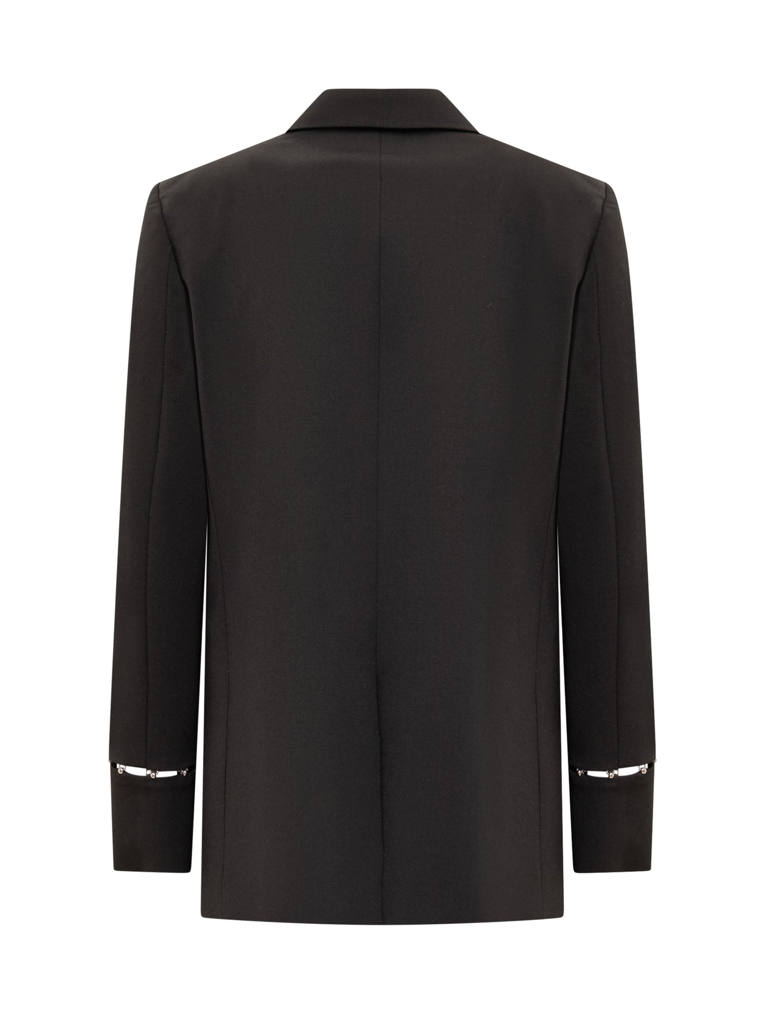 Blazer nero a maniche lunghe. Monopetto. Chiusura con bottone. Tasca sul petto e sul davanti. Dettaglio cut out con ganci ai polsi.