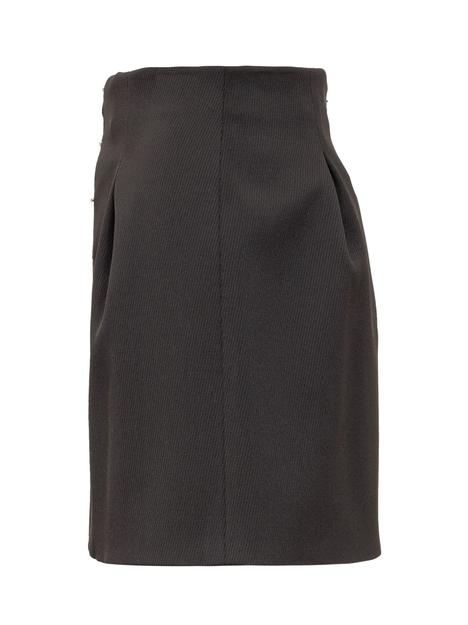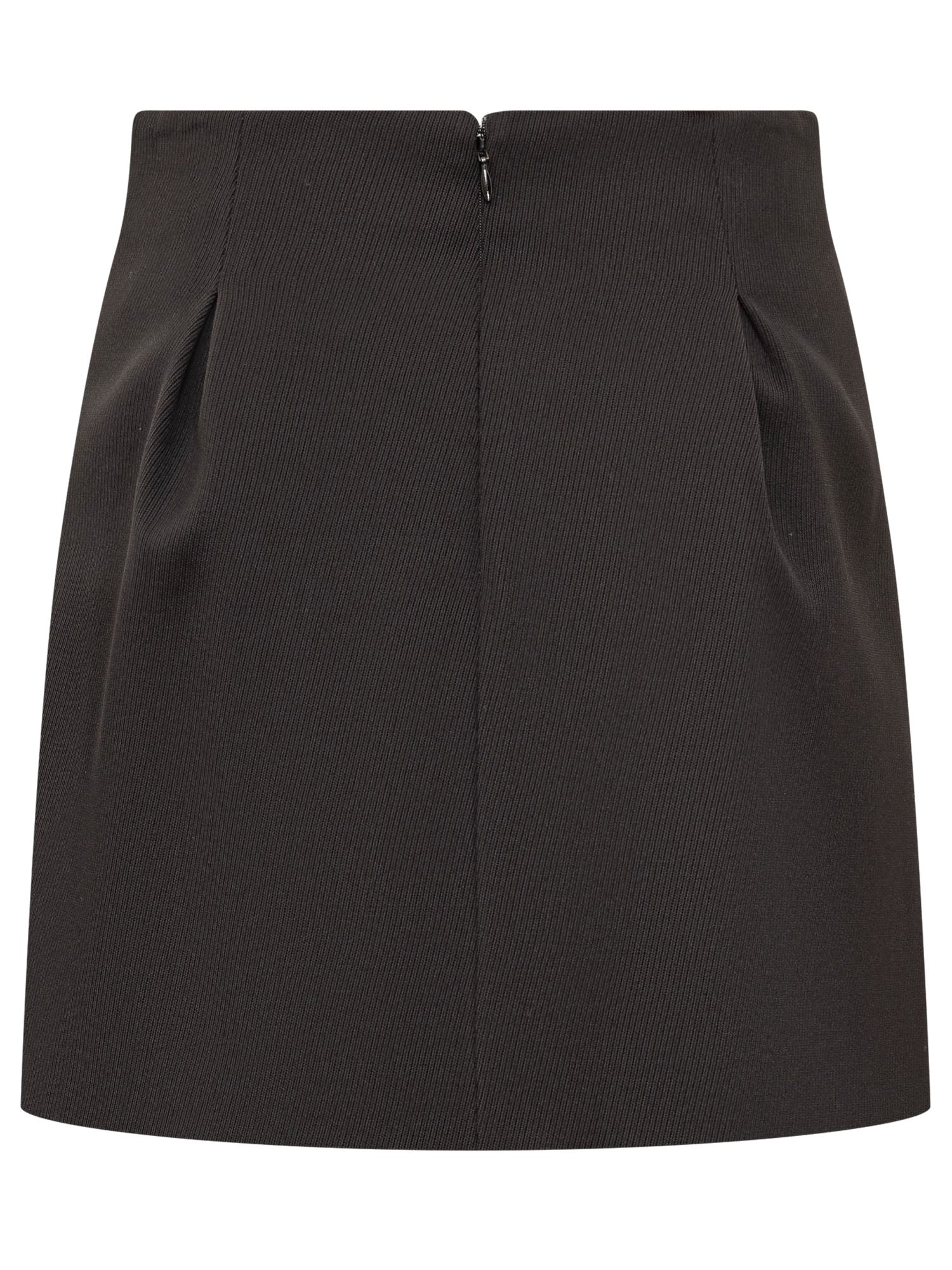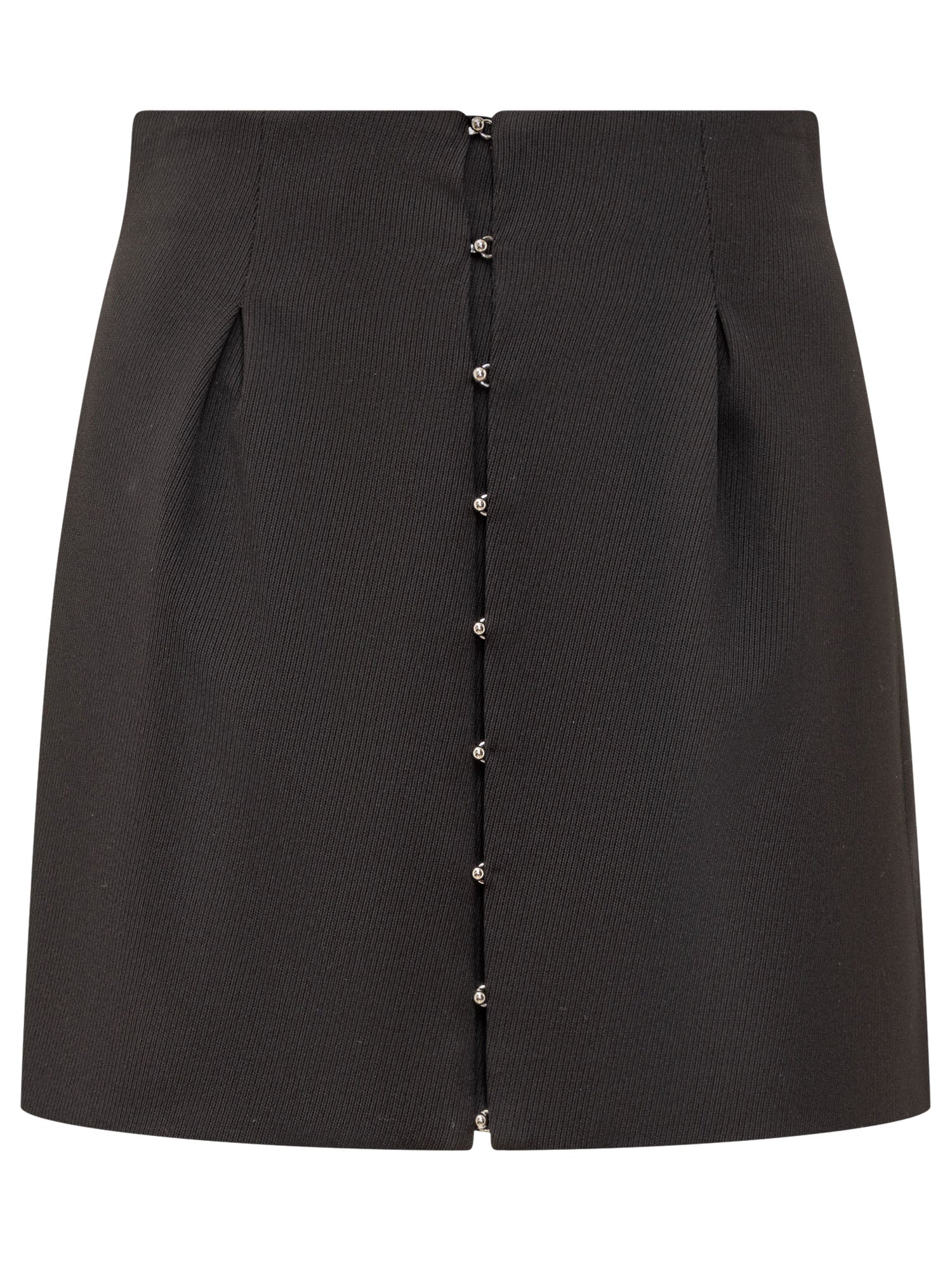 Gonna corta nera. Ganci frontali. Chiusura con zip sul retro.