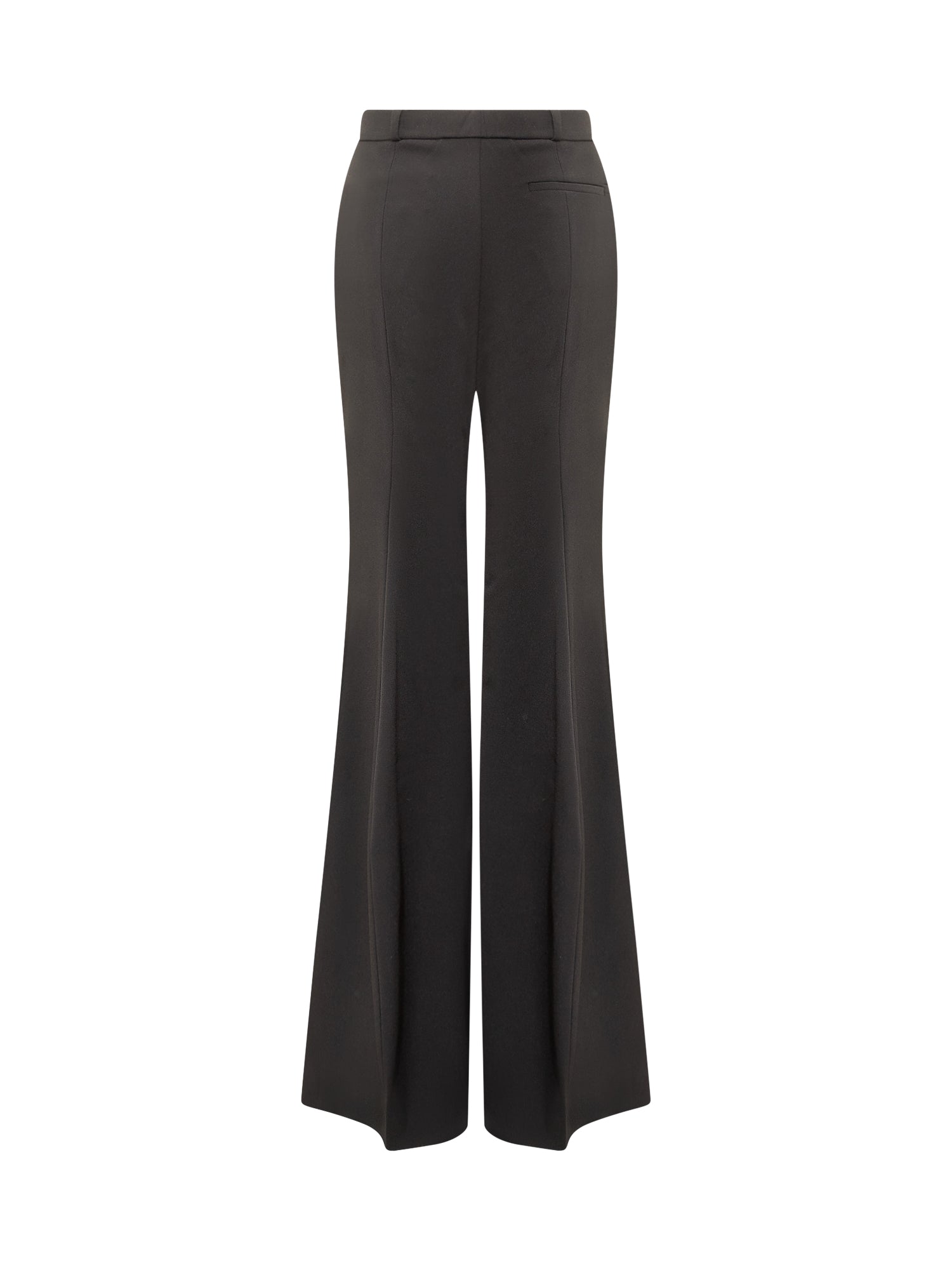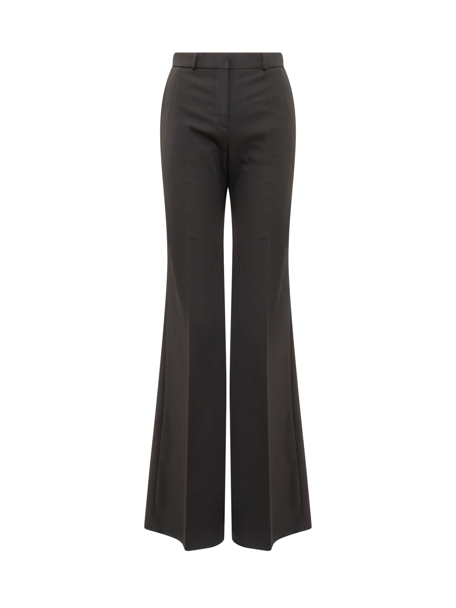 Pantaloni lunghi svasati. Chiusura zip e gancino. Passanti per cintura. Tre tasche.