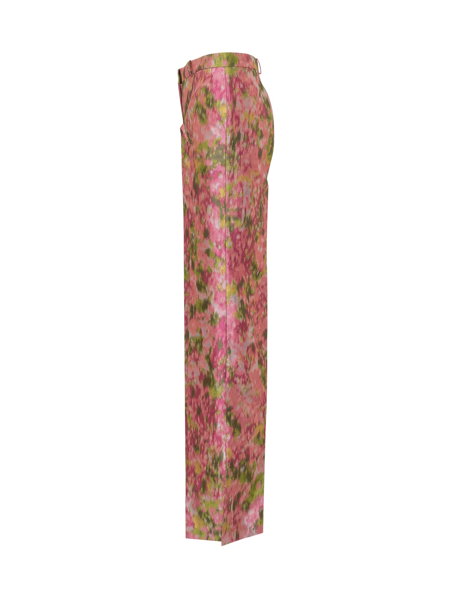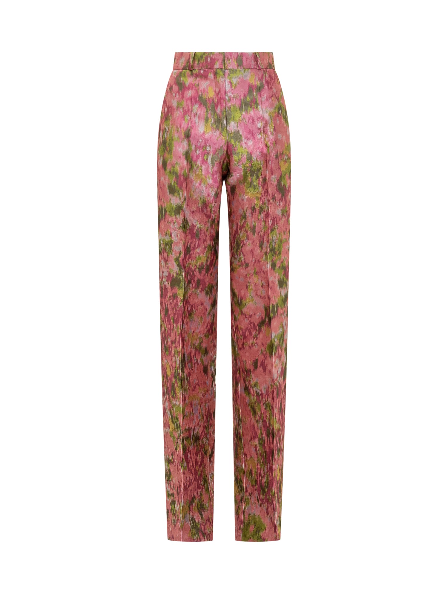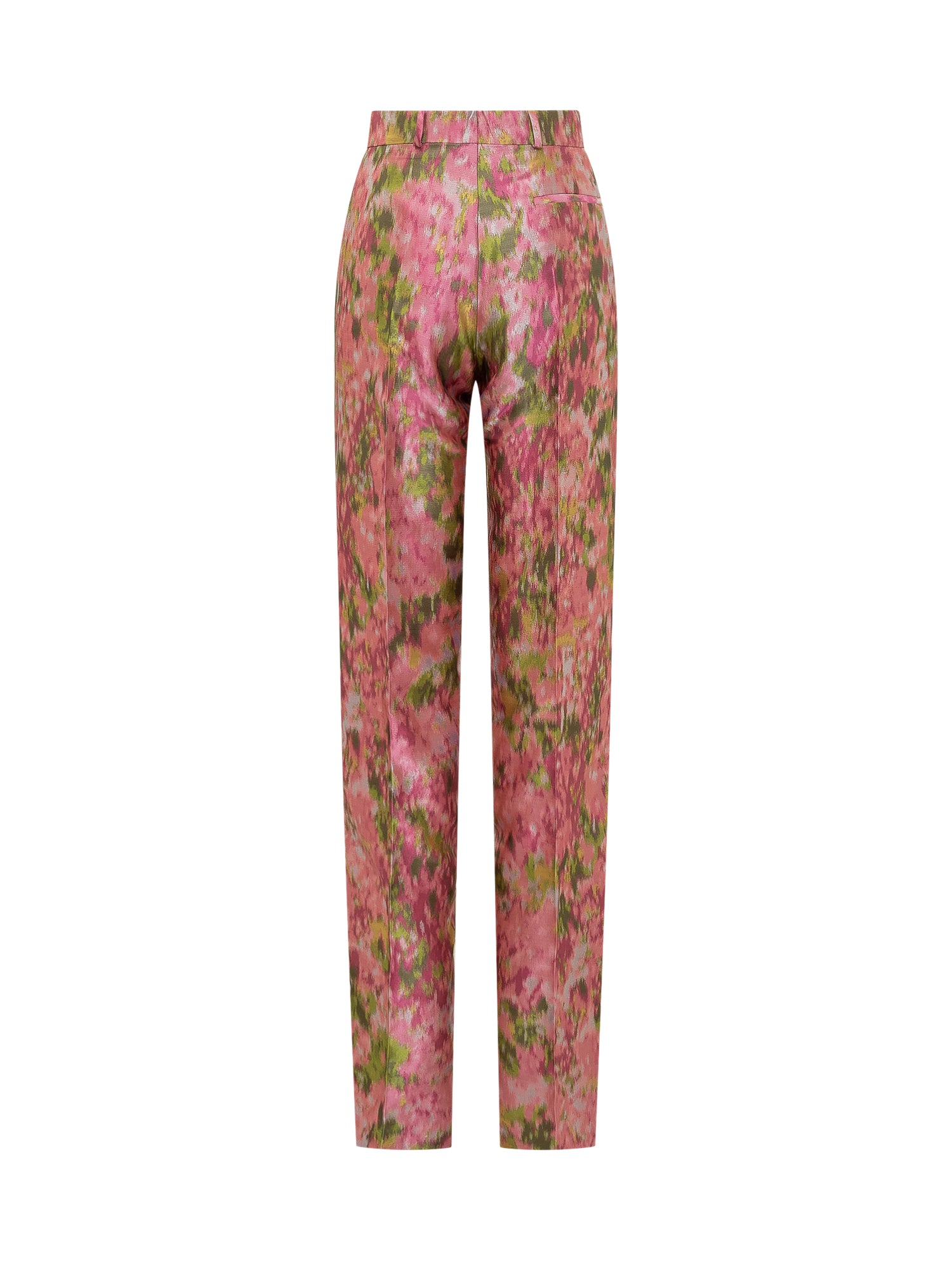 Pantaloni a sigaretta. Chiusura con zip e gancino. Passanti per cintura. Tre tasche. Spacchi laterali alle caviglie. Motivo fantasia.