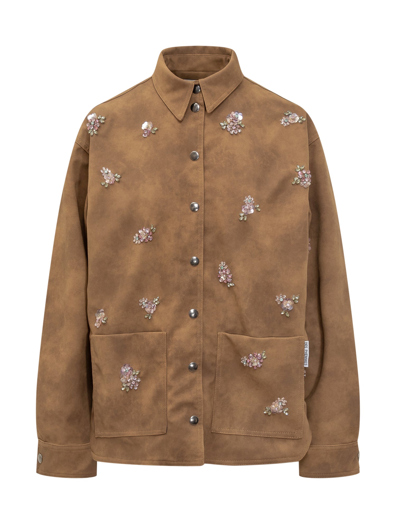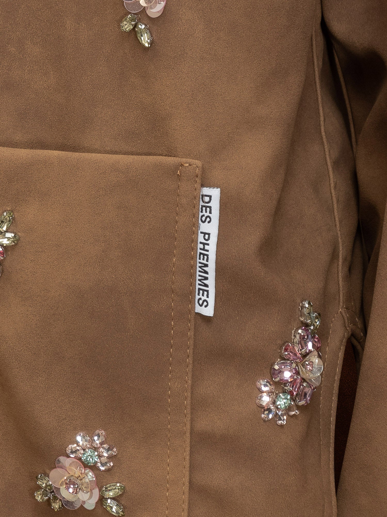 Camicia Des Phemmes in tessuto scamosciato marrone con applicazioni floreali ricamate e dettagli gioiello.