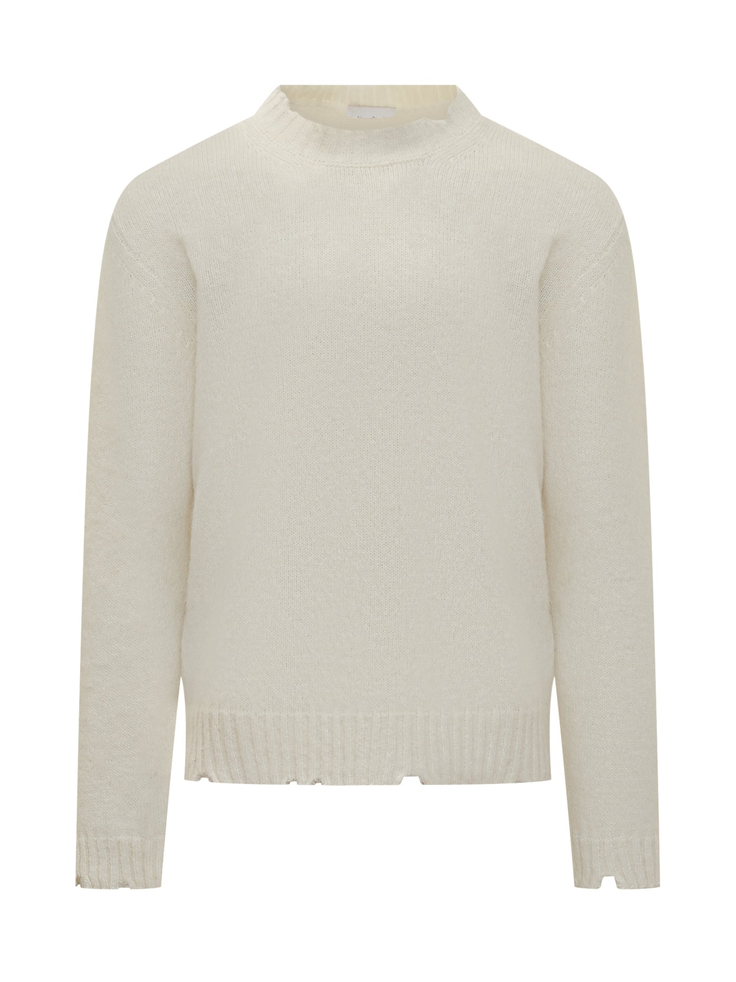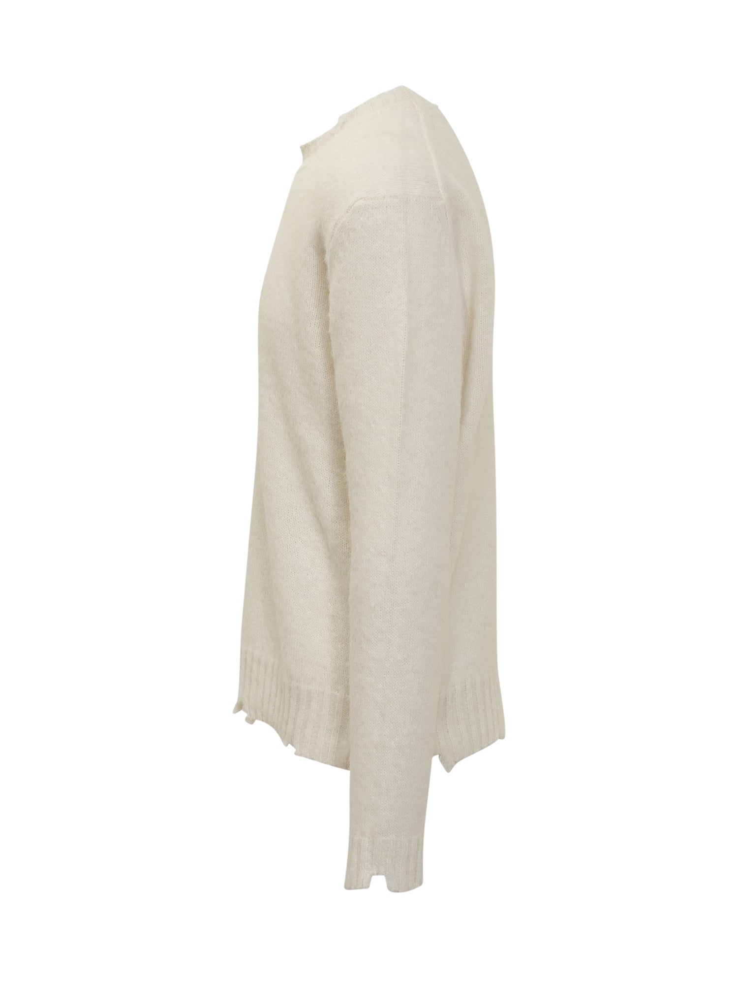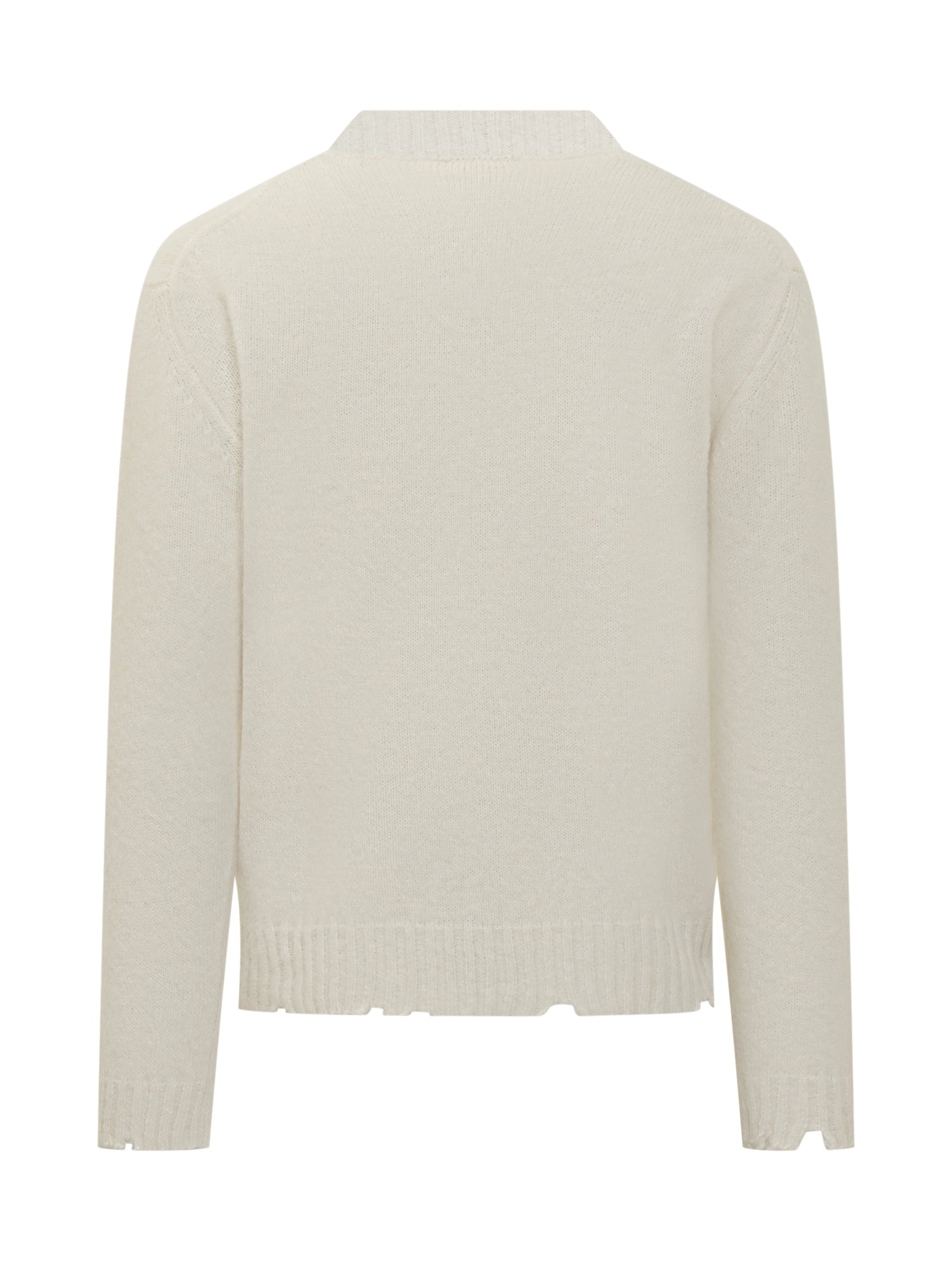 Maglione Diana Studio bianco in lana con finiture sfrangiate su bordo e polsini.