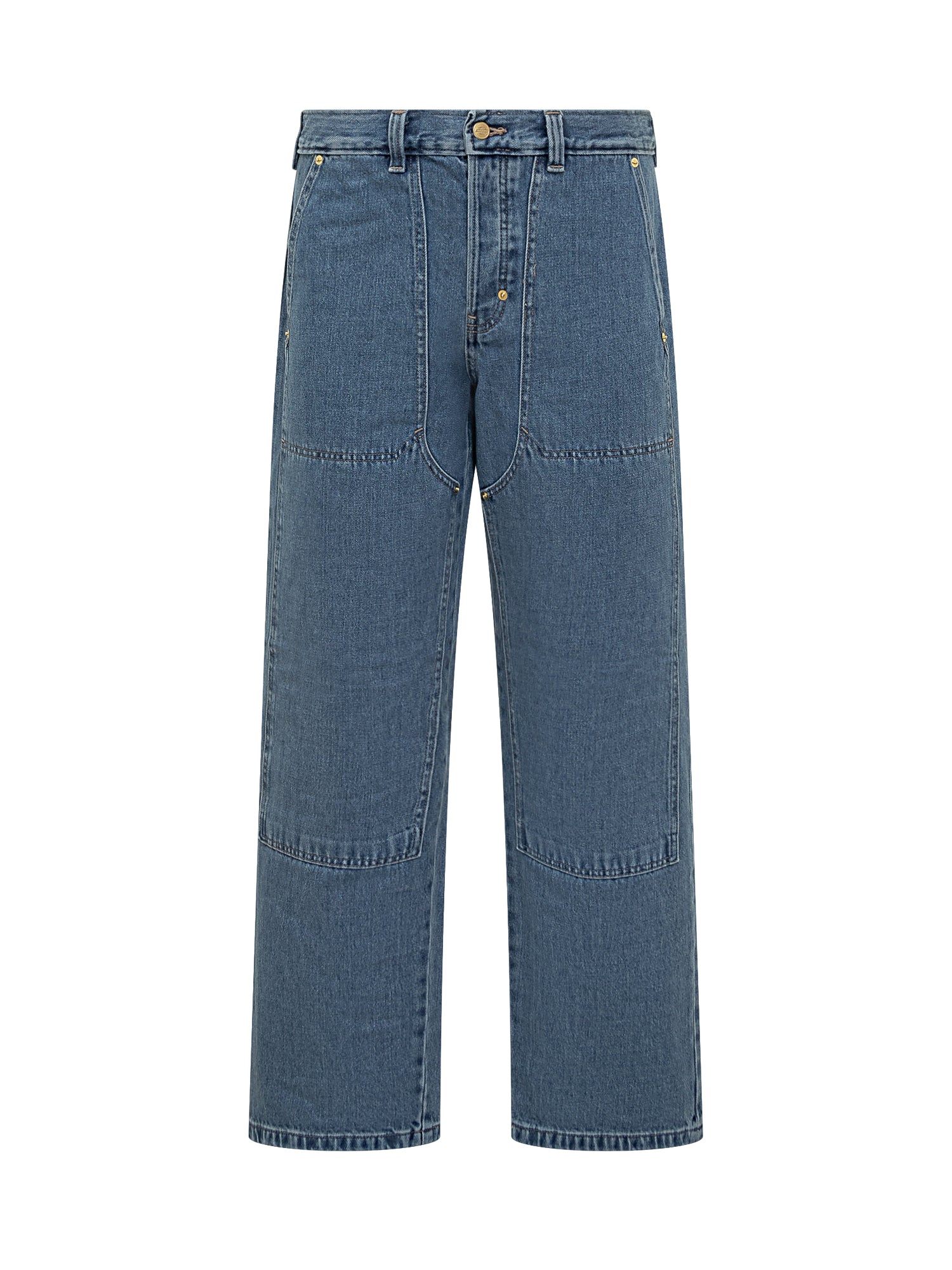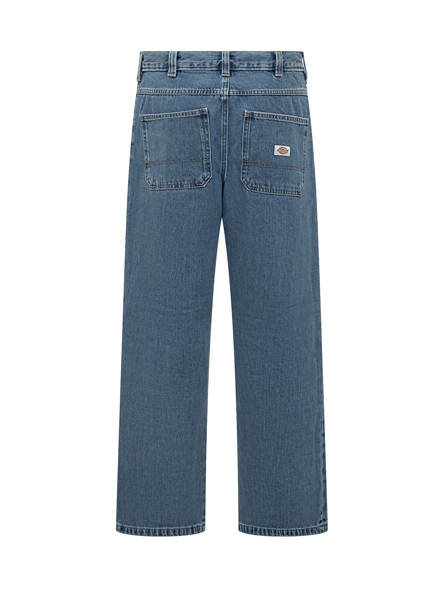 Chiusura con bottoni. Jeans Dickies Threads in denim blu con cuciture rinforzate e tasche applicate. Taglio dritto e vita media.
