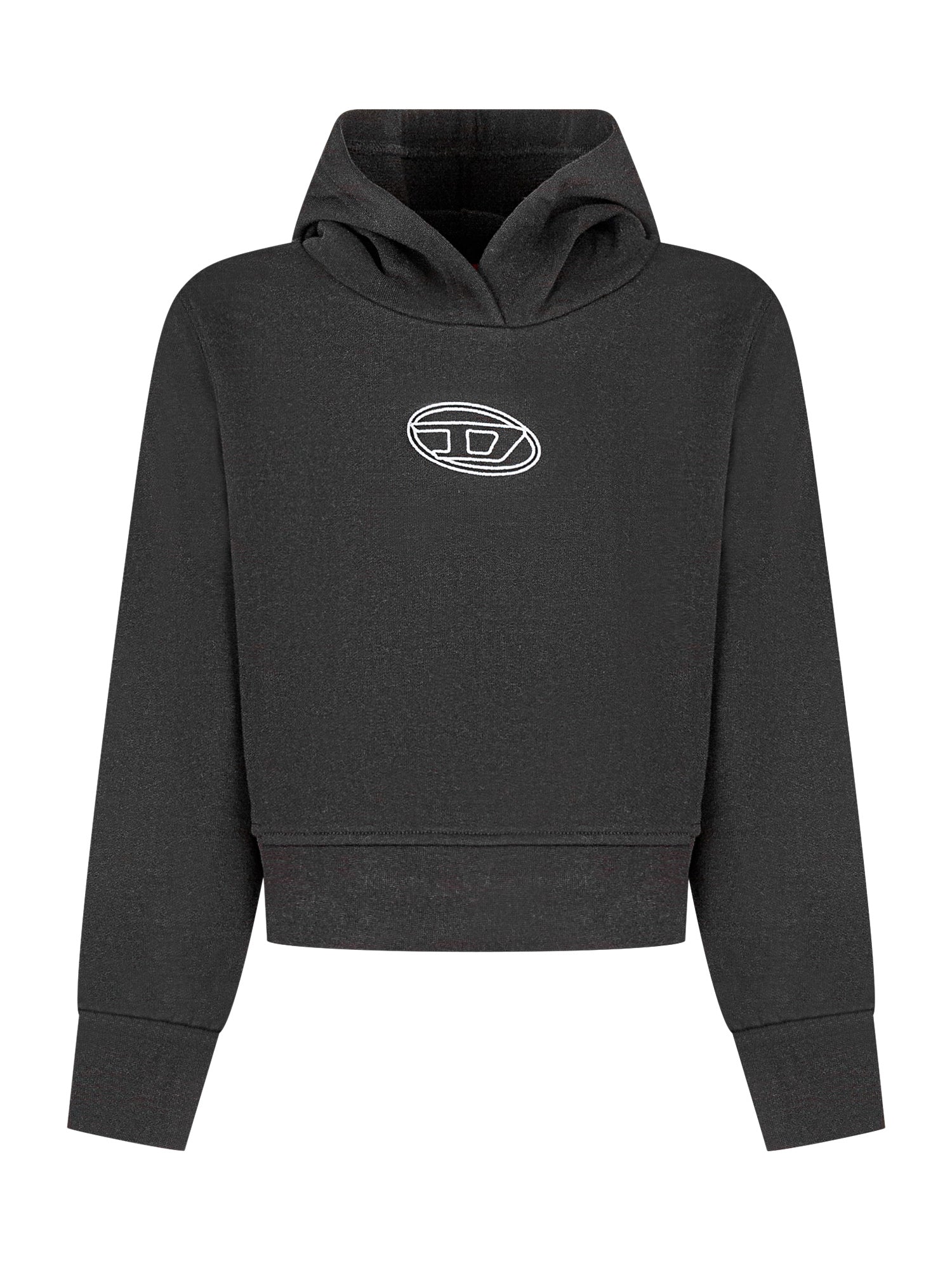Felpa nera con cappuccio in morbido cotone, impreziosita dal logo ovale Diesel ricamato.