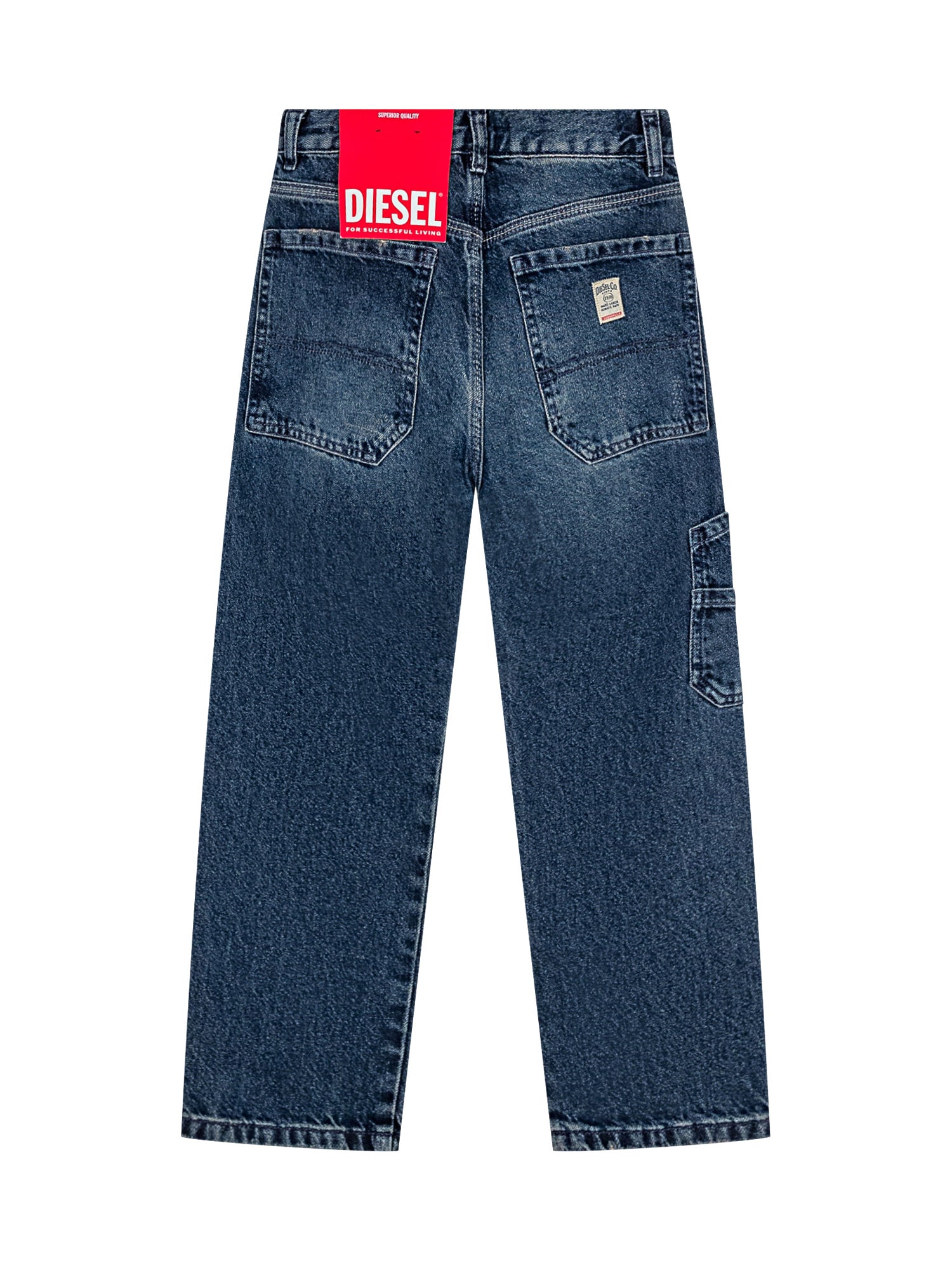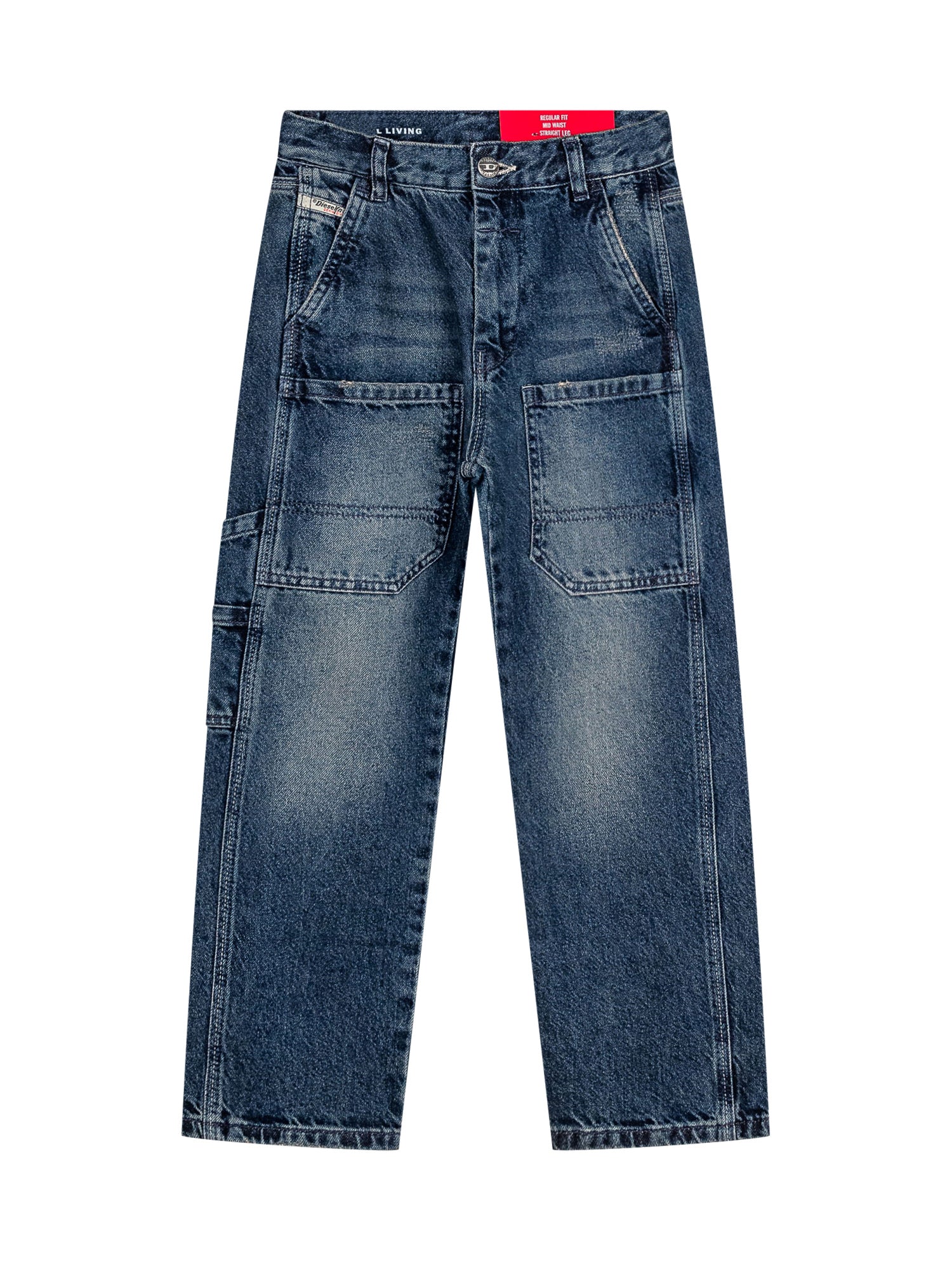 Jeans cargo blu in denim con tasche applicate frontali e vestibilità dritta.