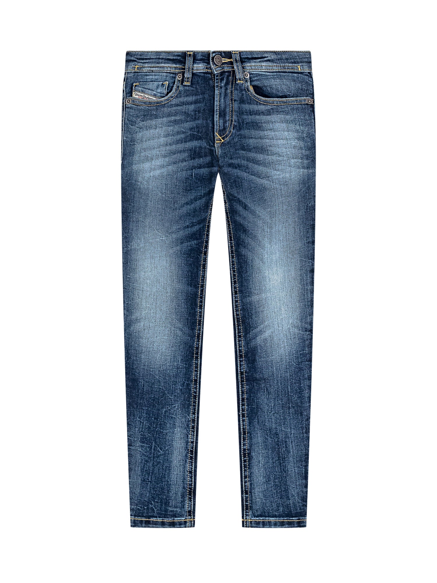Jeans in denim blu con lavaggio sfumato e dettagli effetto vissuto.
