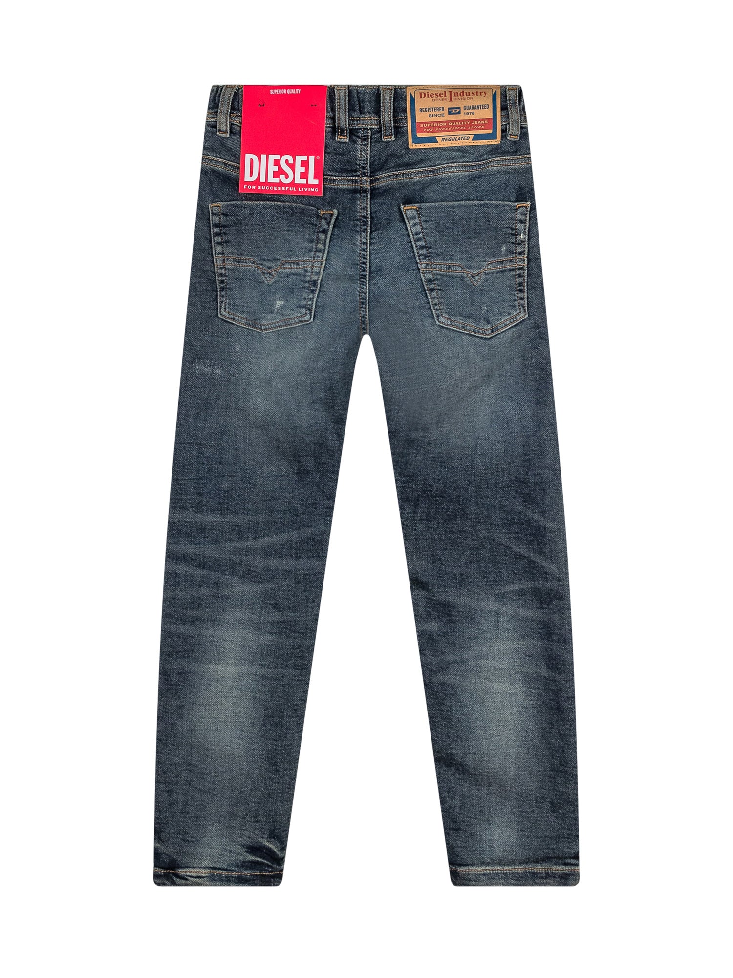 Jeans in denim blu con lavaggio effetto vissuto e dettagli leggermente consumati.