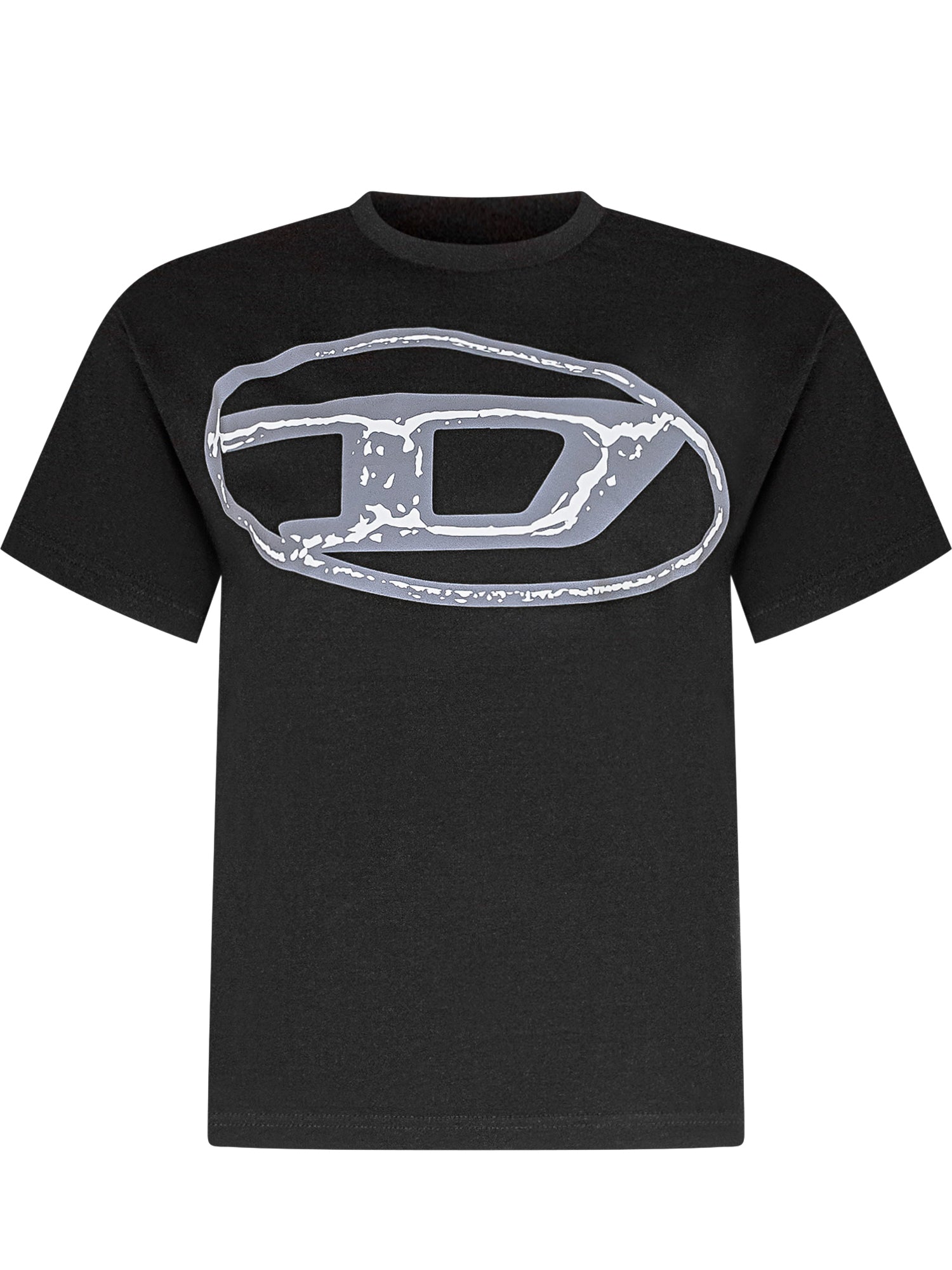 T-shirt nera in cotone con girocollo e grande stampa frontale Oval D effetto vissuto.