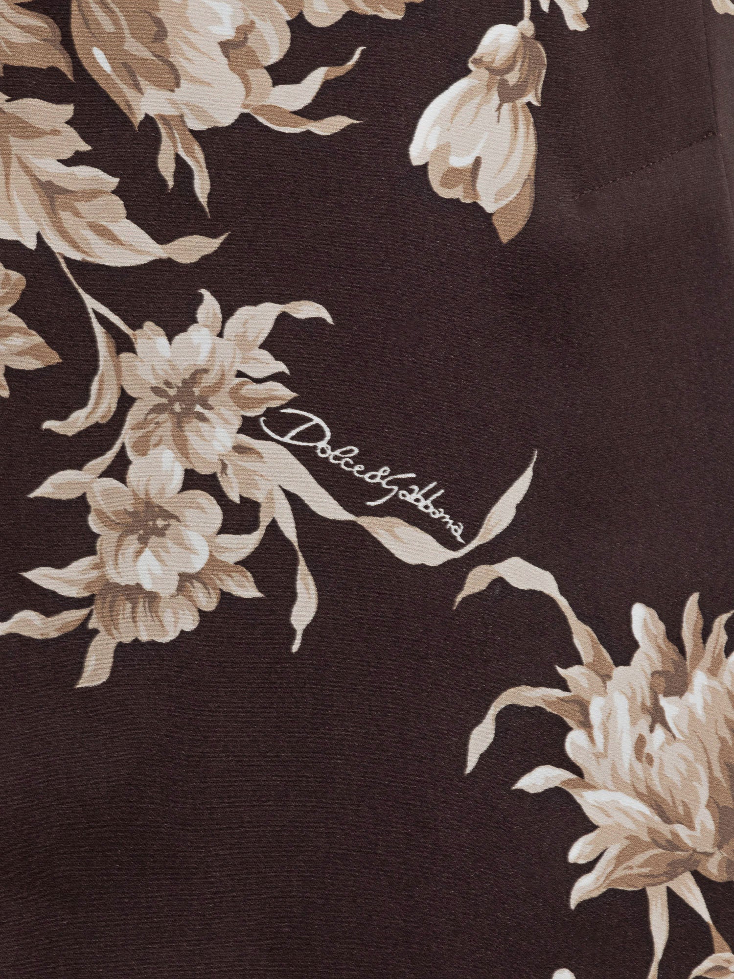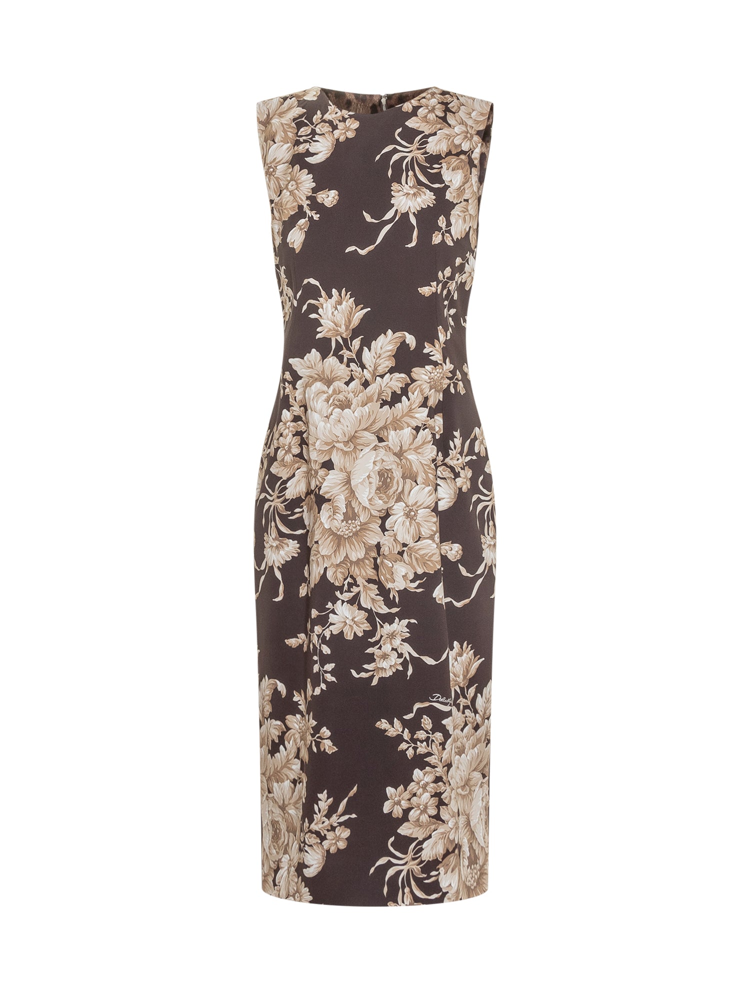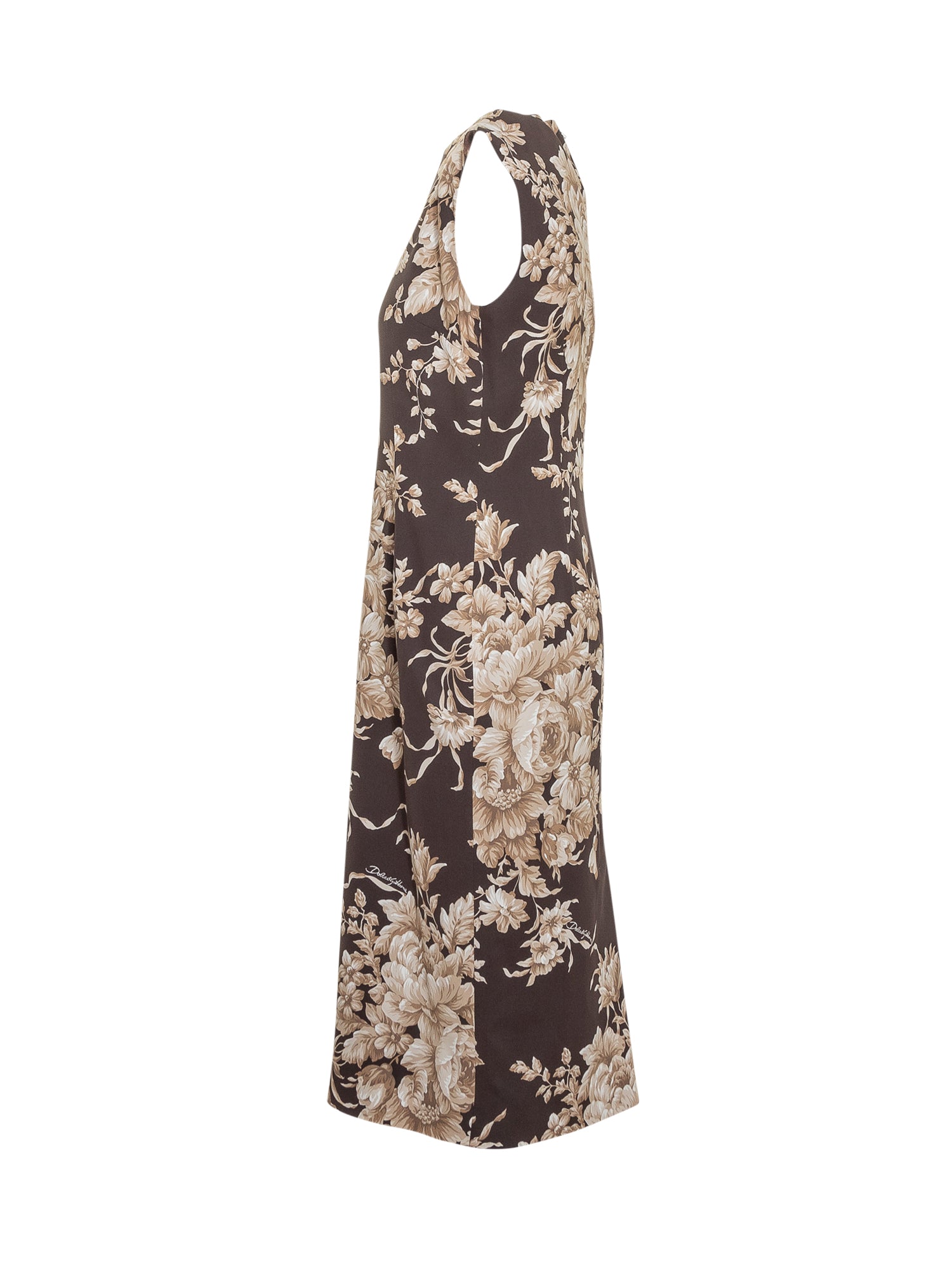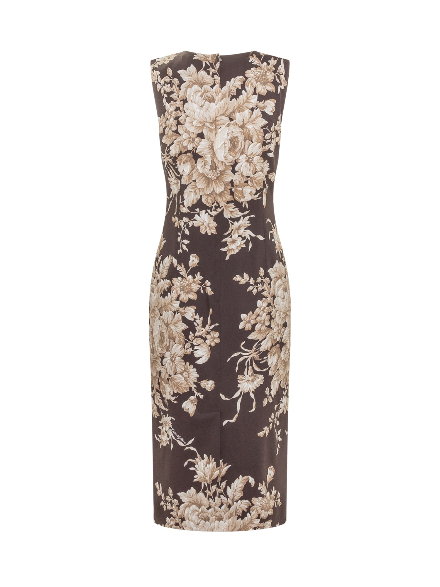 Elegante abito senza maniche firmato Dolce & Gabbana con raffinata stampa floreale beige su base marrone. Silhouette aderente e taglio midi.