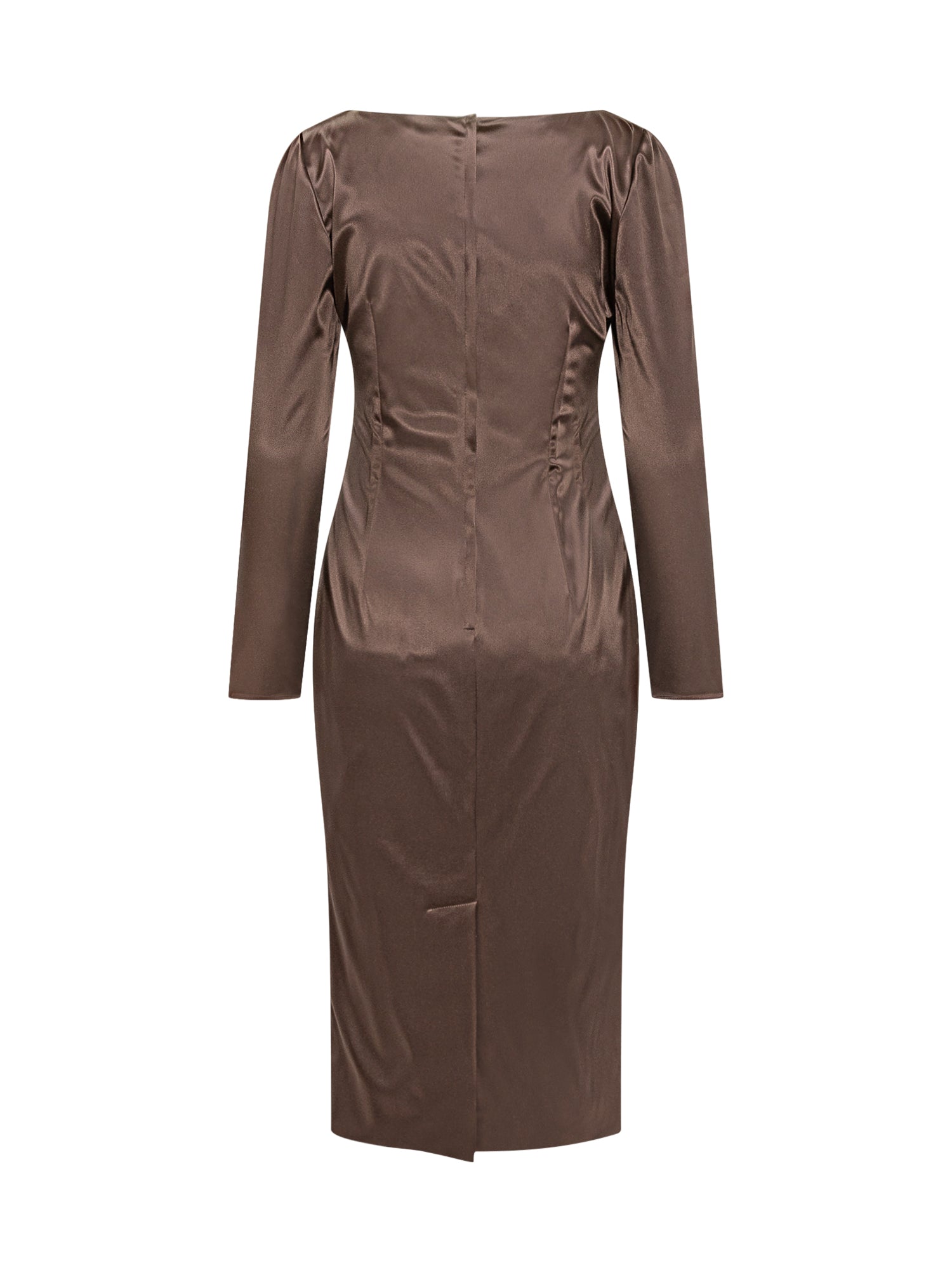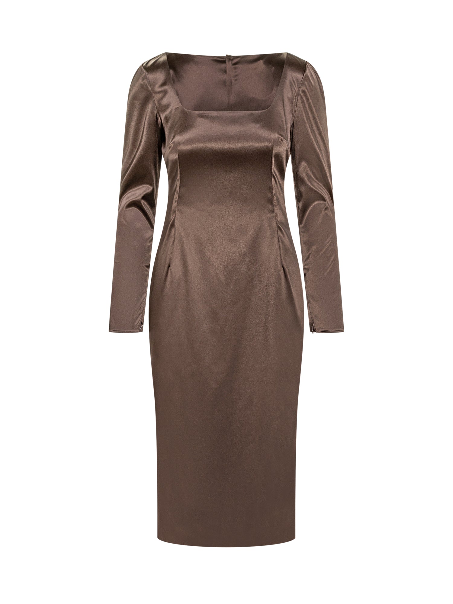 Eleganza minimal per questo abito Dolce & Gabbana in raso marrone. Linea aderente, scollo dritto e maniche lunghe.