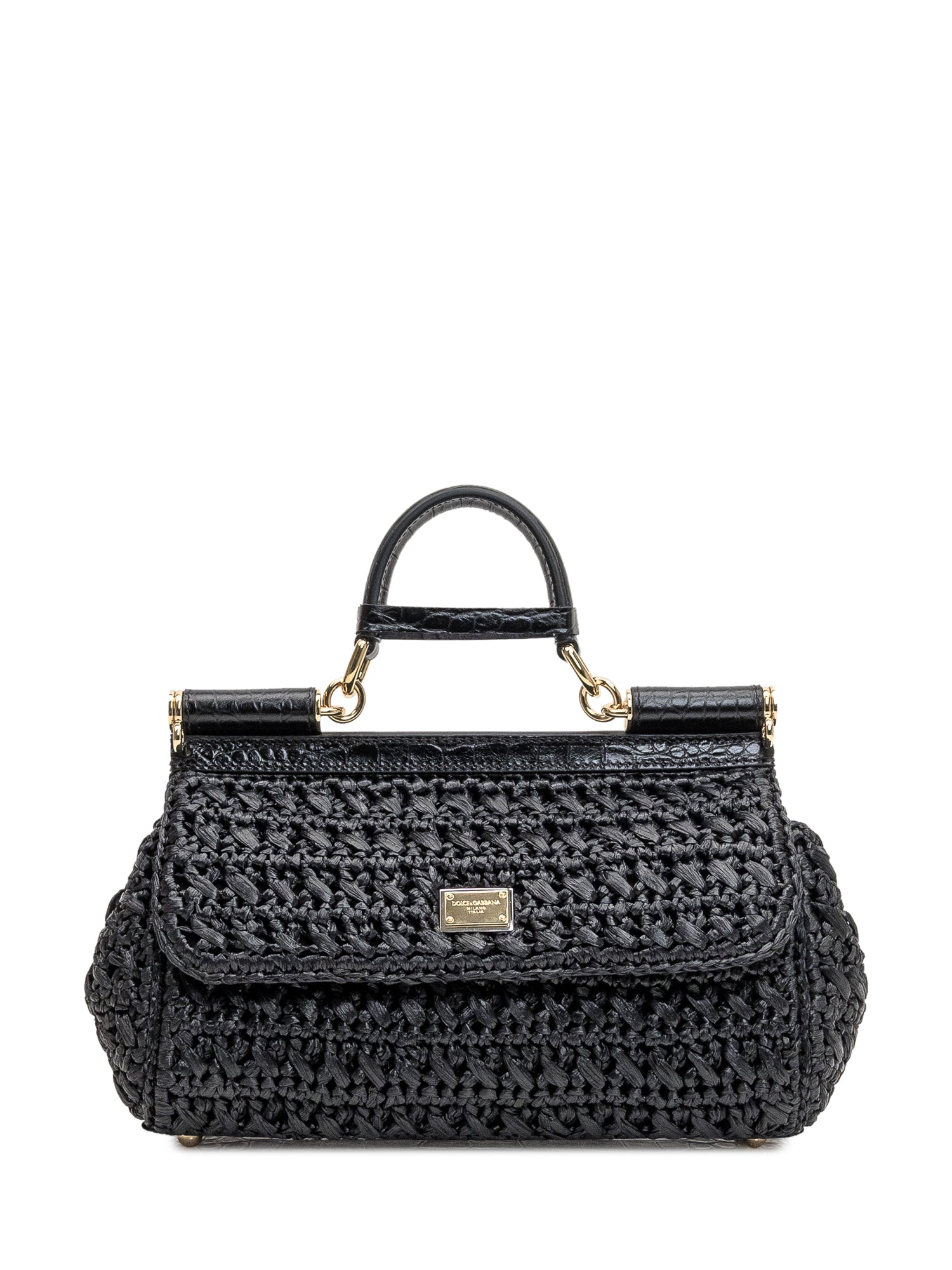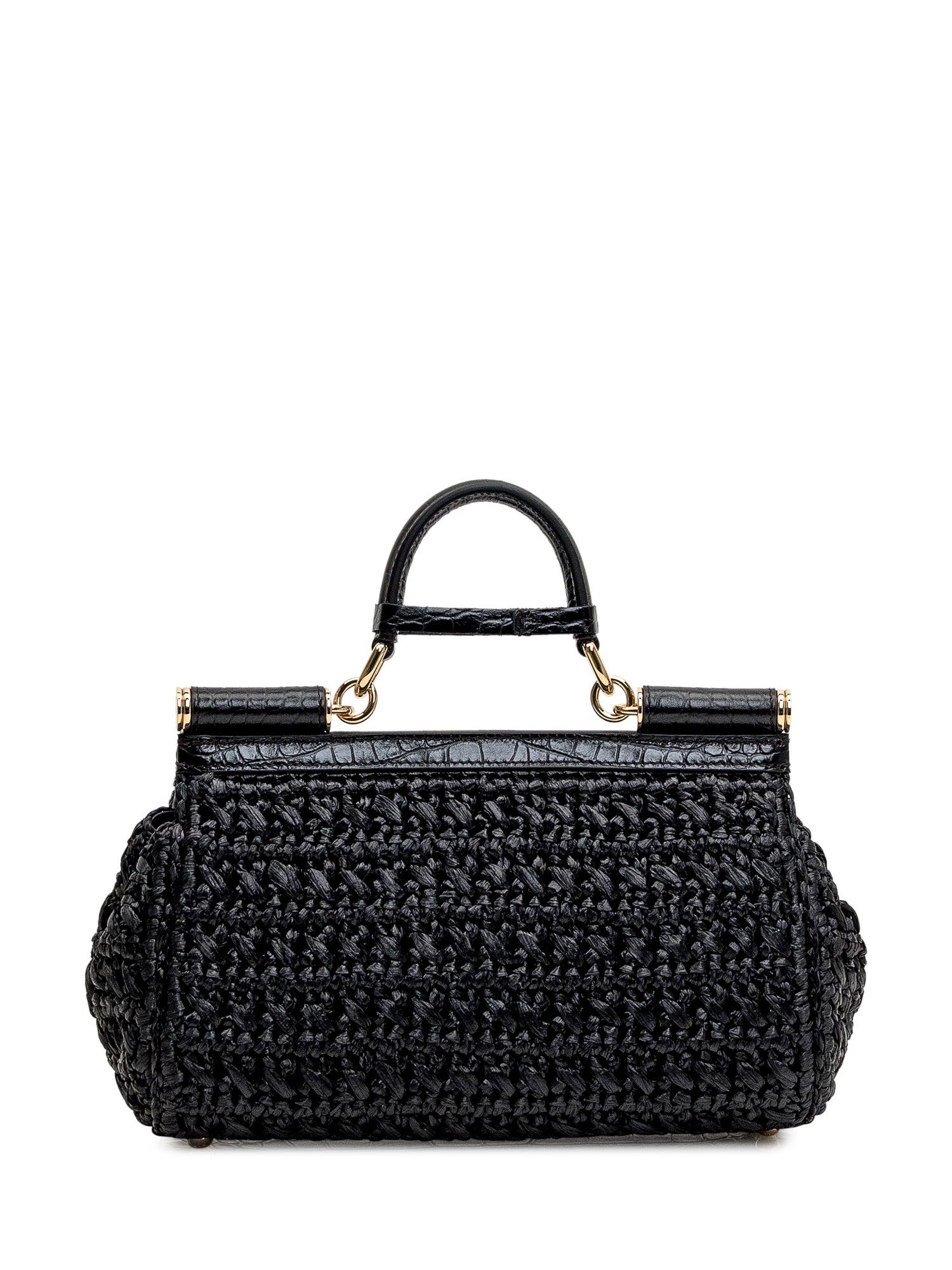 Borsa a mano color nera in pelle intrecciata. Un manico. Tracolla regolabile e rimovibile in pelle. Uno scomparto interno. Tasca con zip interna. Chiusura con patta con bottoni. Targhetta logata in metallo dorato sul davanti.