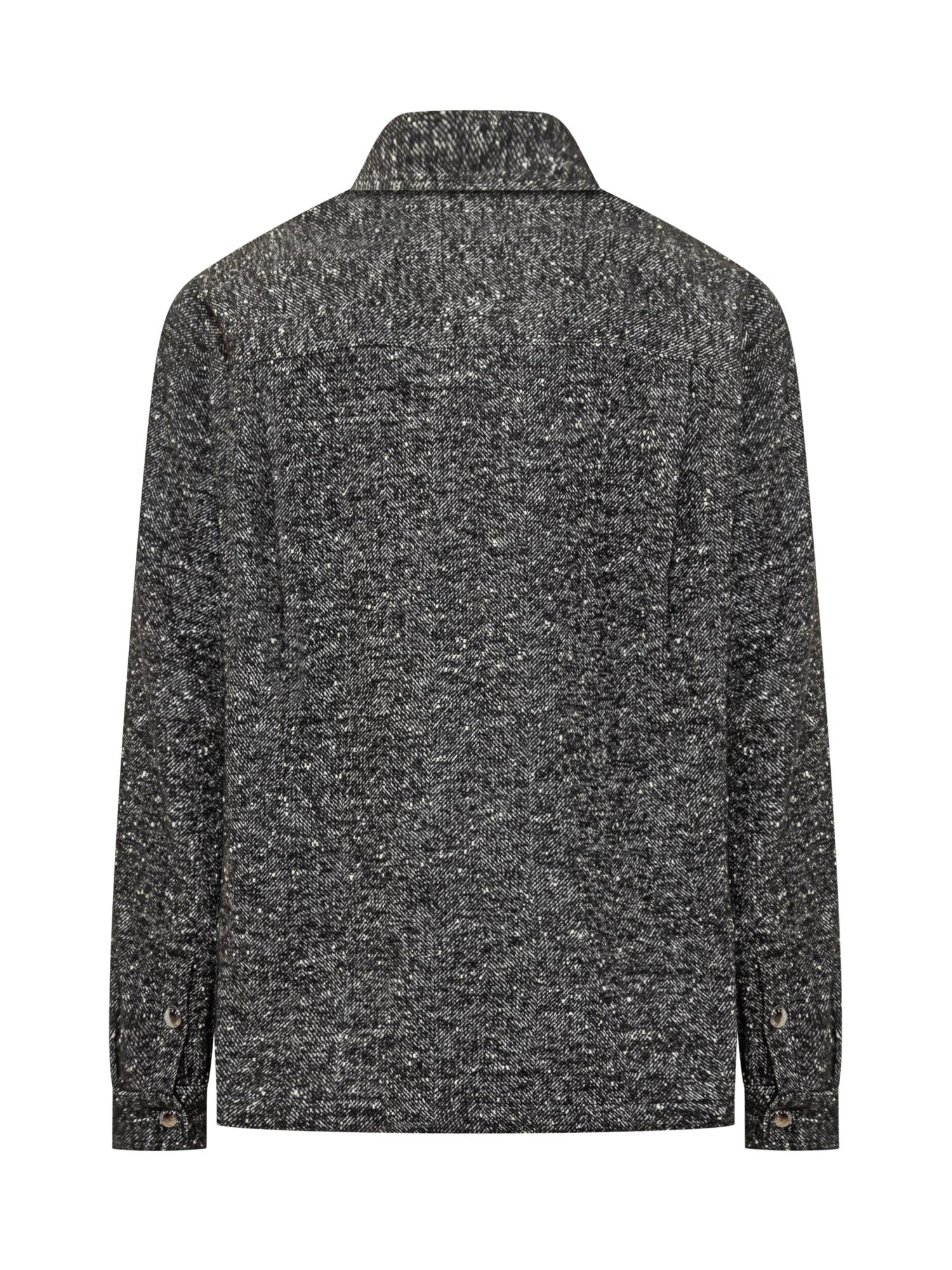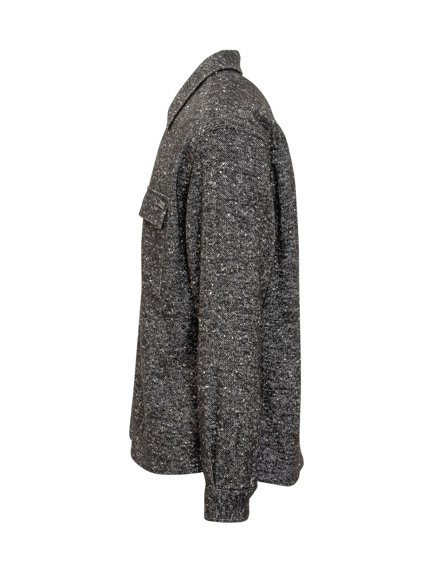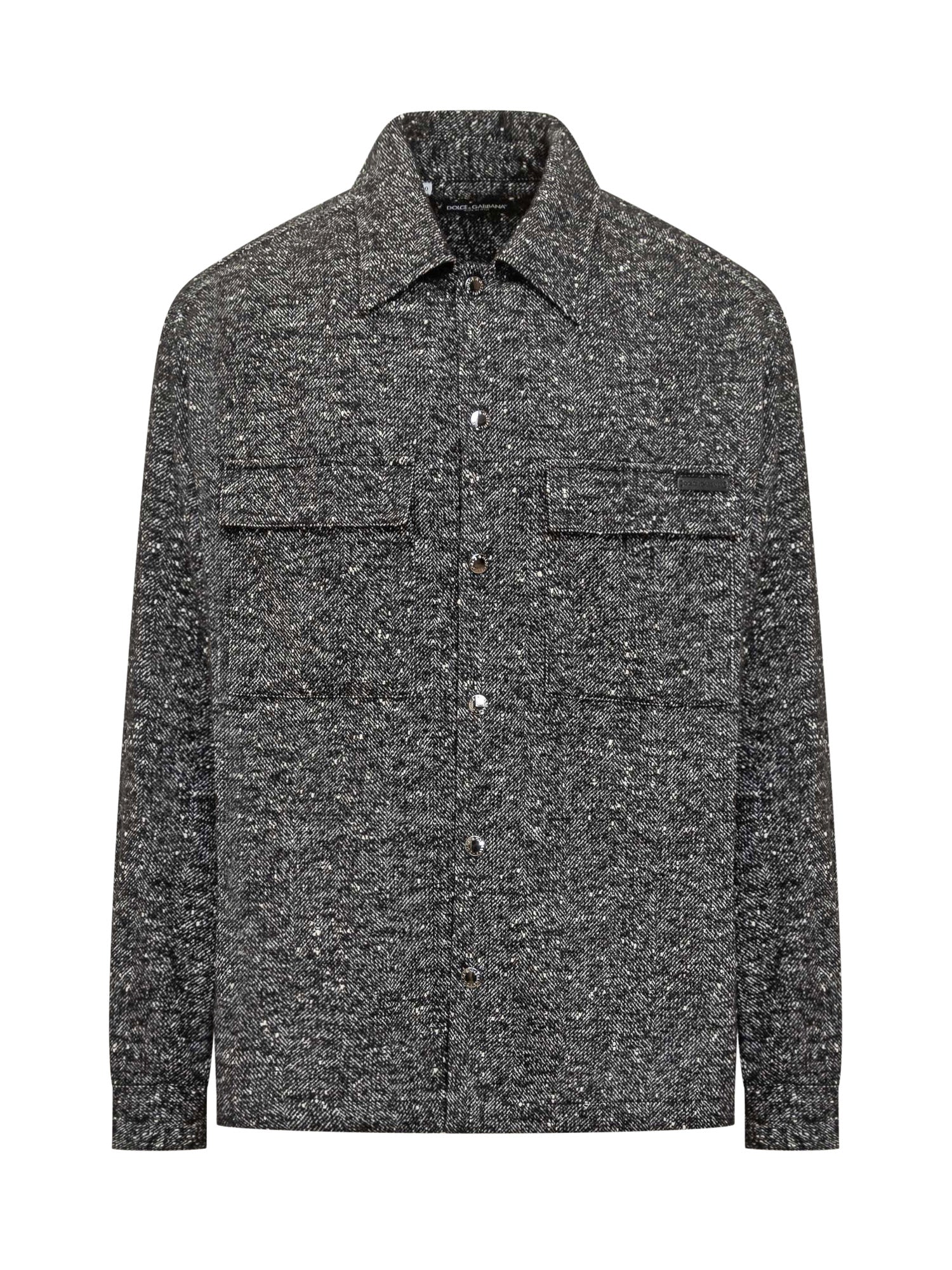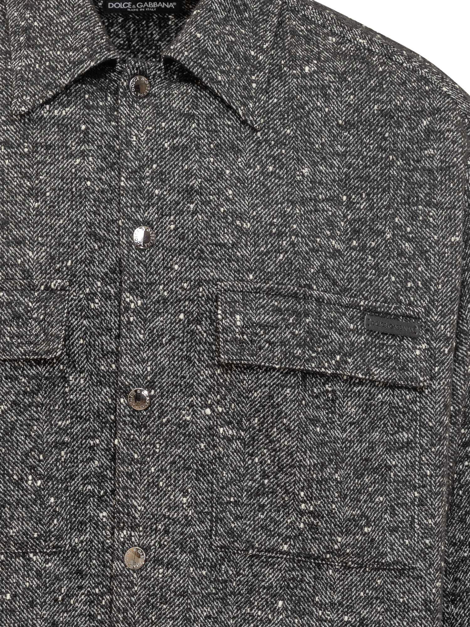 Camicia giacca Dolce & Gabbana in tweed grigio con motivo chevron. Chiusura con bottoni a pressione e tasche frontali.