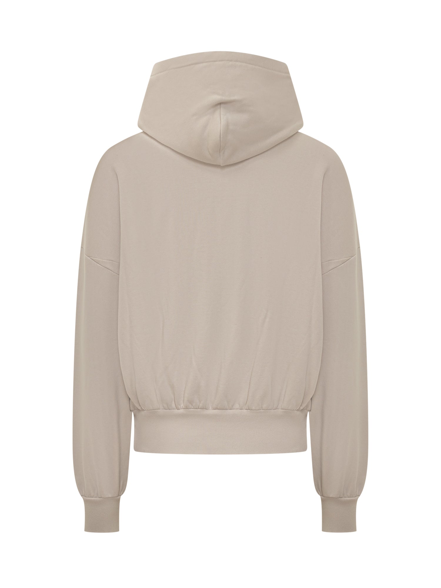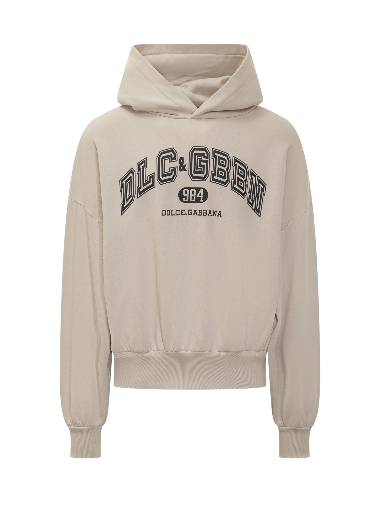 Felpa Dolce & Gabbana beige in cotone con cappuccio, polsini e fondo a costine. Stampa frontale DLC & GBBN 984 in stile college per un look casual dal carattere sportivo e moderno.