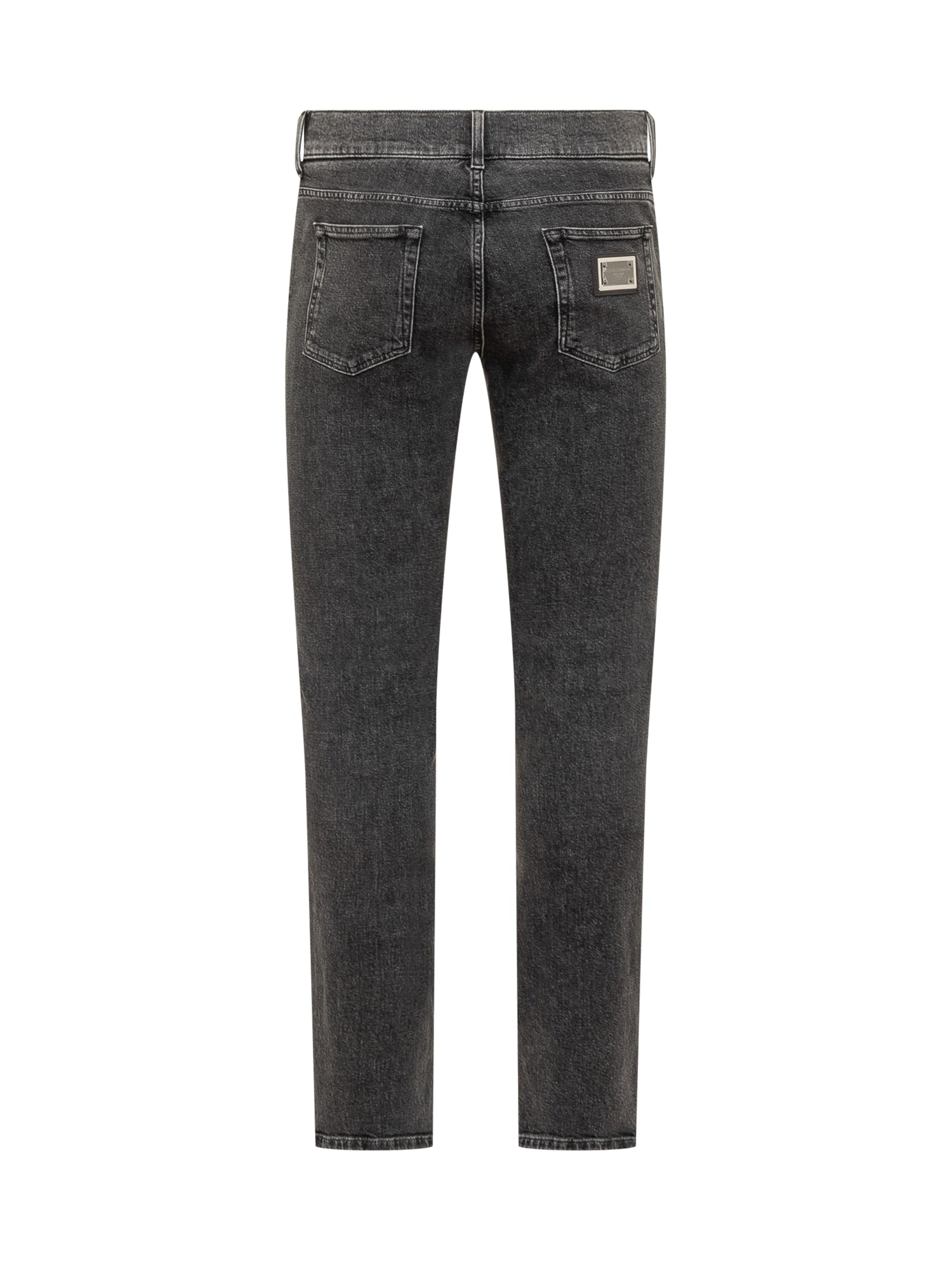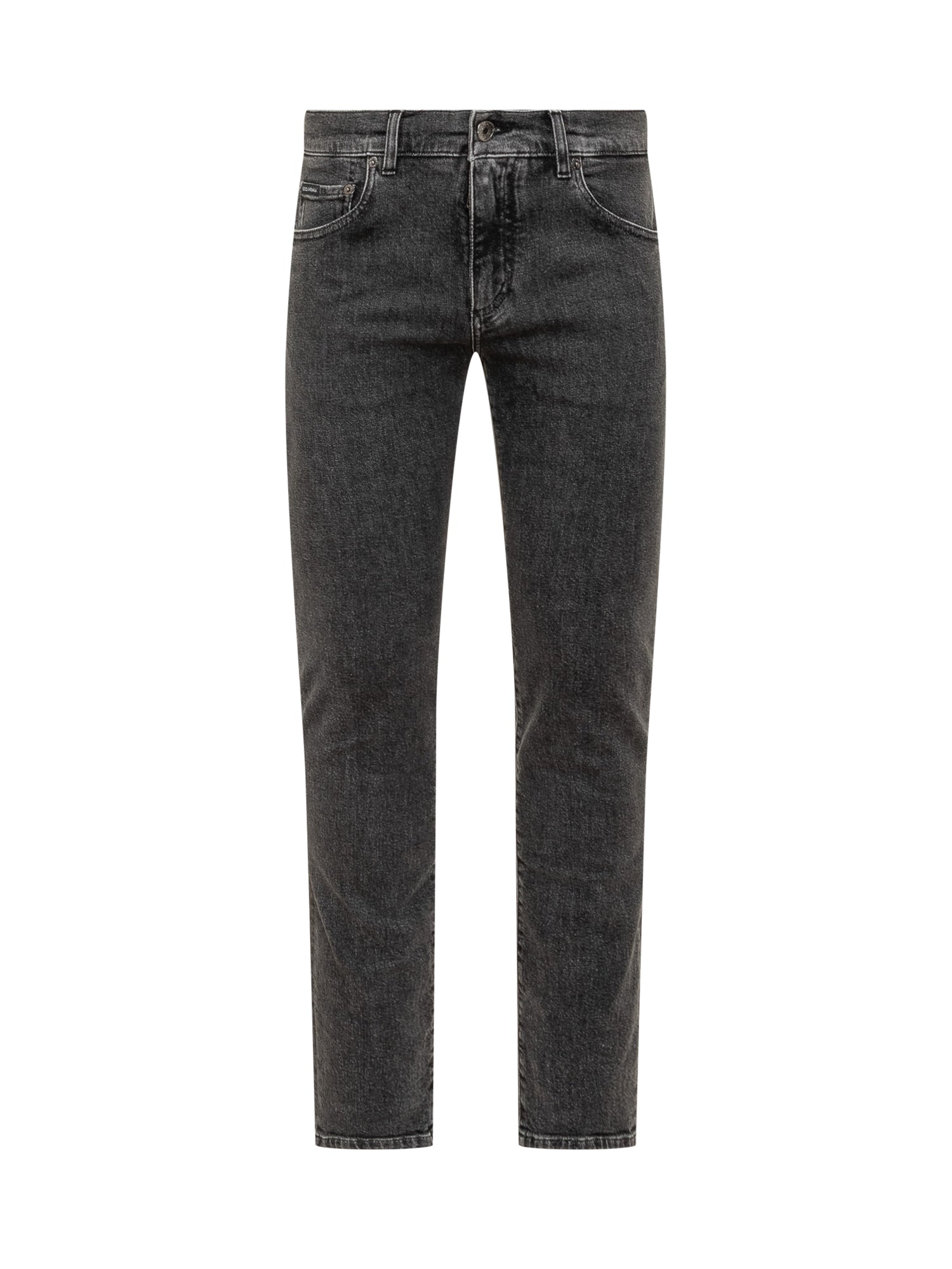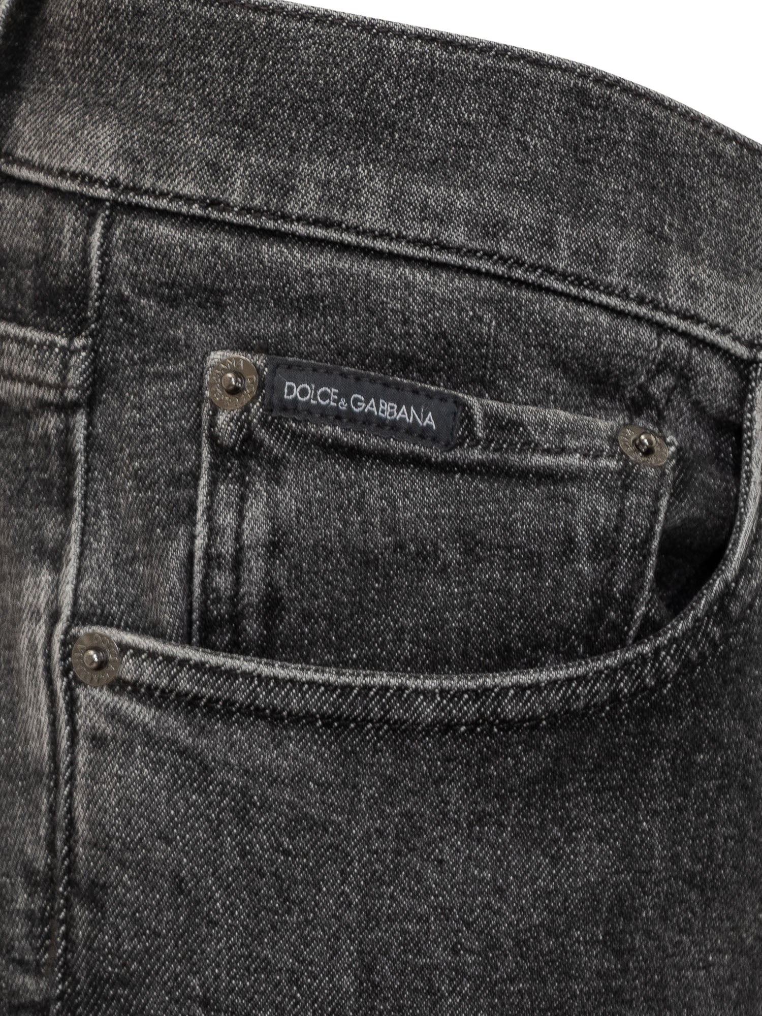 Jeans Dolce & Gabbana nero lavato con effetto used e cuciture a contrasto. Modello slim fit a cinque tasche.