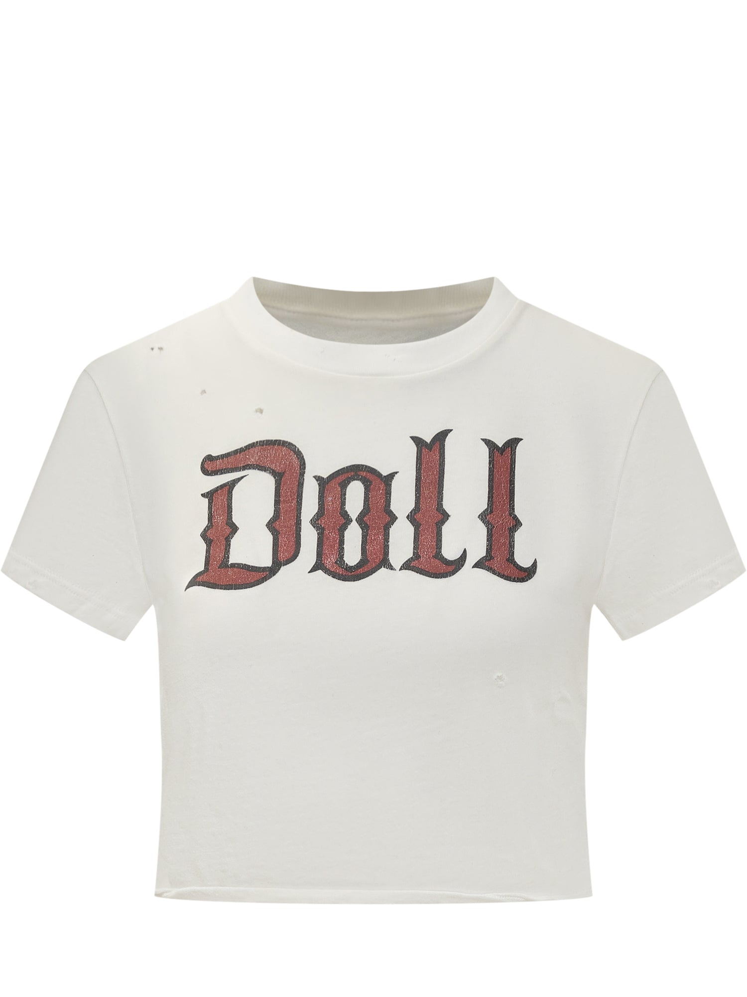 T-shirt crop Dolce & Gabbana bianca con stampa Doll sul davanti e dettagli distressed.