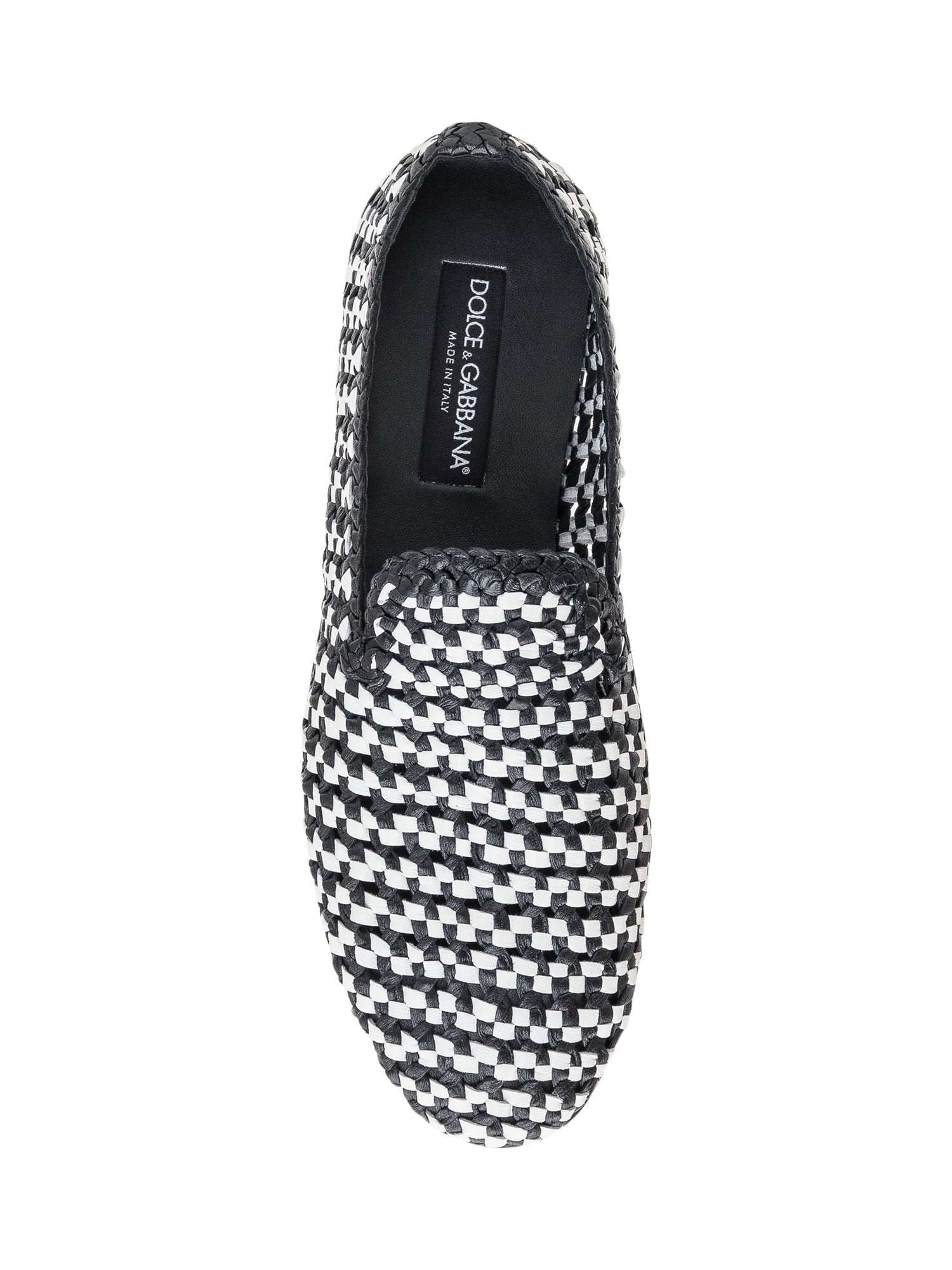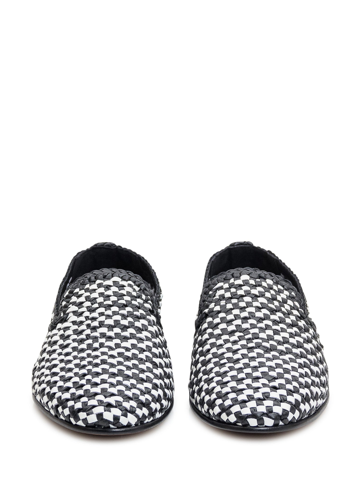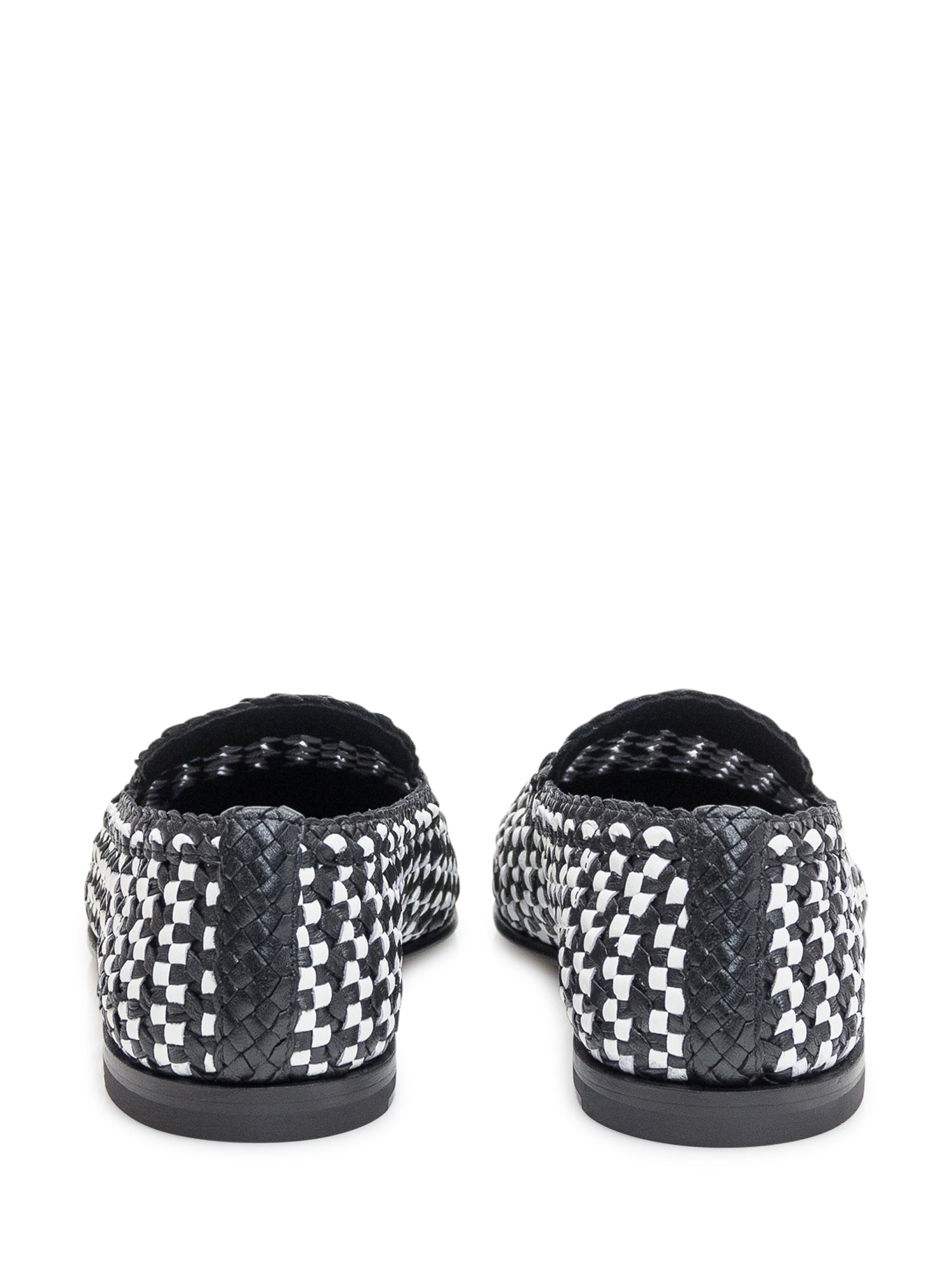 Scarpa bianca e nera in tessuto con lavorazione ad intreccio. Sottopiede in raso con etichetta logata. Suola logata in cuoio.
