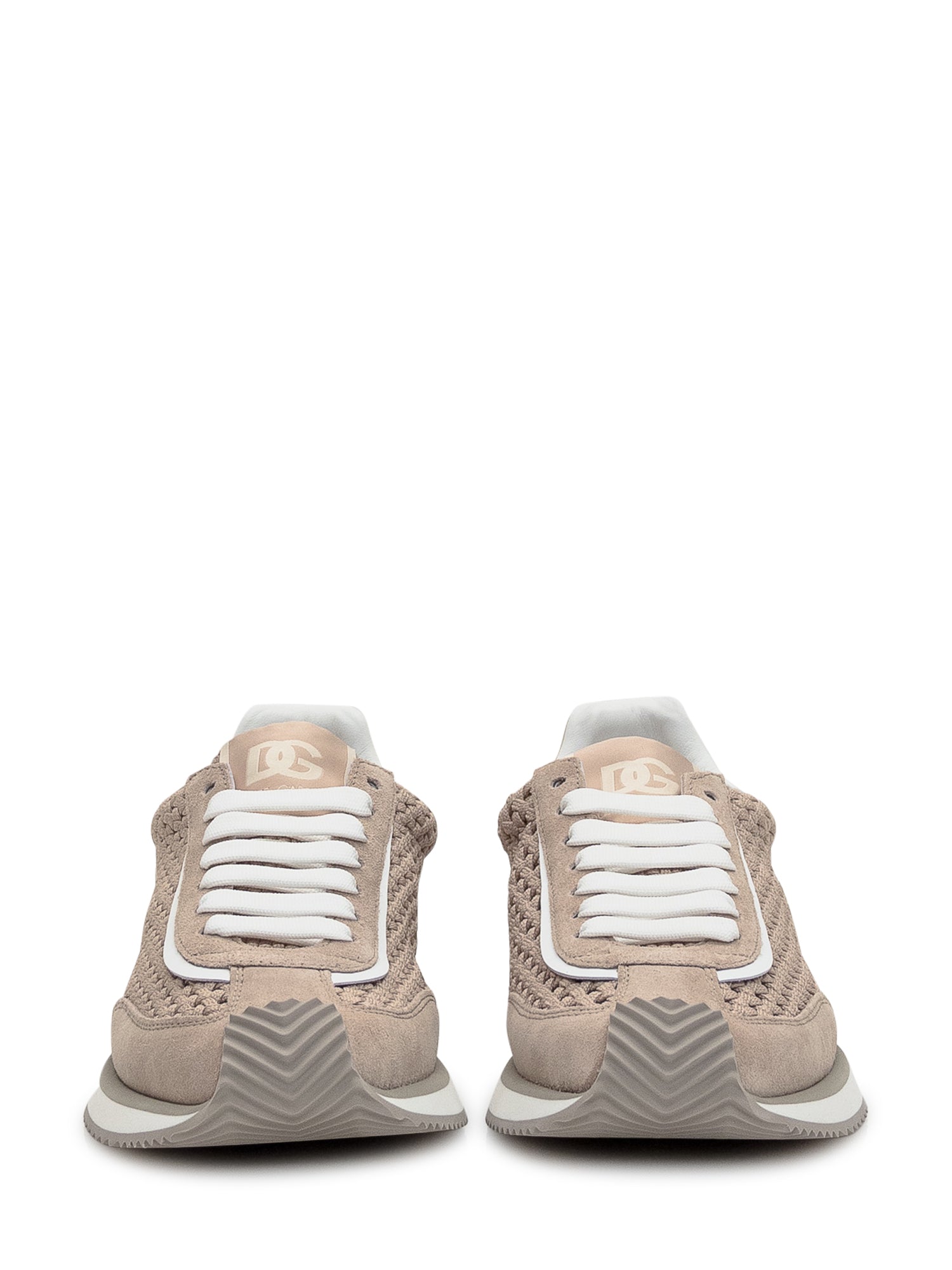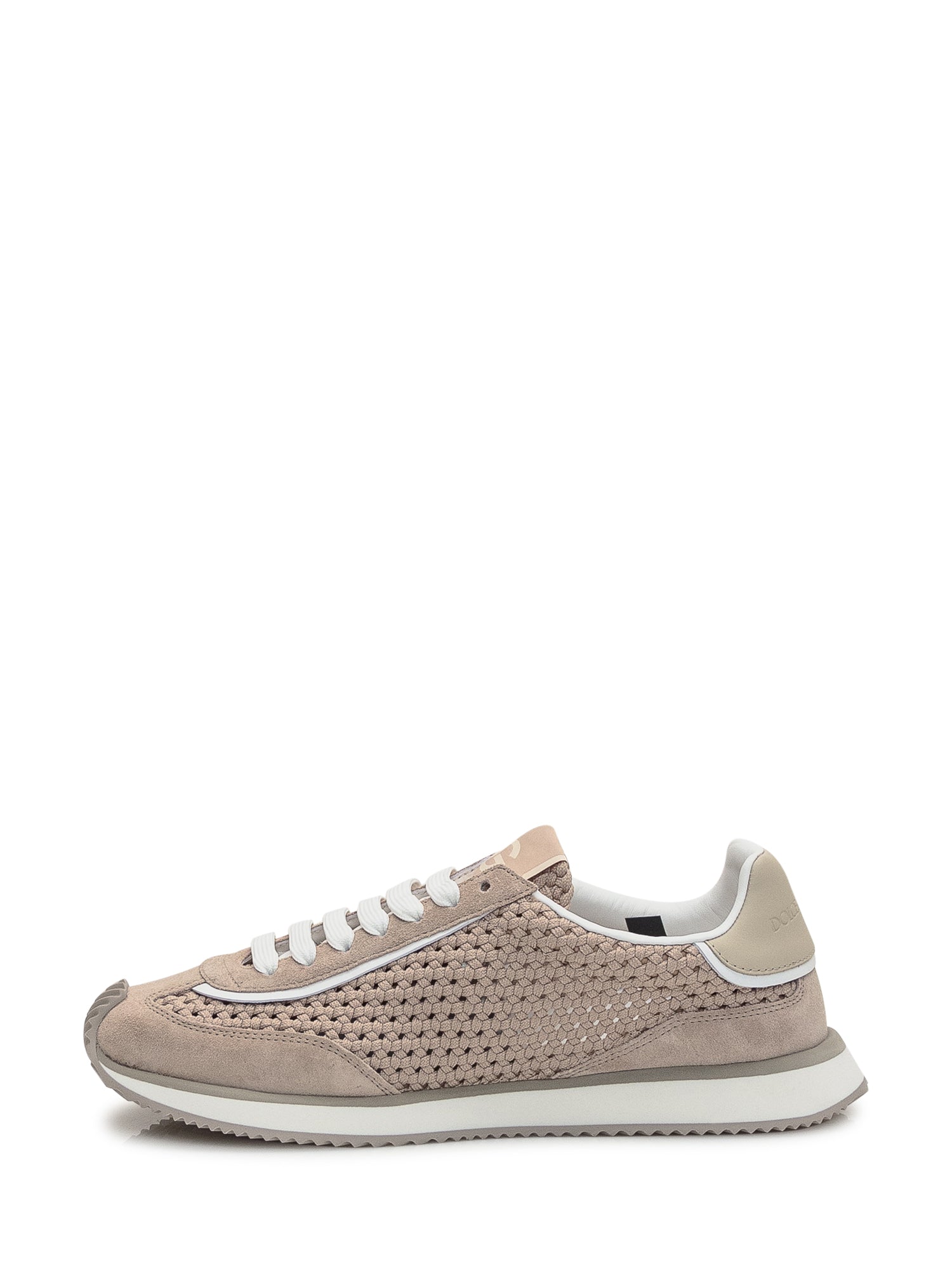 Sneaker beige con pattern ad intreccio. Linguetta logata. Fussbet con logo a fuoco. Fondo in gomma.