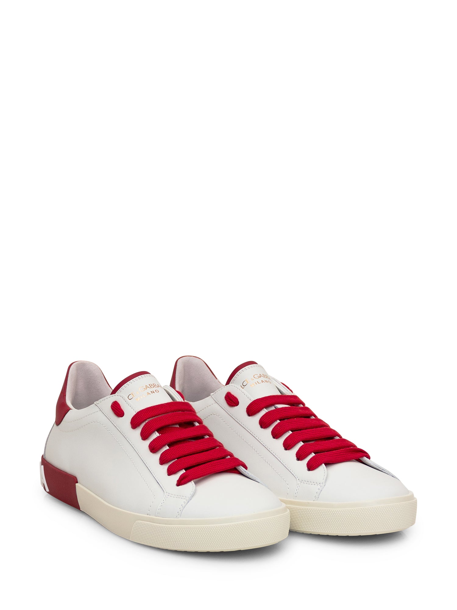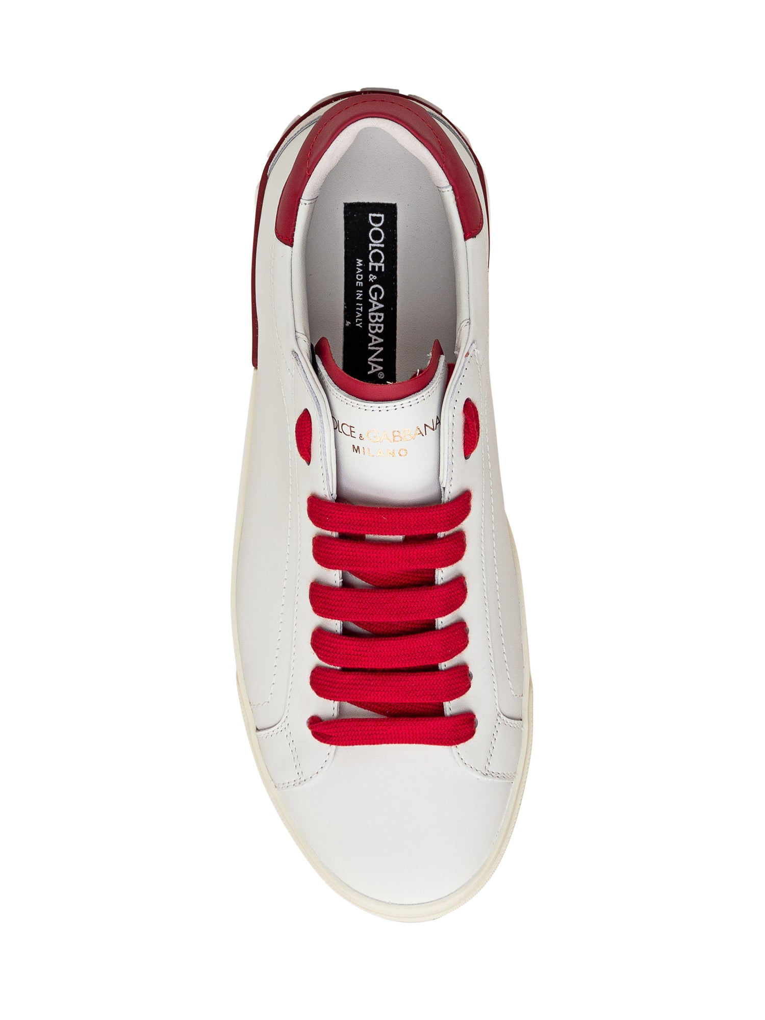 Sneaker bassa bianca e rossa. Chiusura con lacci. Logo su liguetta. Tallone lacci a contrasto.