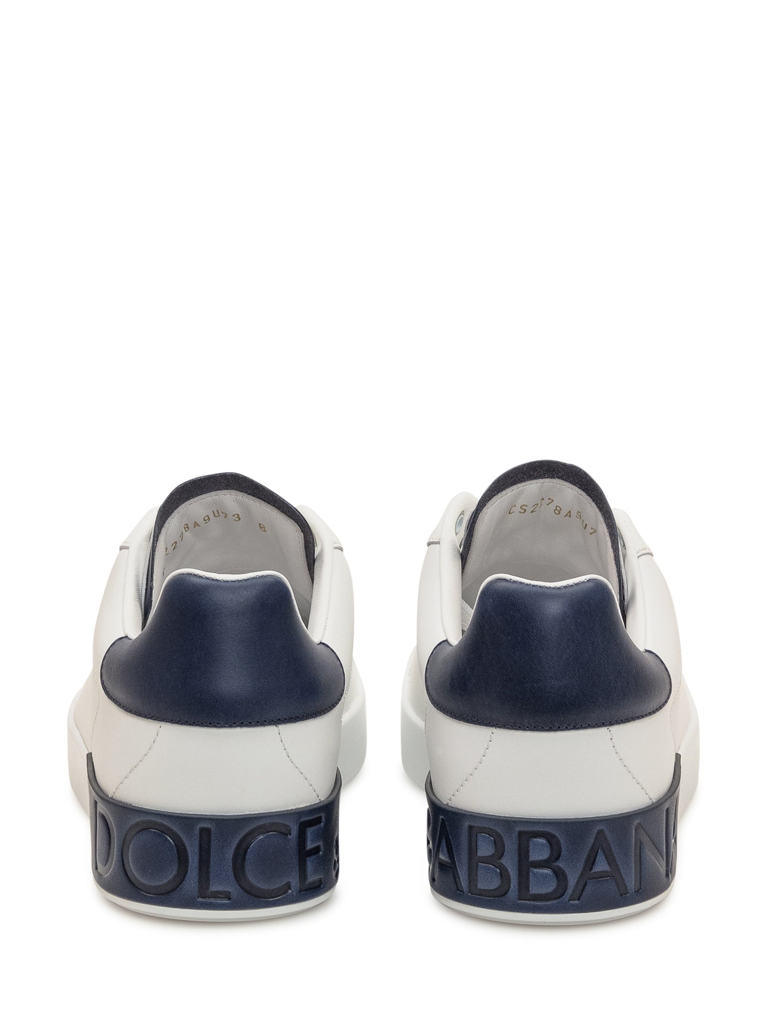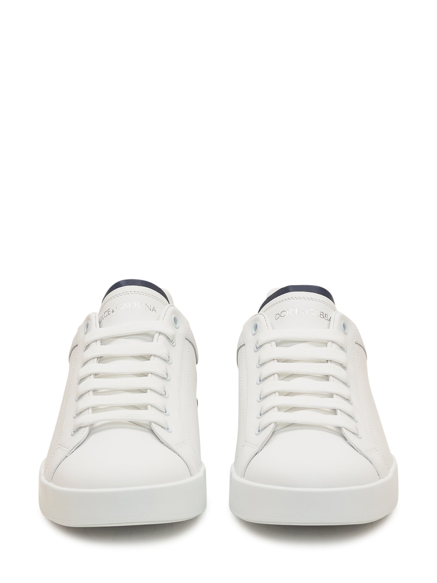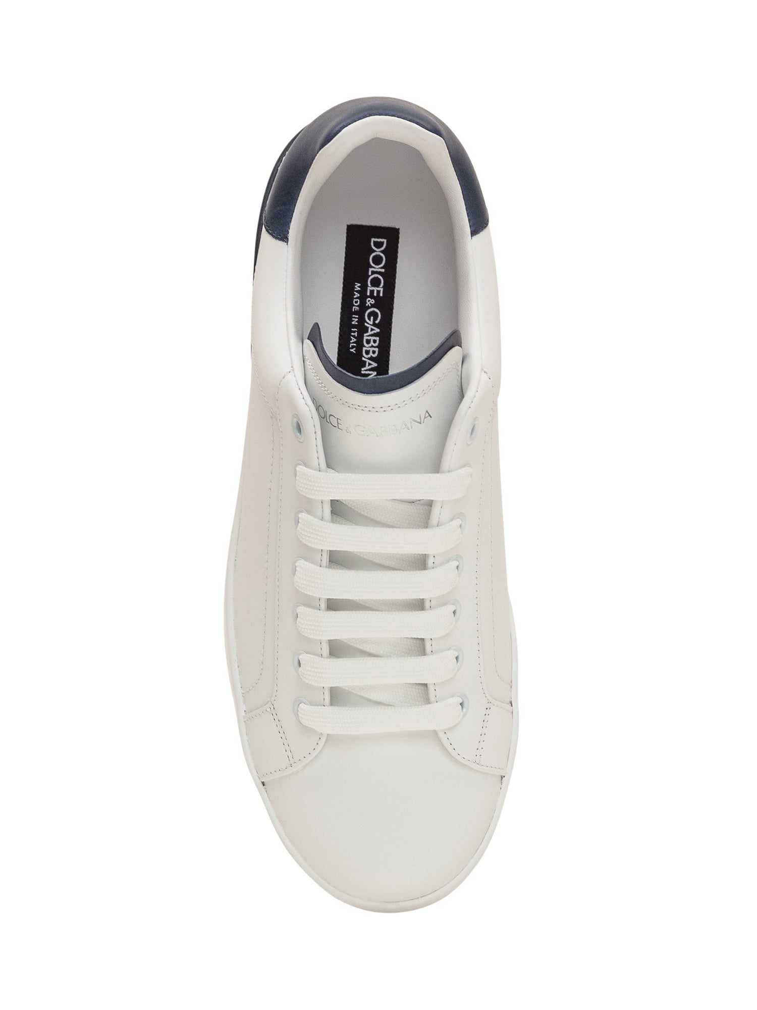 Sneaker Dolce & Gabbana in pelle bianca con dettagli blu navy su tallone e suola.