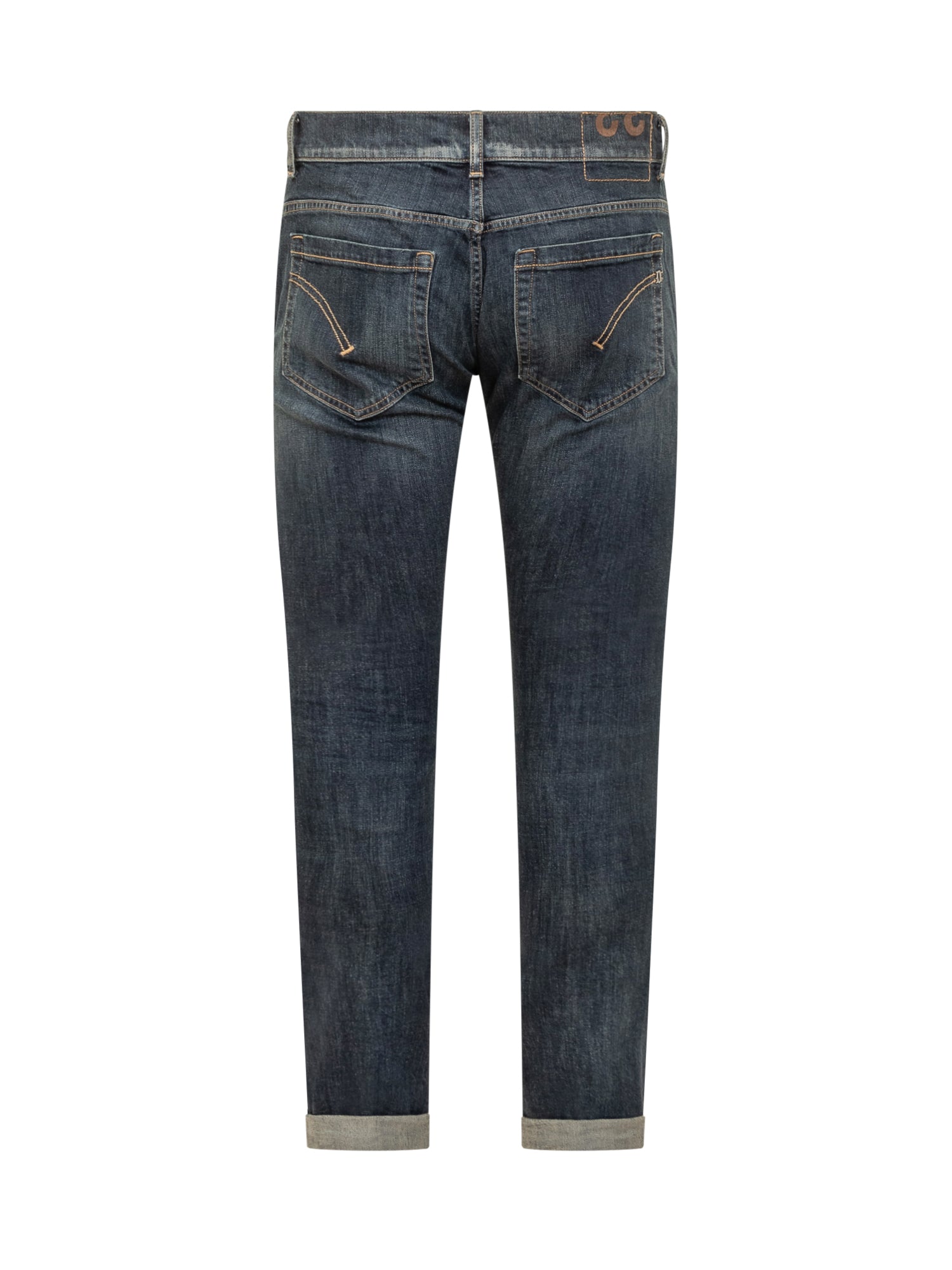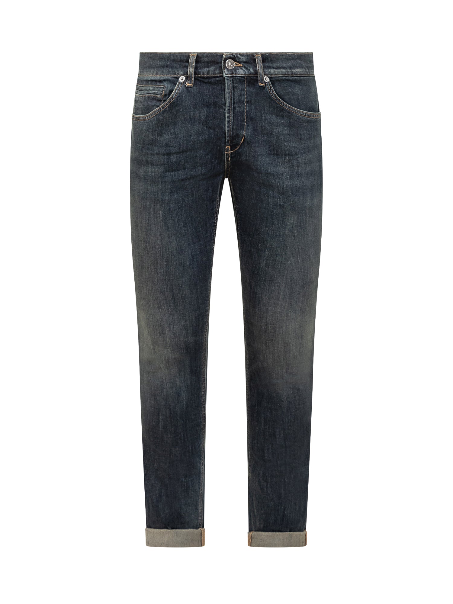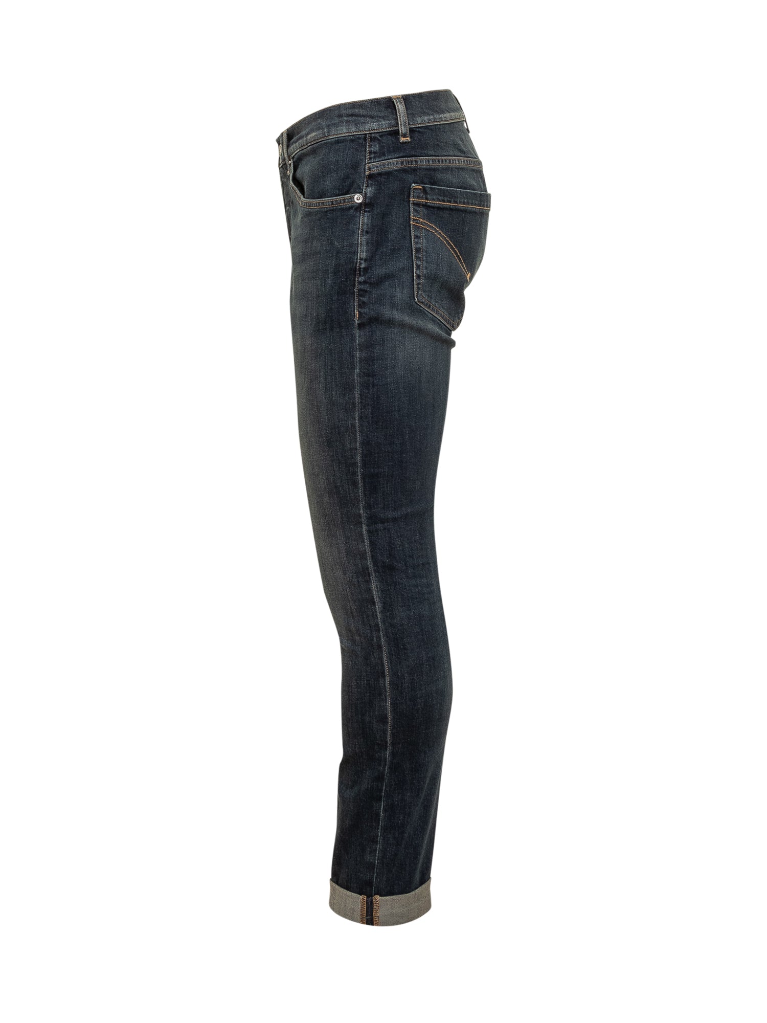 Jeans Dondup modello George in denim blu slavato. Taglio slim con fondo risvoltato, cinque tasche e chiusura con bottone e zip.