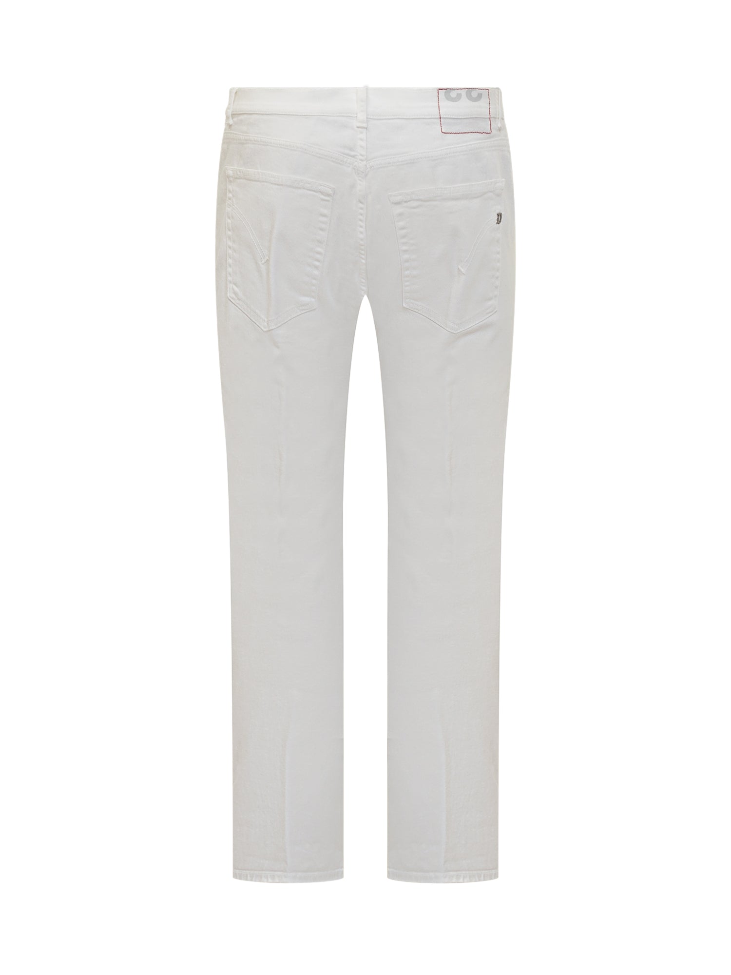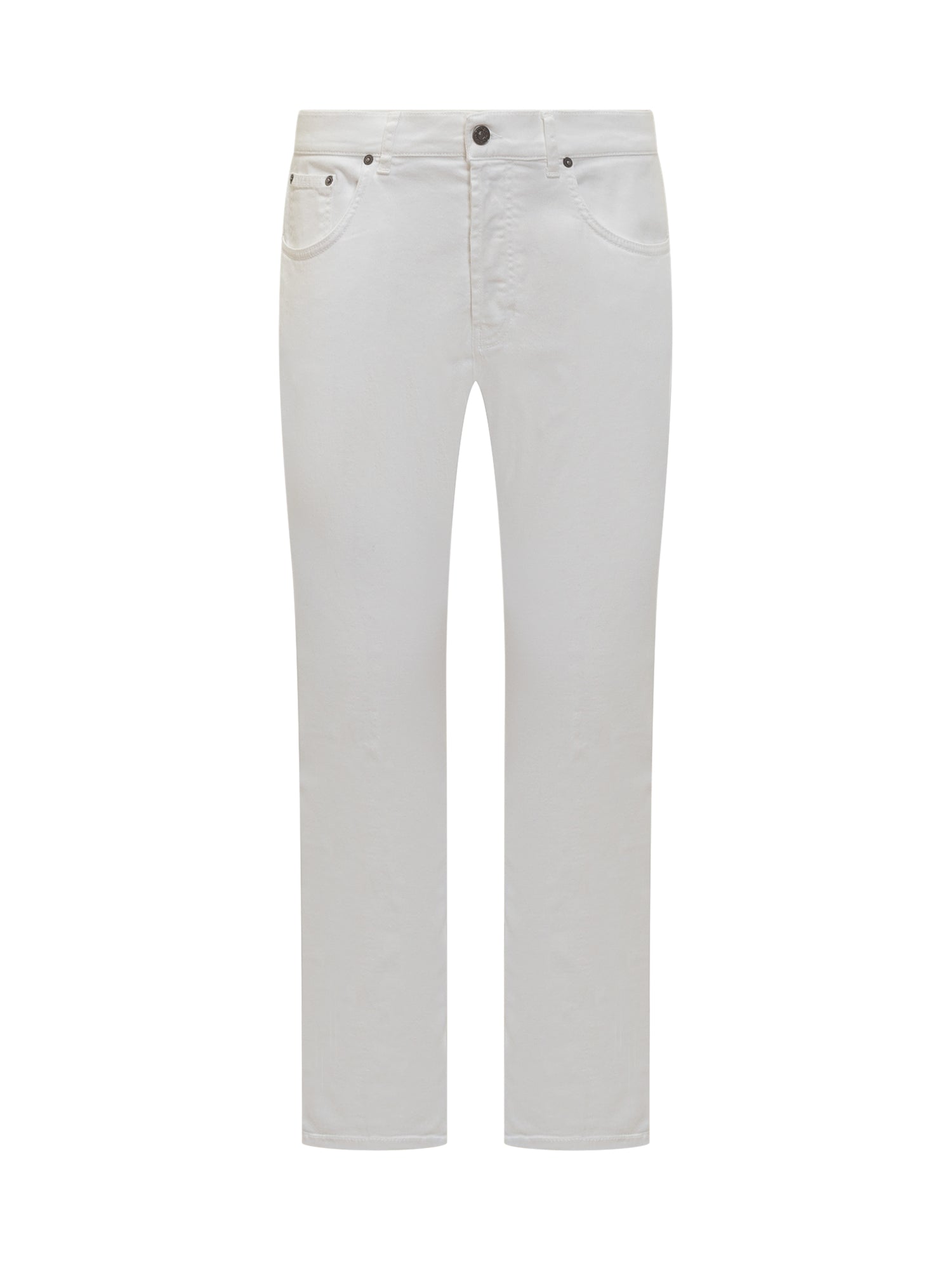 Pantaloni bianchi in denim. Cinque tasche. Passanti per cintura. Chiusura con bottoni.