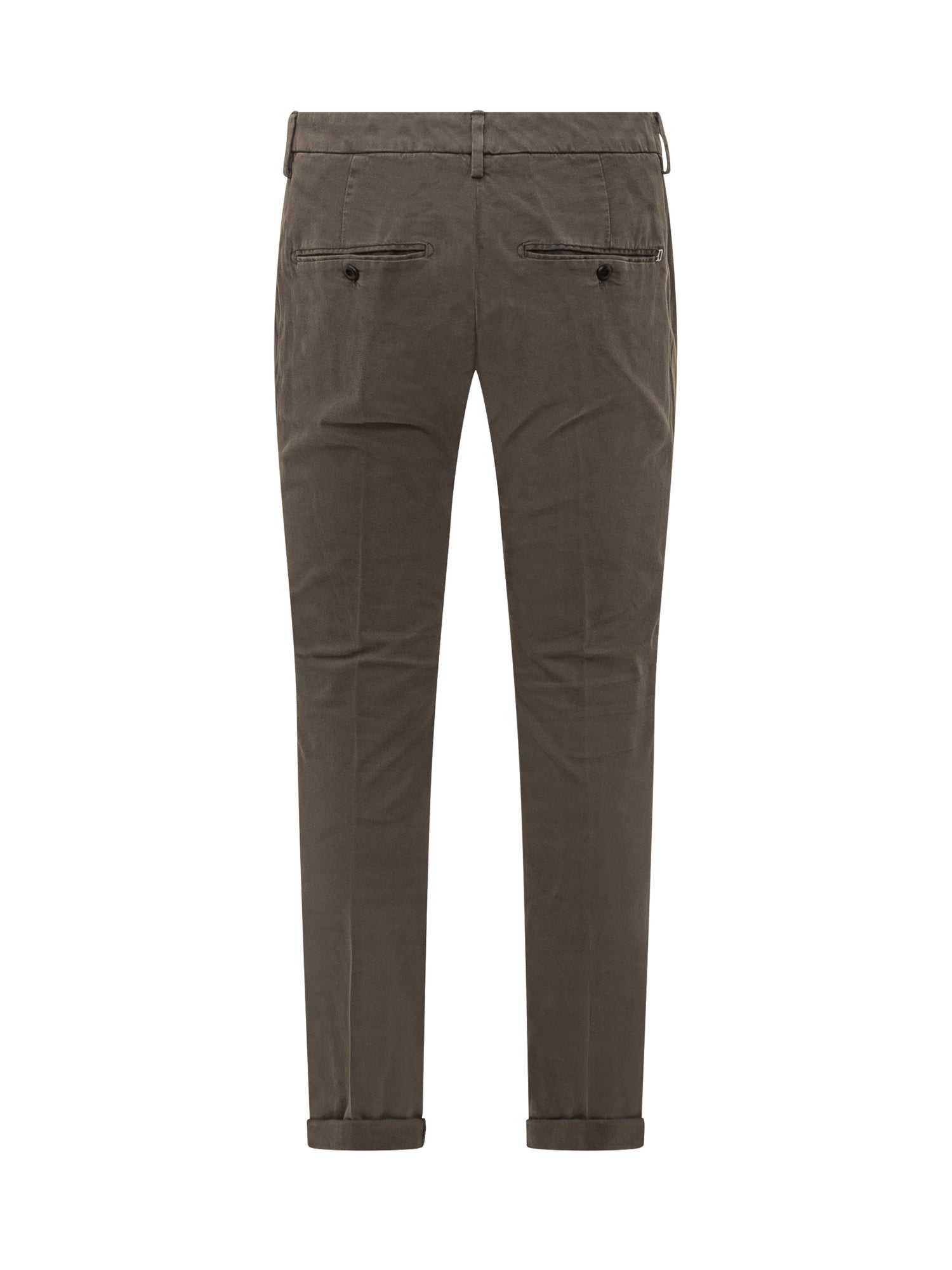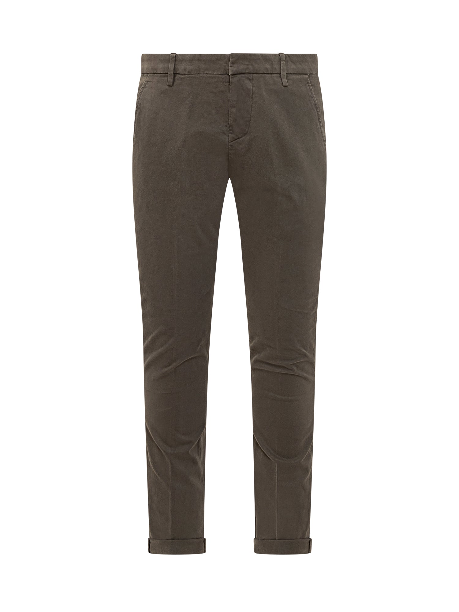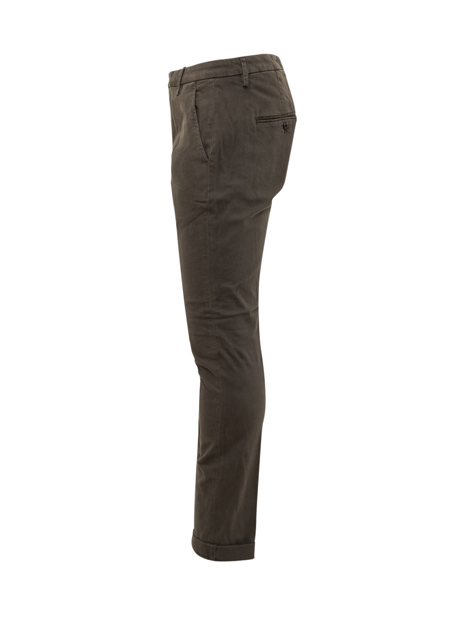 Pantaloni Dondup modello Gaubert in velluto stretch color verde oliva scuro. Vestibilità slim con risvolto al fondo e tasche posteriori a filetto con bottoni.
