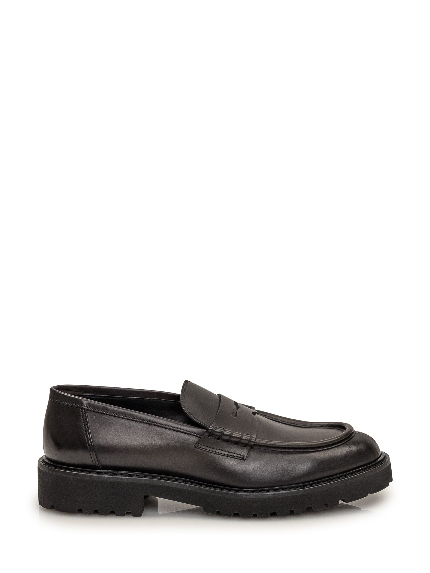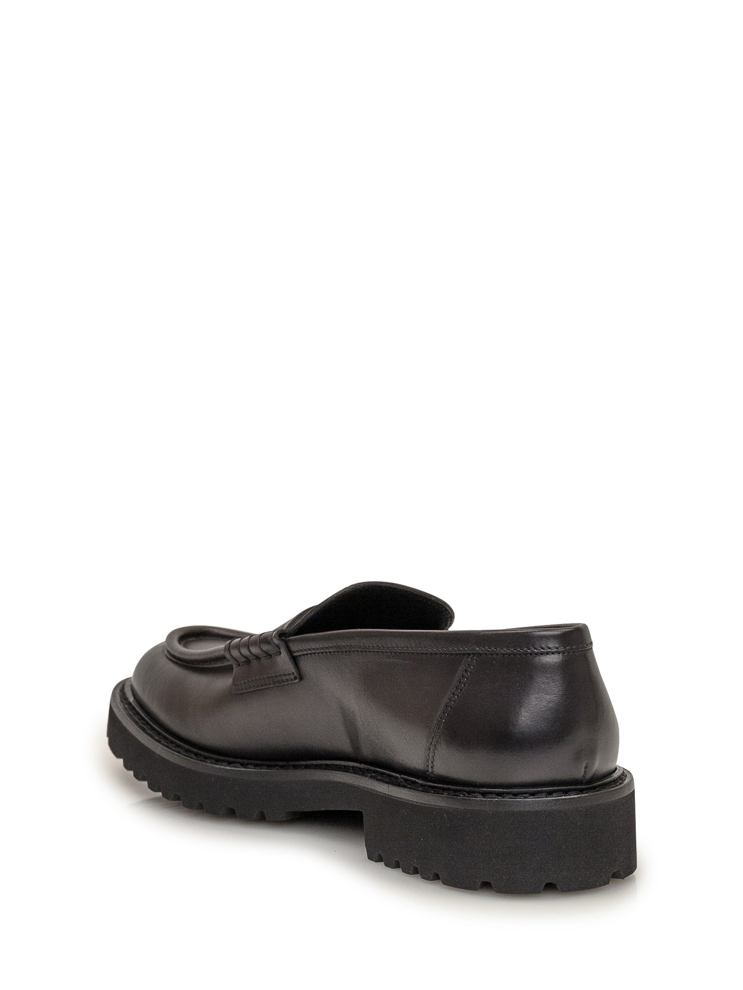 Mocassino nero bordato. Suola in gomma con tasselli. Dettaglio mascherina sul davanti.