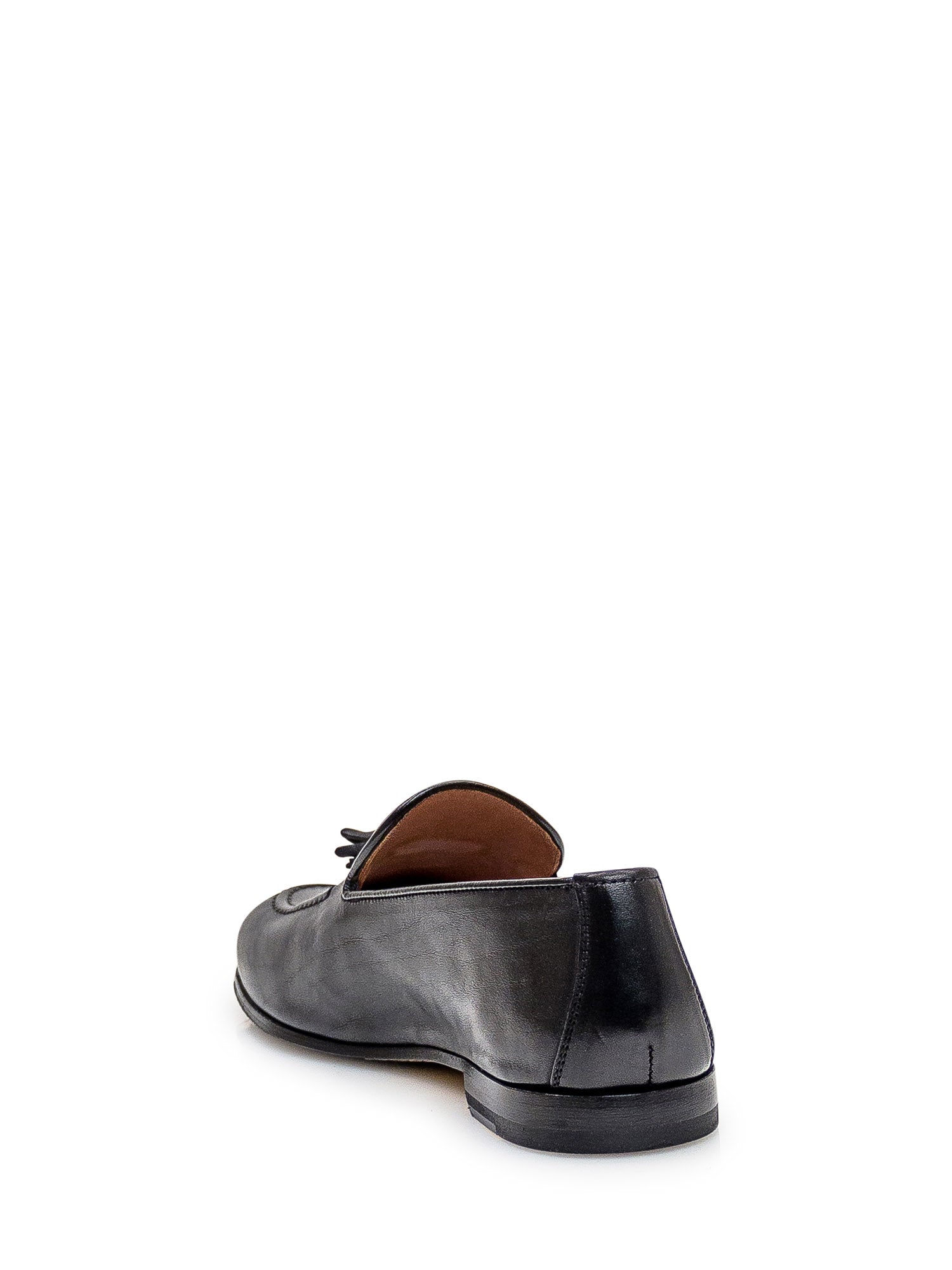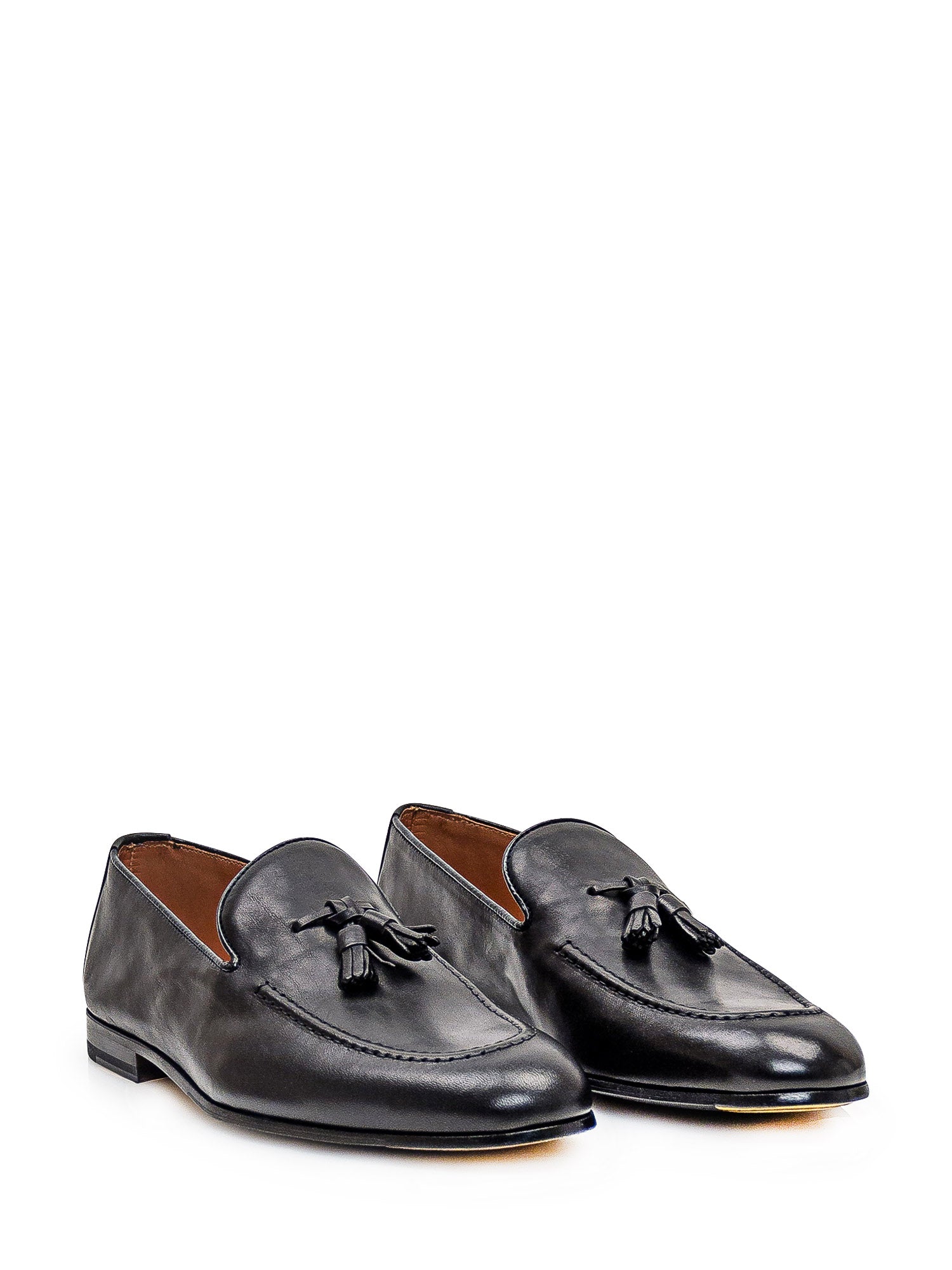 Mocassino nero in pelle. Slip.on. Dettaglio frange decorative in pelle sul davanti. Logo dorato sulla suola interna.