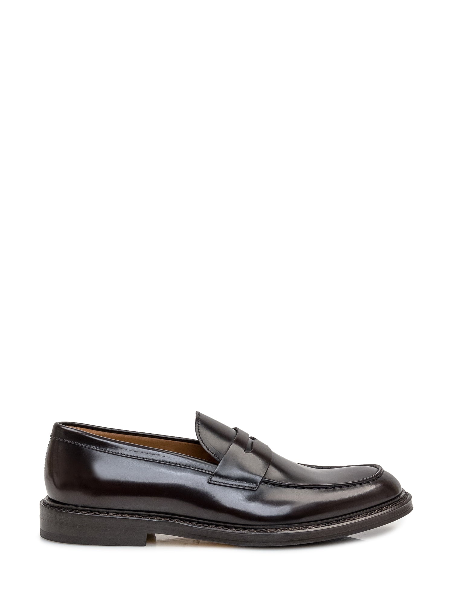 Mocassino in pelle marrone liscia. Cuciture a vaschetta. Costruzione mezzo sacchetto con suola in cuoio.