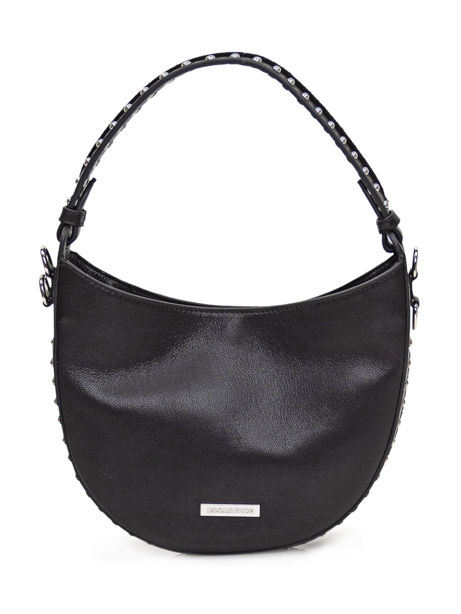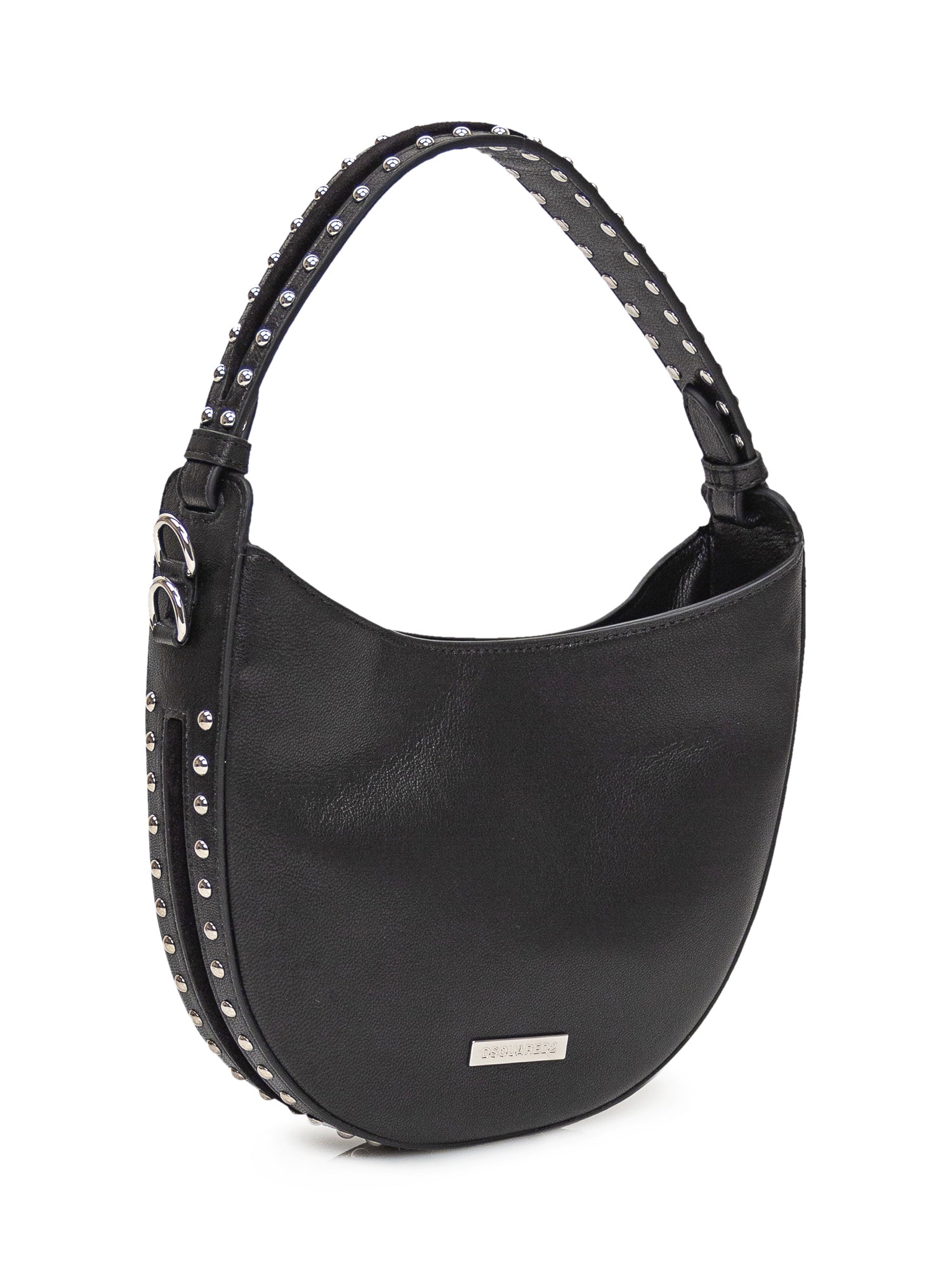 Borsa a mano nera. Tracolla removibile. Borchie ai lati. Logo in metallo sul davanti.