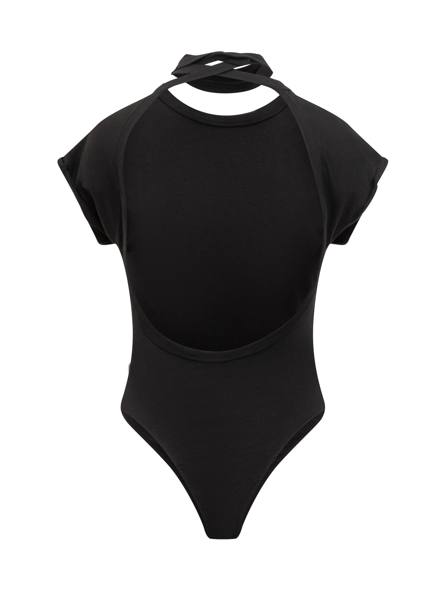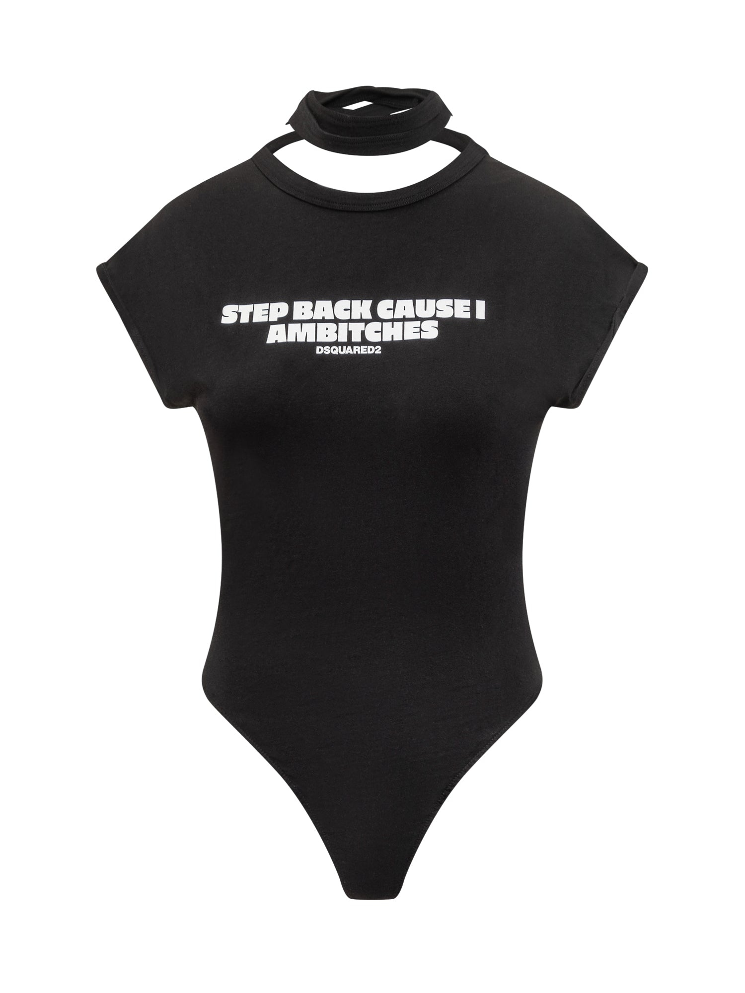 Body Dsquared2 nero in cotone elasticizzato con stampa grafica frontale e laccio allacciato al collo.