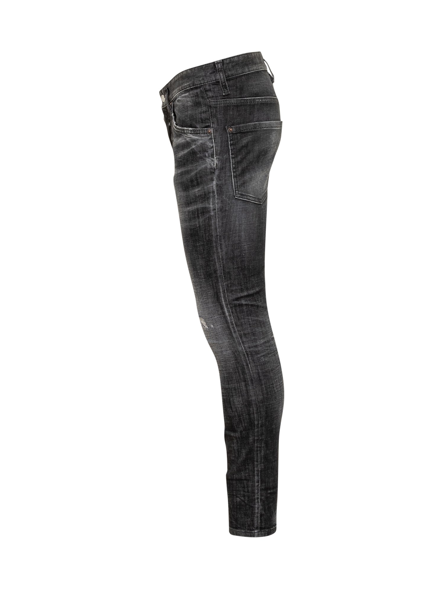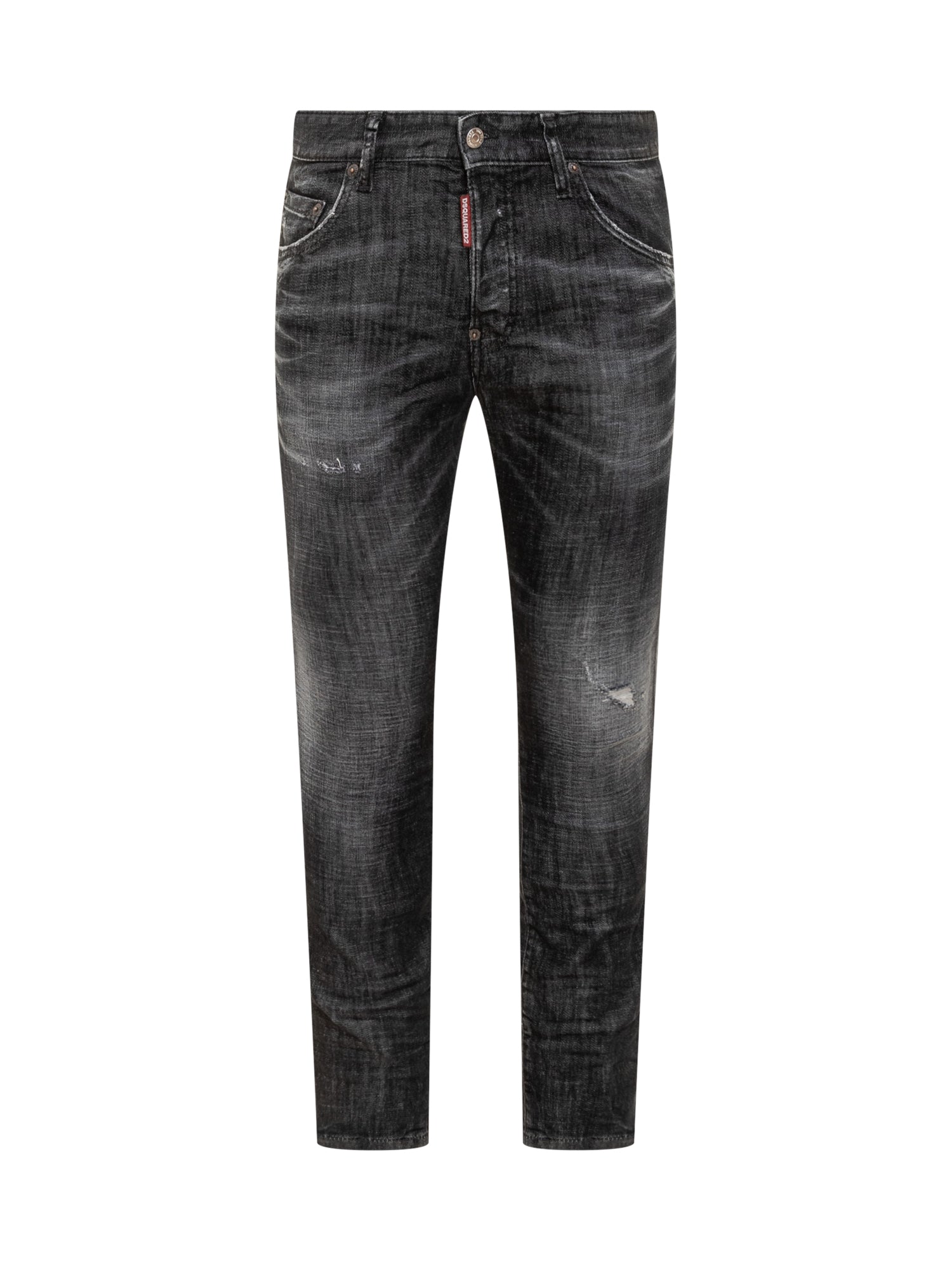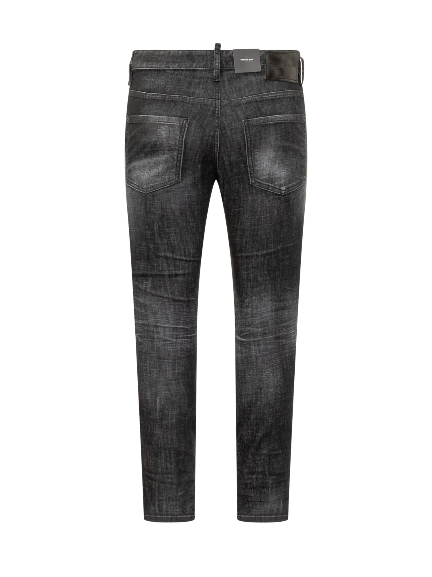Jeans Dsquared2 modello Skater in denim nero effetto used con dettagli distressed. Fit slim con vita media, etichetta rossa iconica sul taschino e chiusura a bottone.