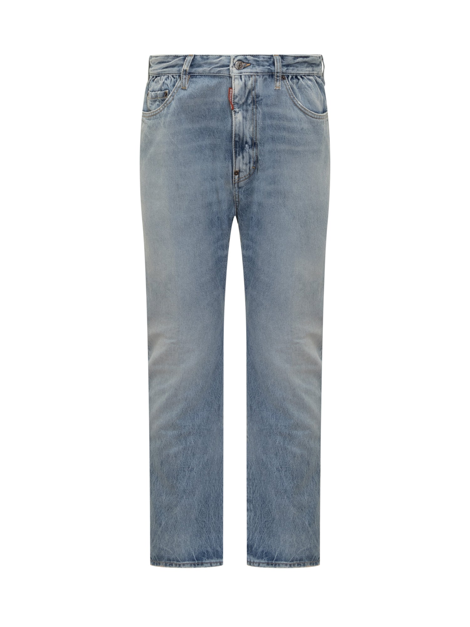 Jeans Dsquared2 London da uomo in denim chiaro effetto vintage. Vestibilità regolare, chiusura con bottoni, etichetta rossa iconica sul davanti.